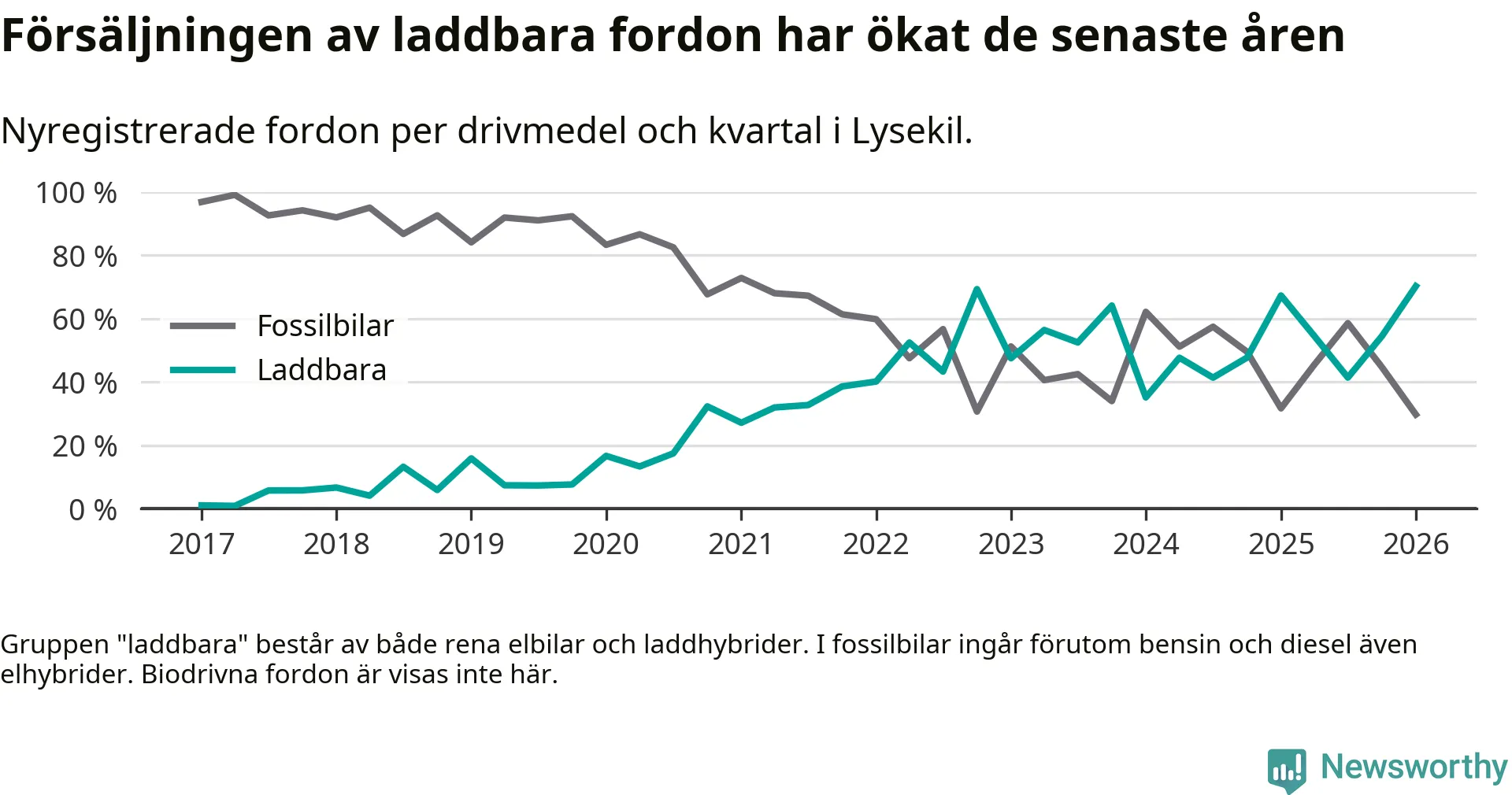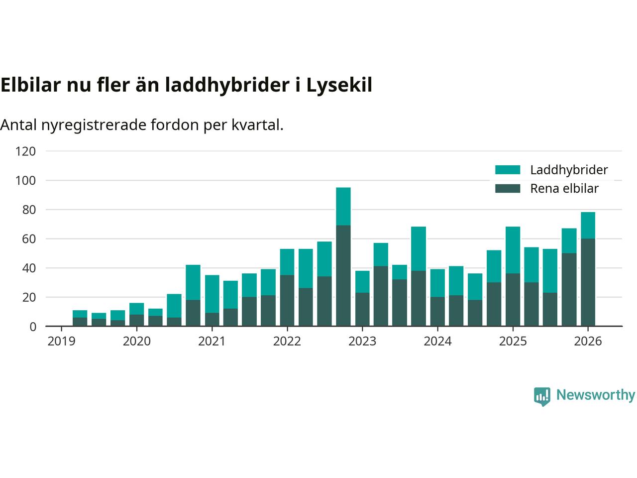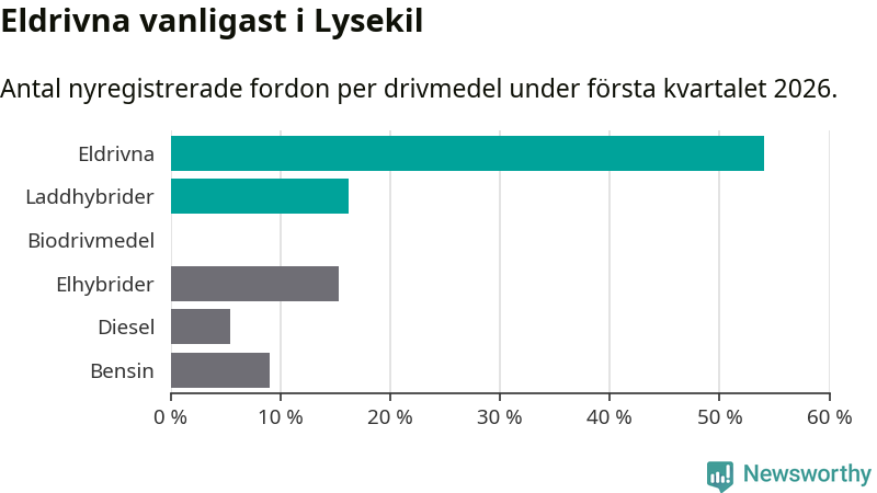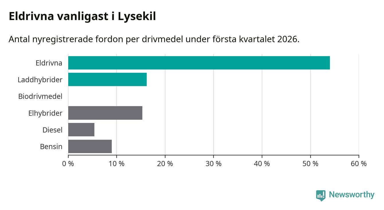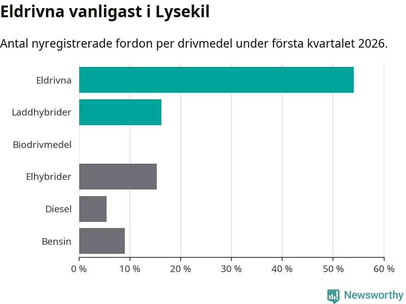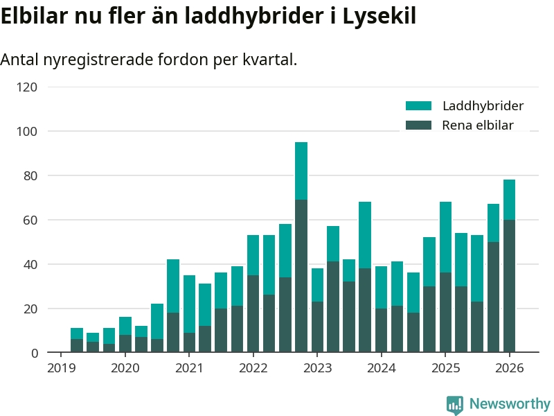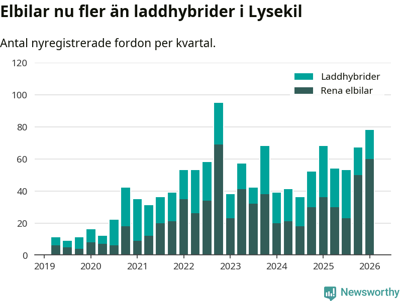 Under första kvartalet 2026 var 70 procent av alla nyregistrerade personbilar i Lysekil laddbara (sammanlagt registrerades 111 nya bilar). Merparten av de laddbara bilarna var rena elbilar (54 procent av alla).