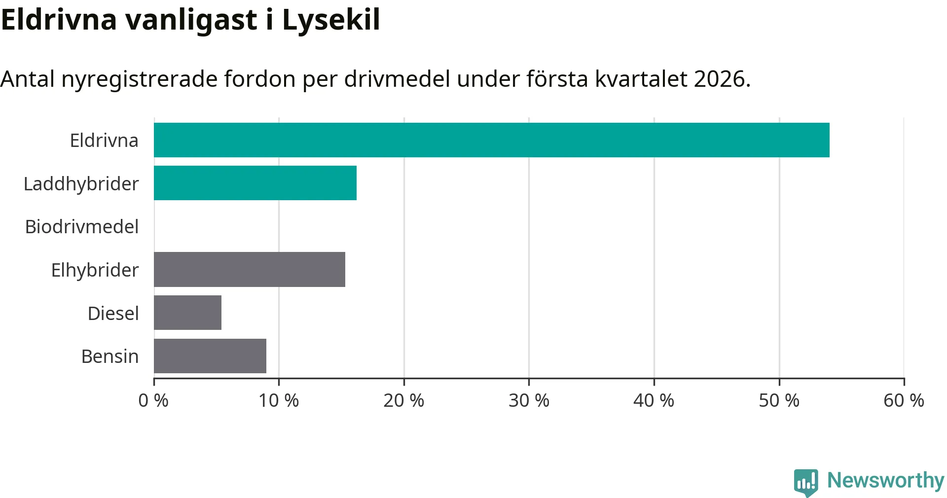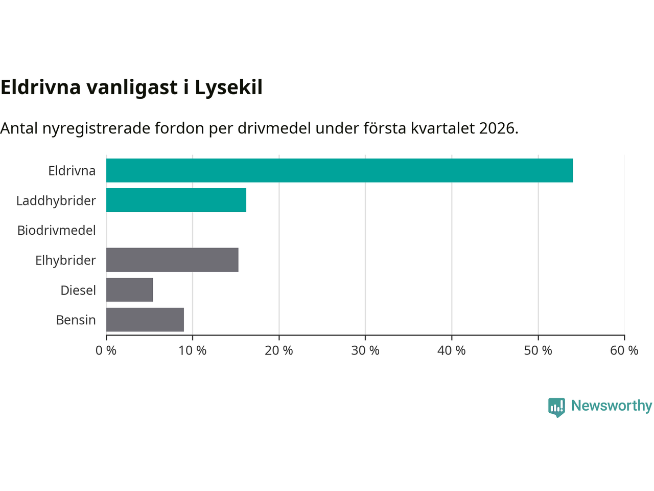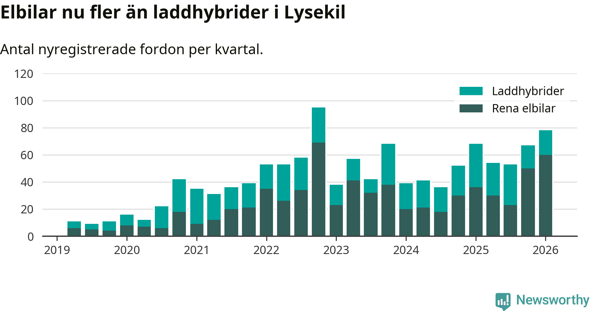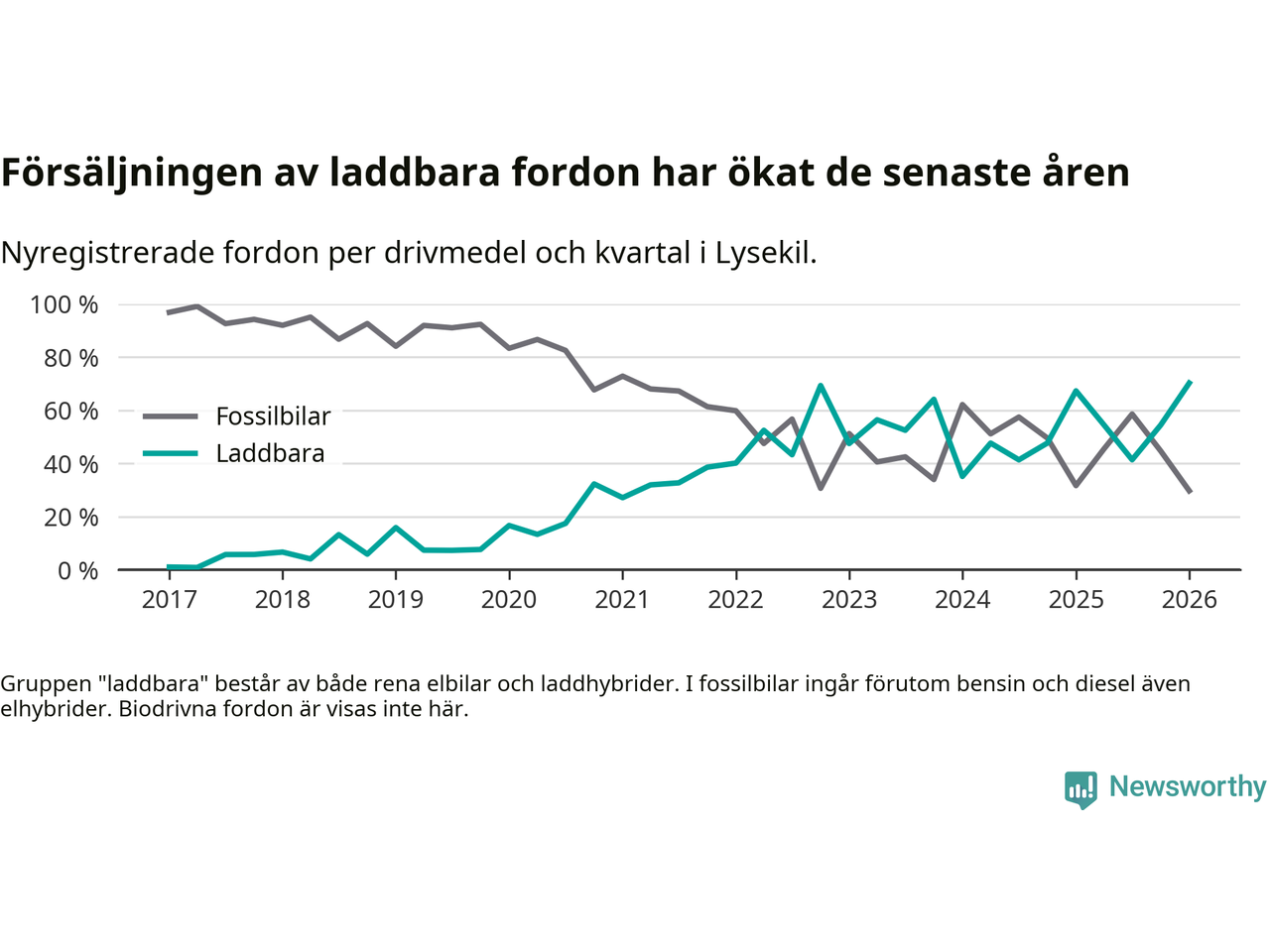 Under första kvartalet 2026 var 70 procent av alla nyregistrerade personbilar i Lysekil laddbara (sammanlagt registrerades 111 nya bilar). Merparten av de laddbara bilarna var rena elbilar (54 procent av alla).