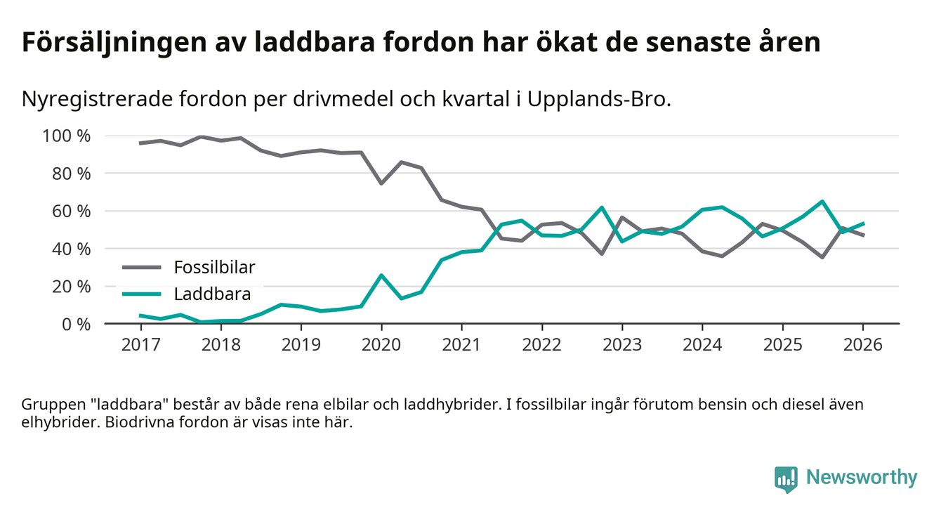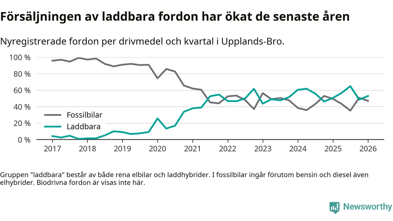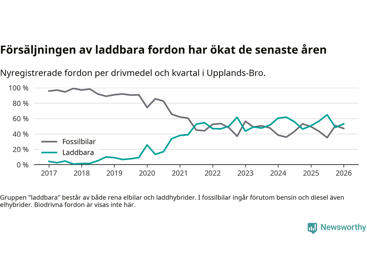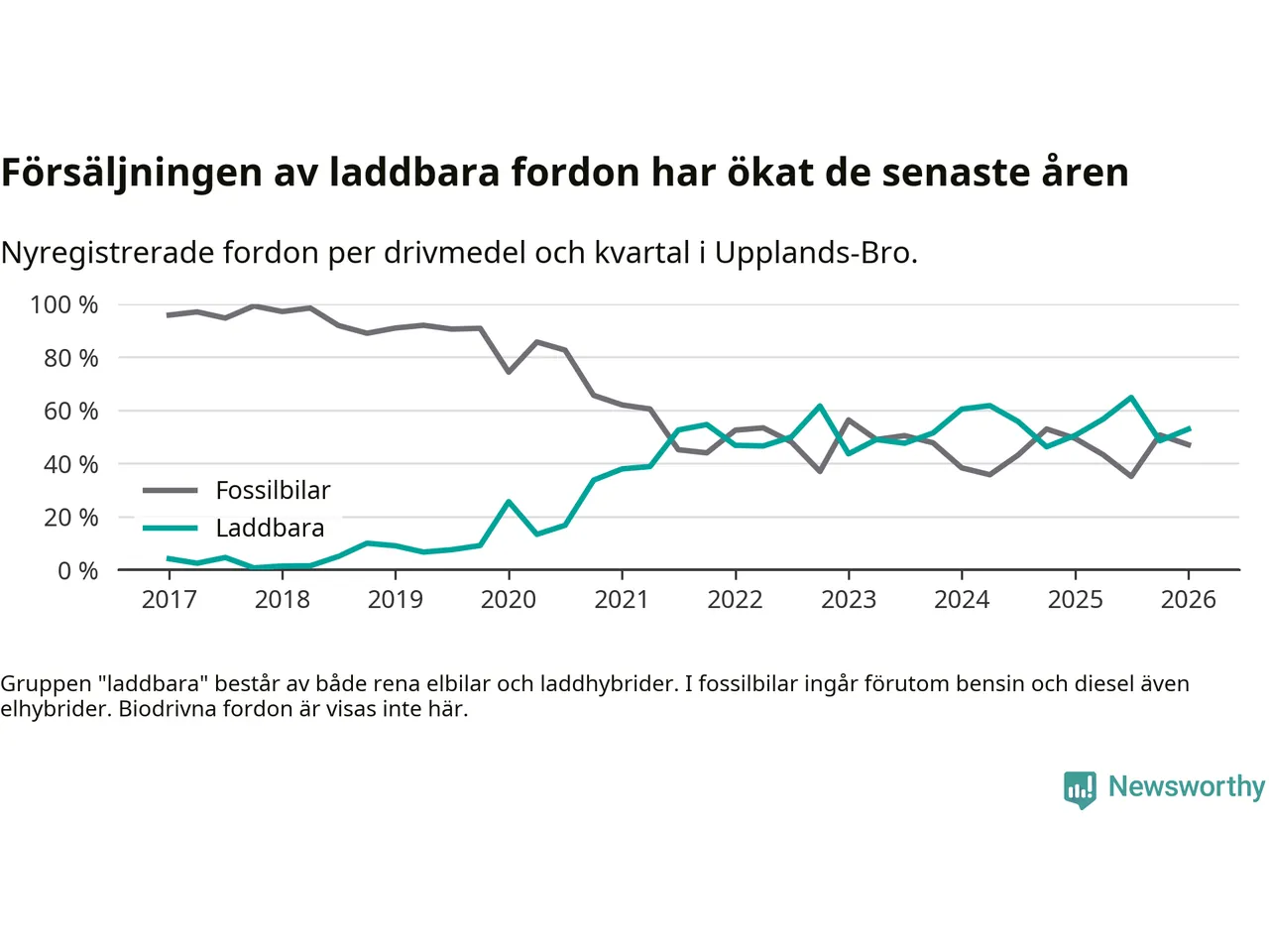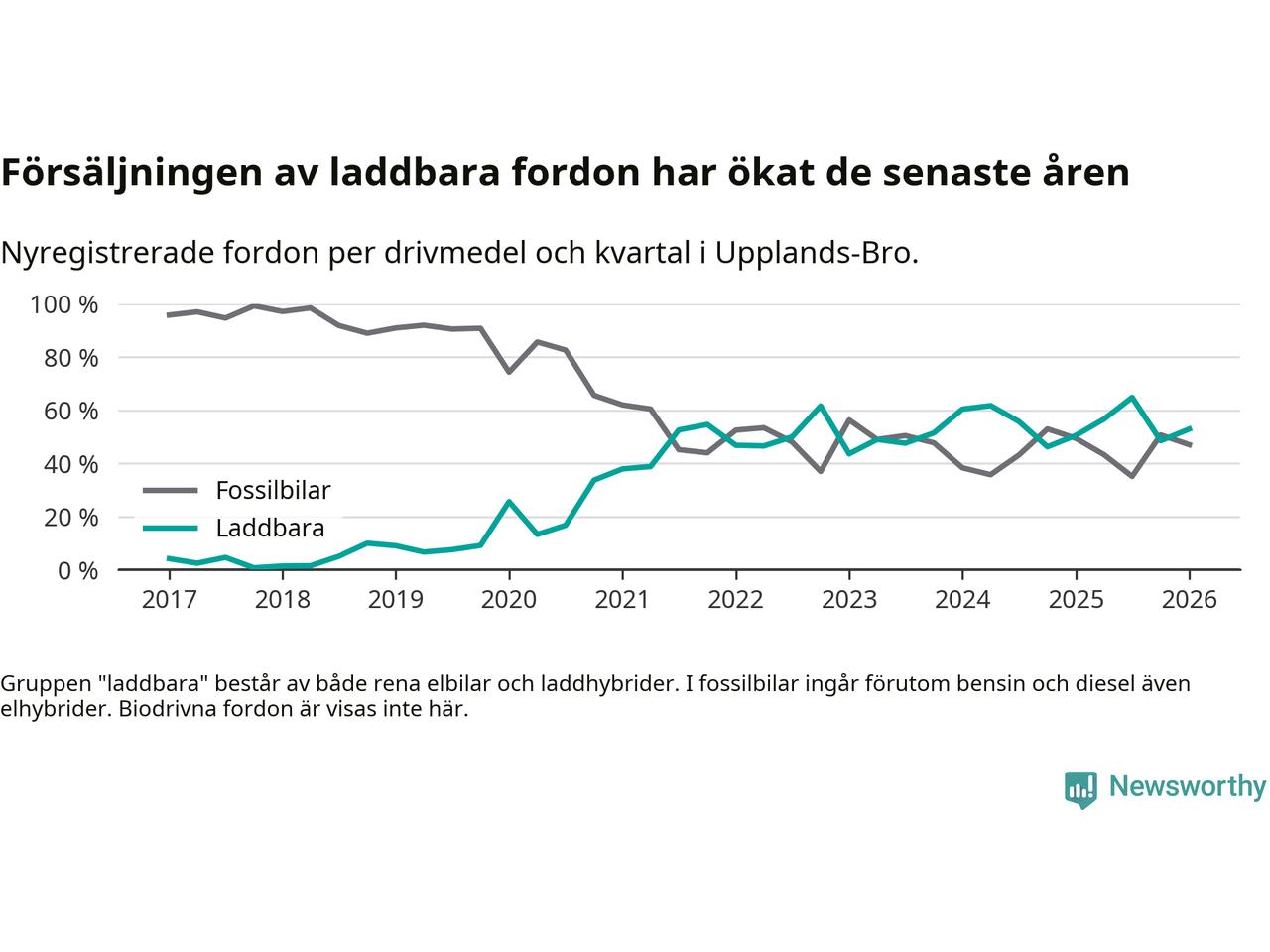 Under första kvartalet 2026 var 53 procent av alla nyregistrerade personbilar i Upplands-Bro laddbara (sammanlagt registrerades 102 nya bilar). Merparten av de laddbara bilarna var rena elbilar (32 procent av alla).