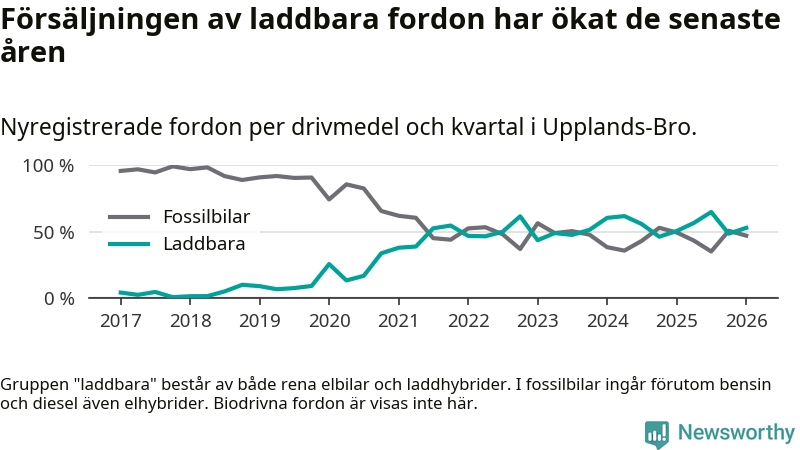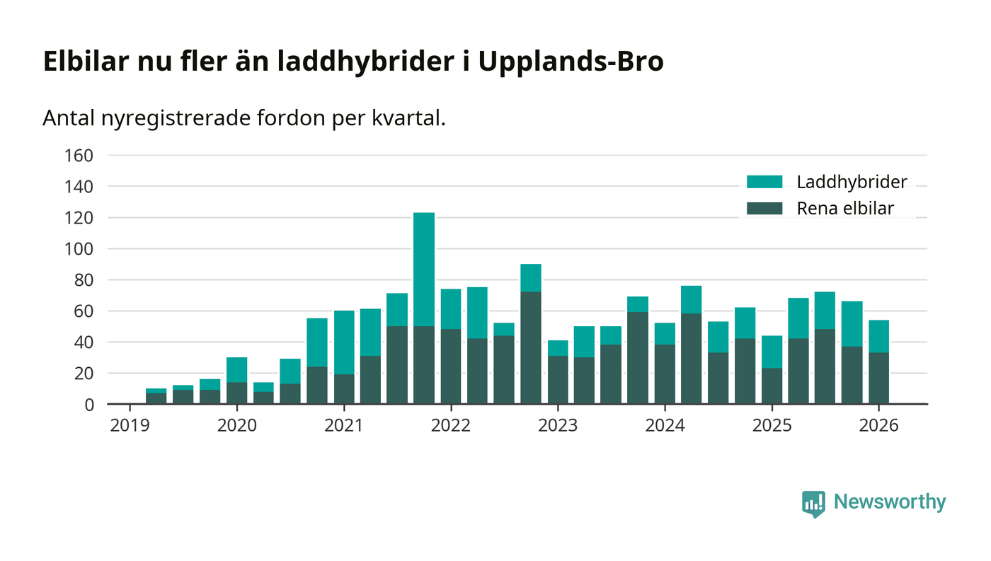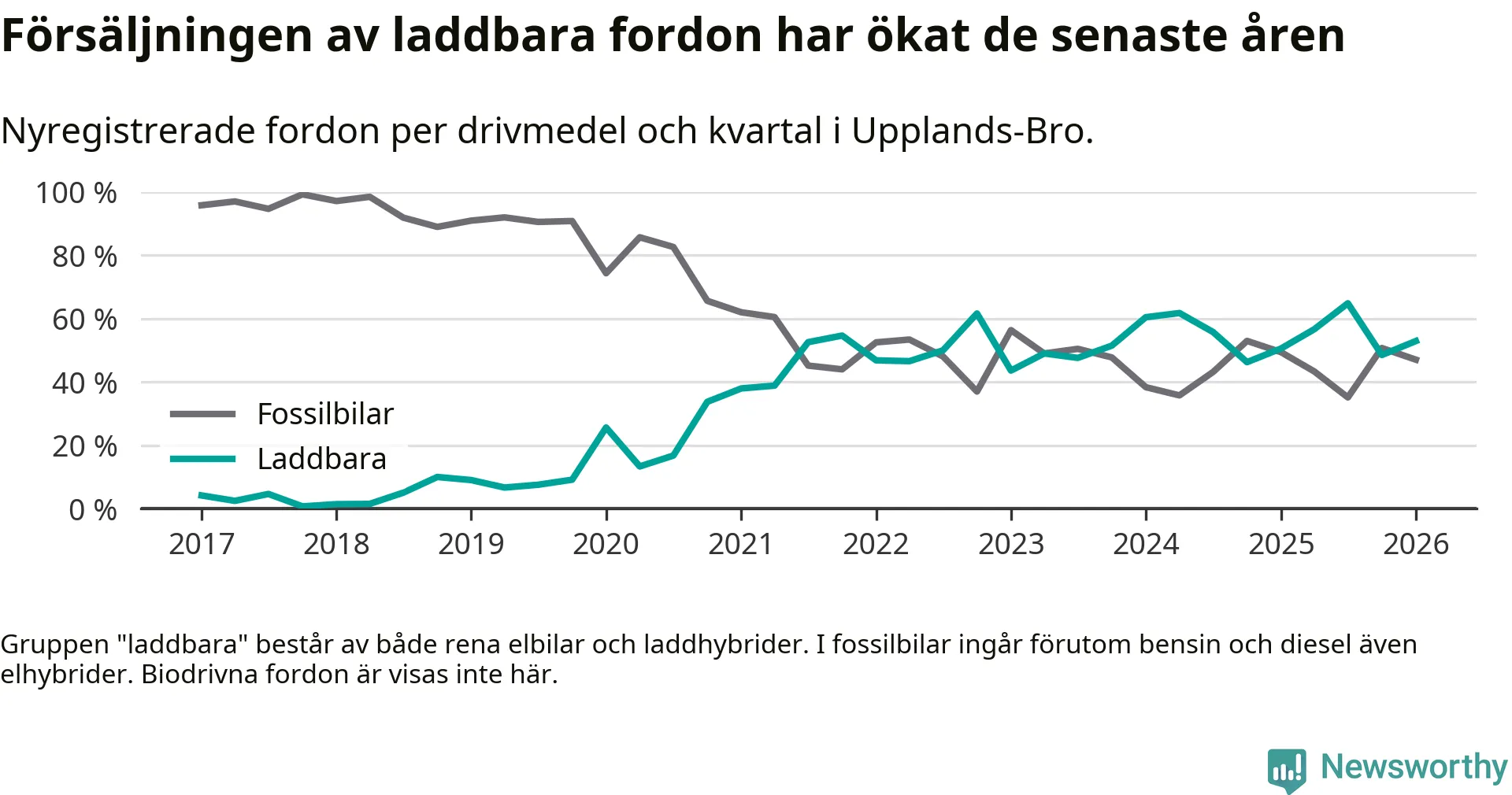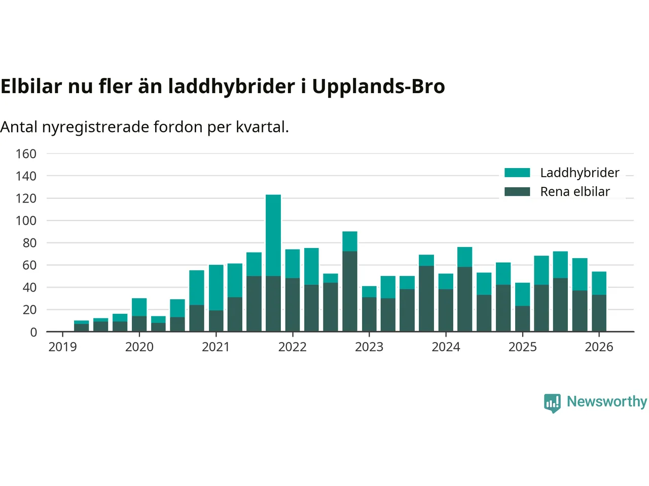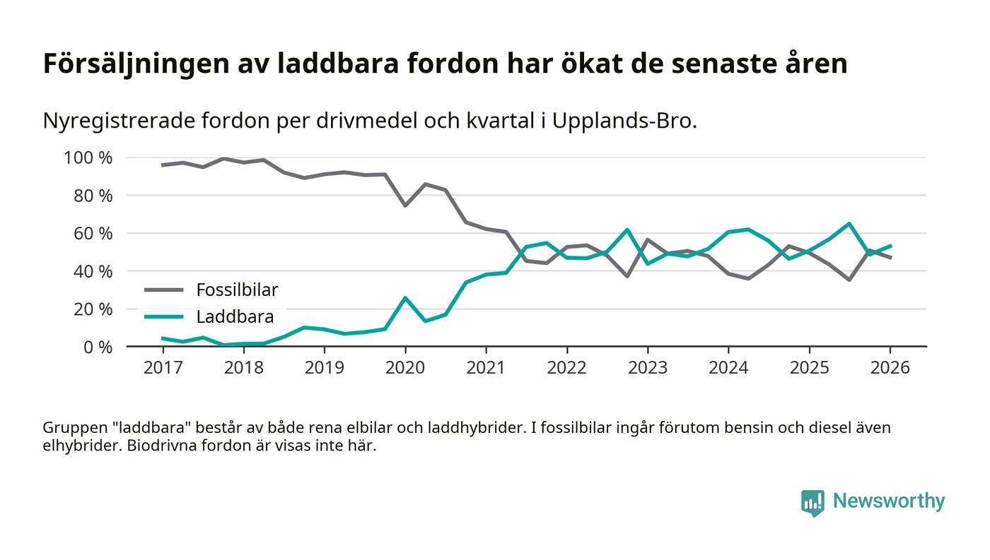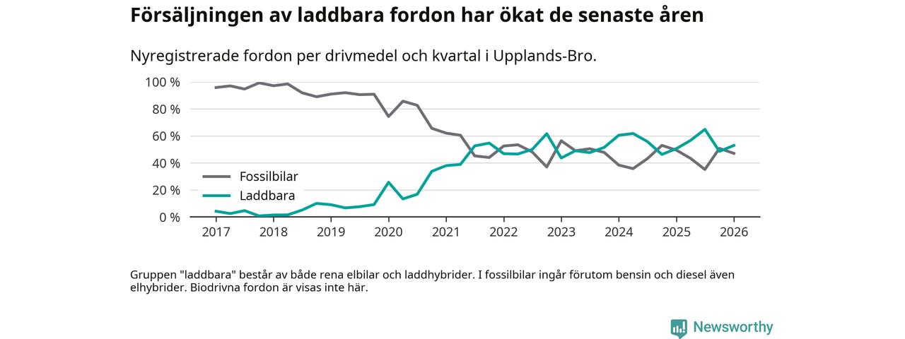 Under första kvartalet 2026 var 53 procent av alla nyregistrerade personbilar i Upplands-Bro laddbara (sammanlagt registrerades 102 nya bilar). Merparten av de laddbara bilarna var rena elbilar (32 procent av alla).