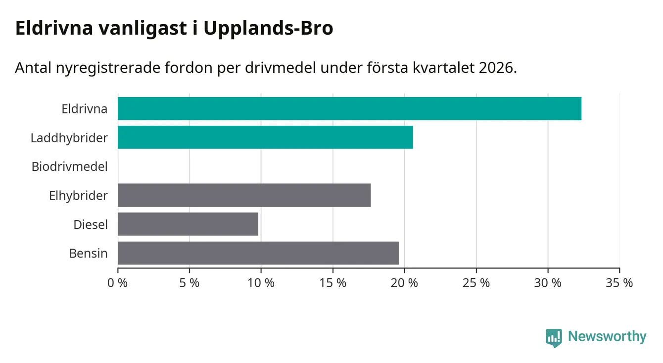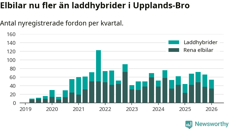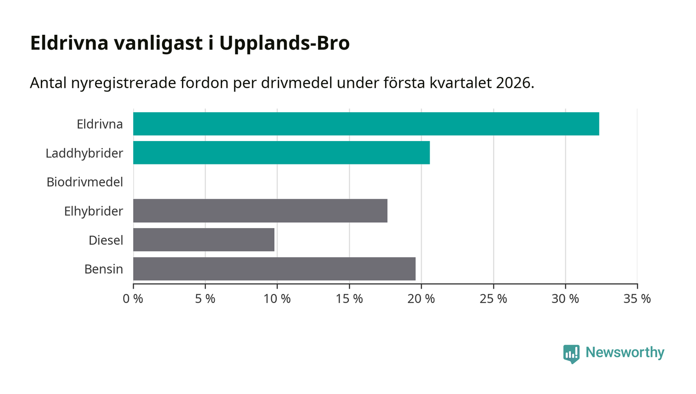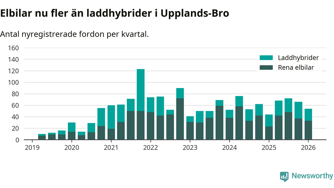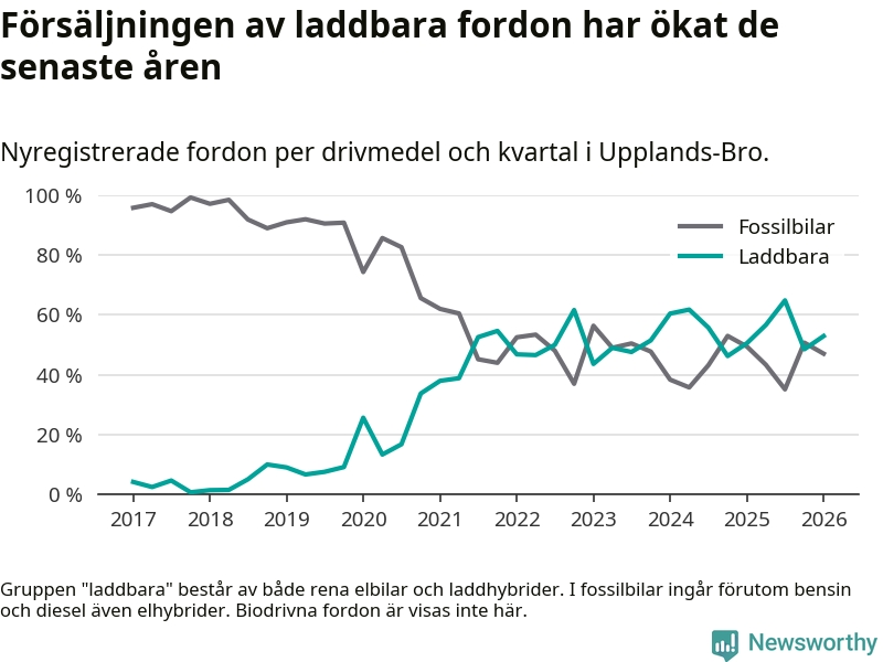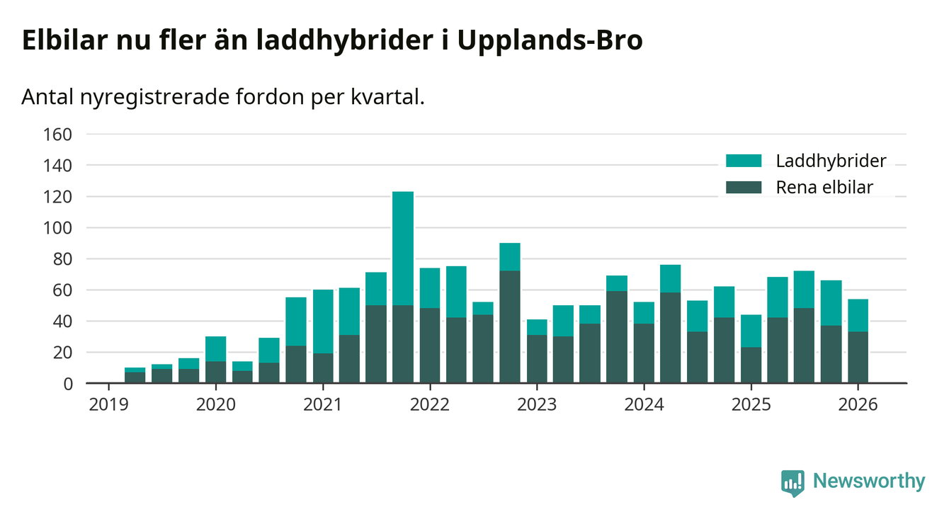Under första kvartalet 2026 var 53 procent av alla nyregistrerade personbilar i Upplands-Bro laddbara (sammanlagt registrerades 102 nya bilar). Merparten av de laddbara bilarna var rena elbilar (32 procent av alla).