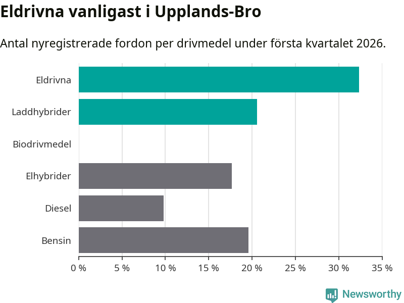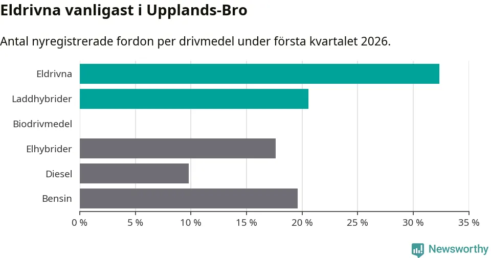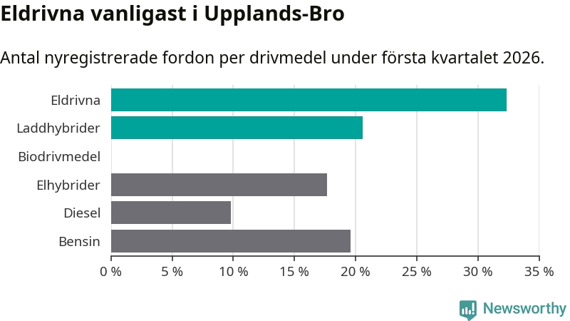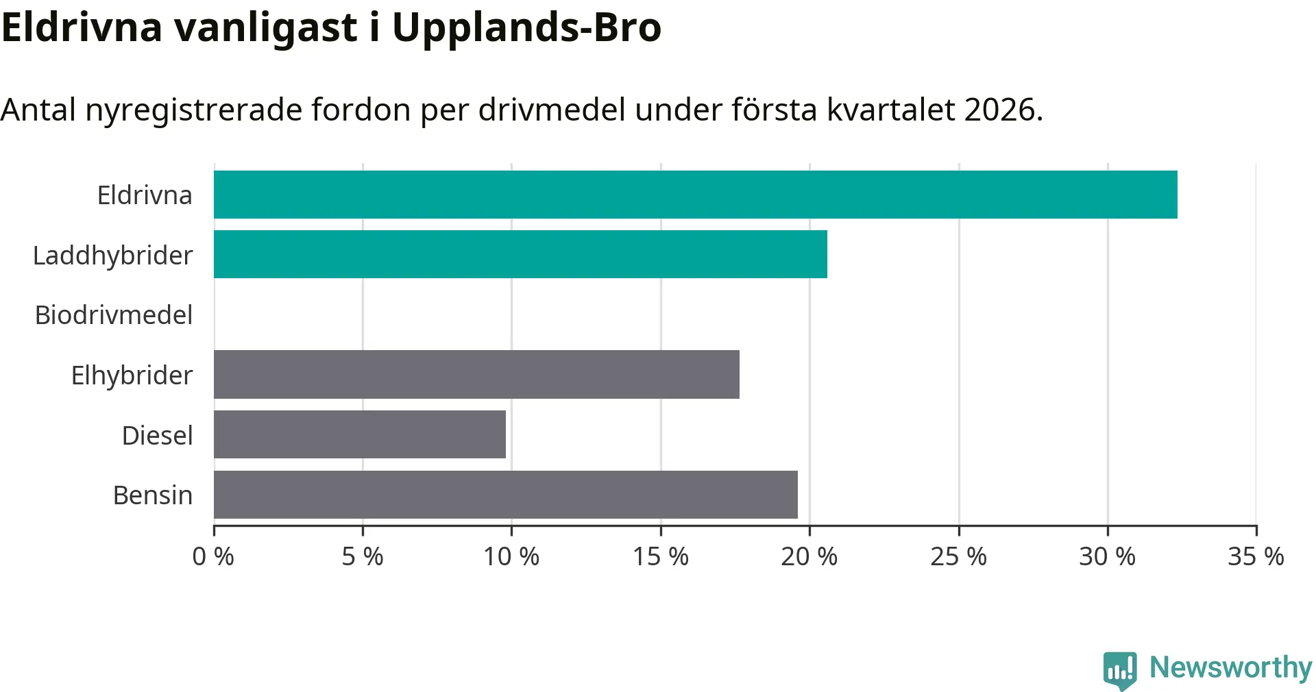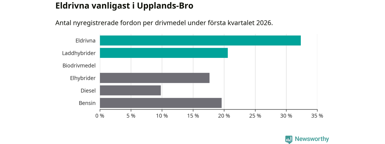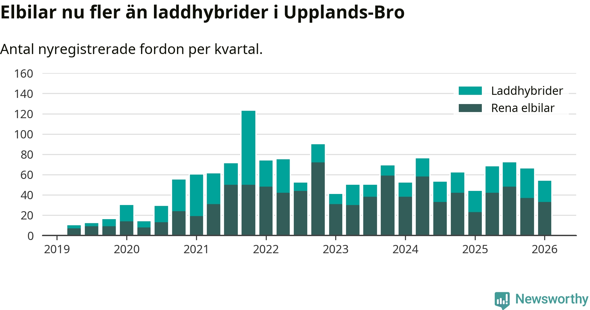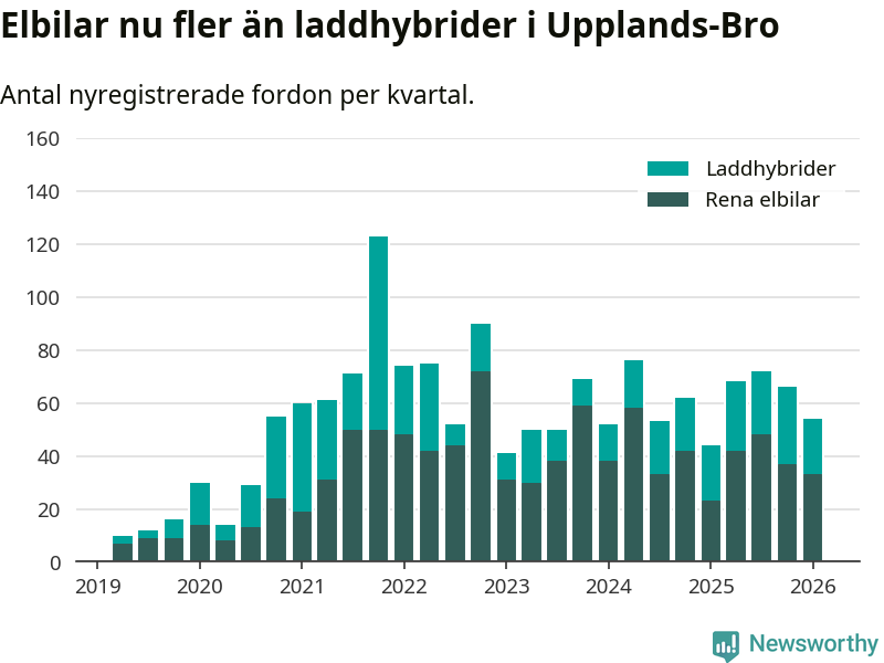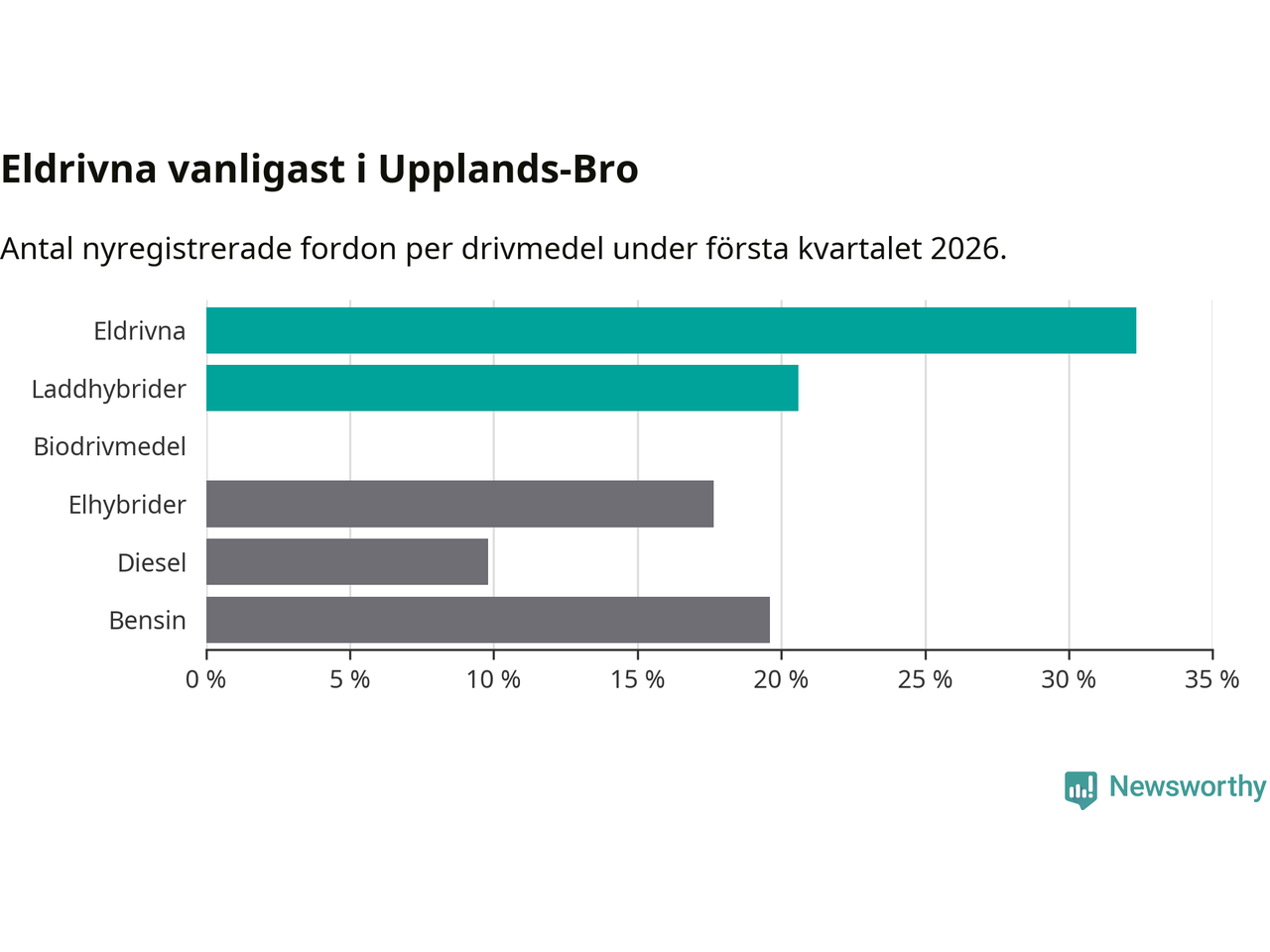 Under första kvartalet 2026 var 53 procent av alla nyregistrerade personbilar i Upplands-Bro laddbara (sammanlagt registrerades 102 nya bilar). Merparten av de laddbara bilarna var rena elbilar (32 procent av alla).