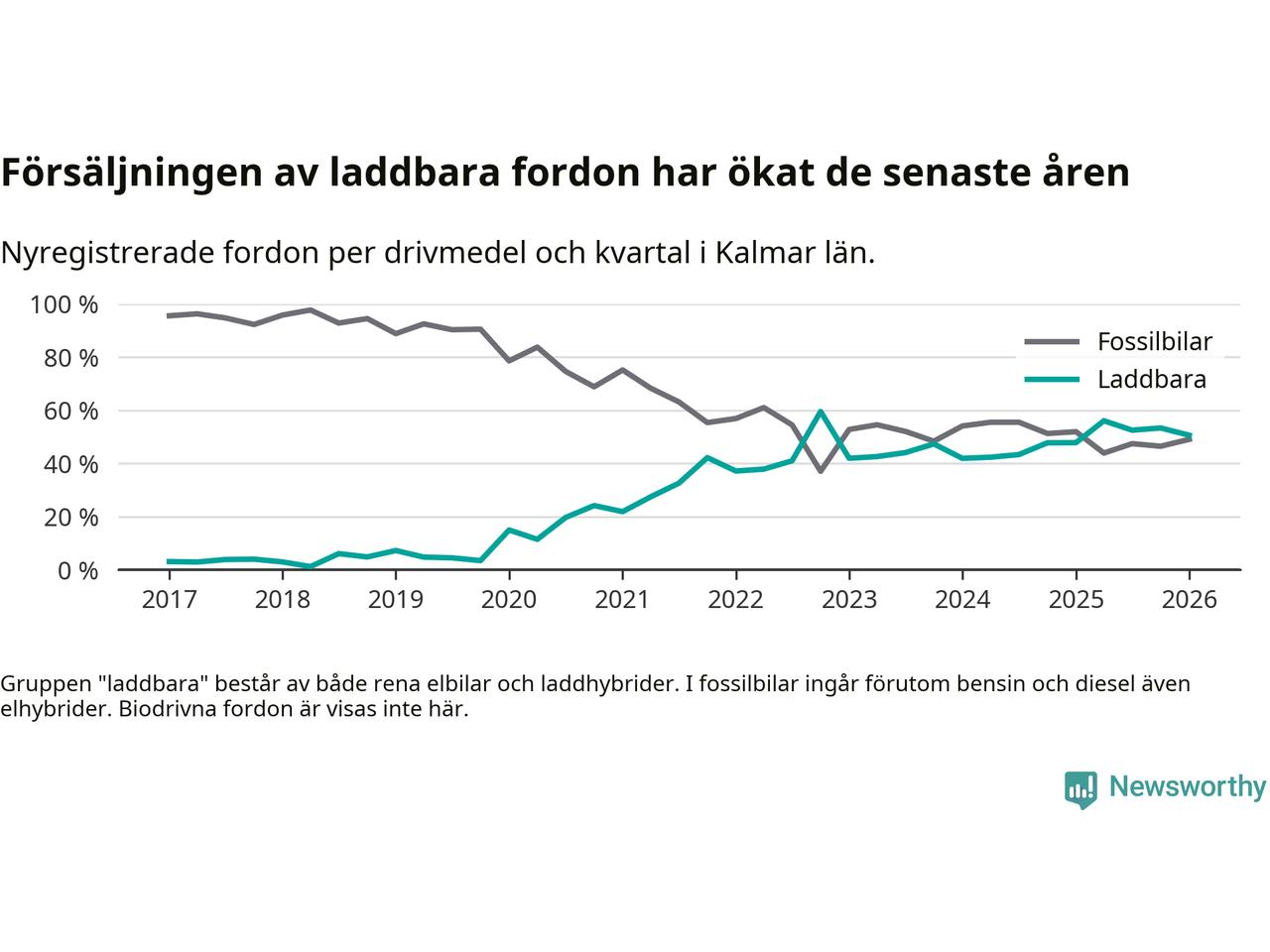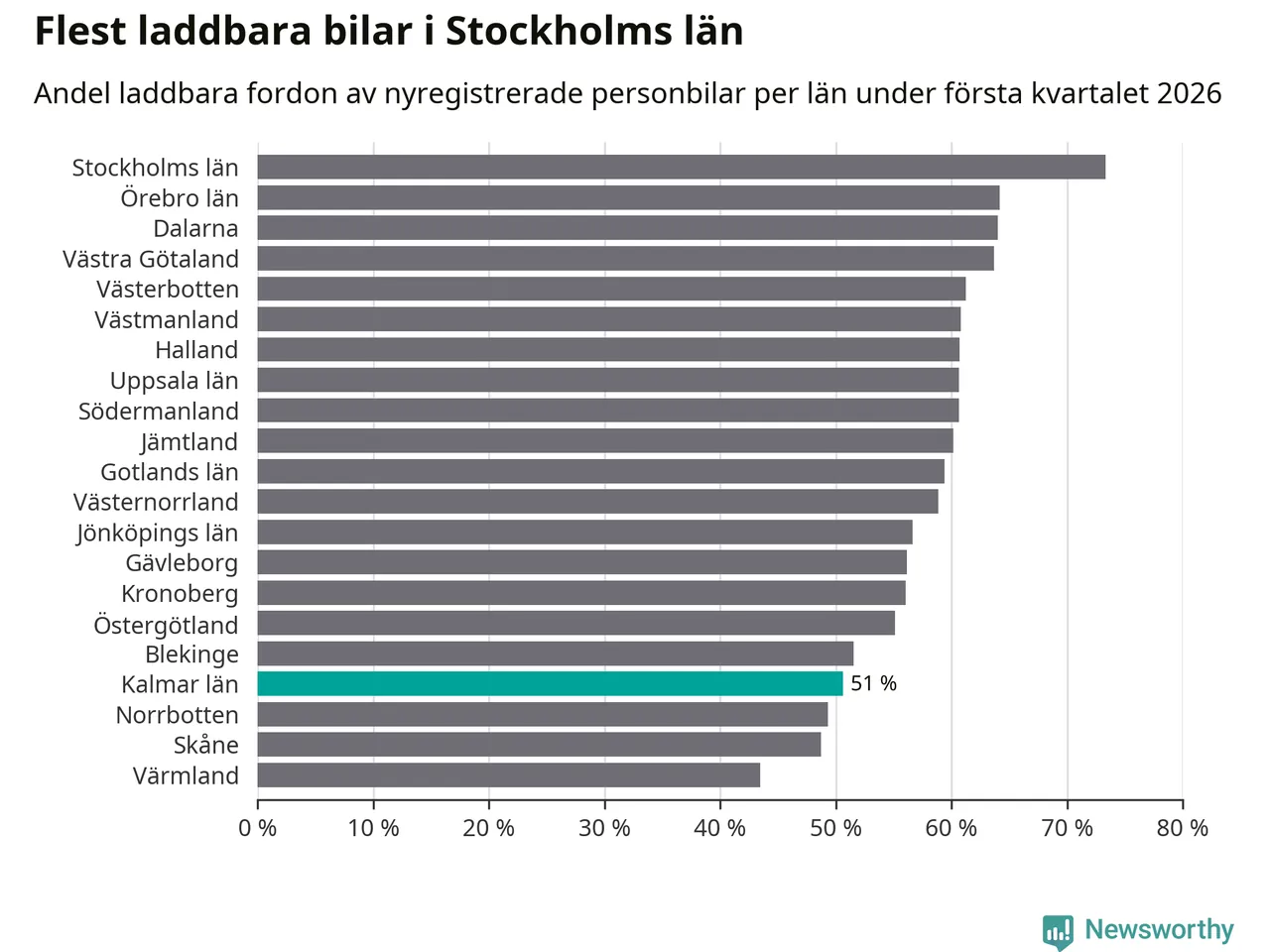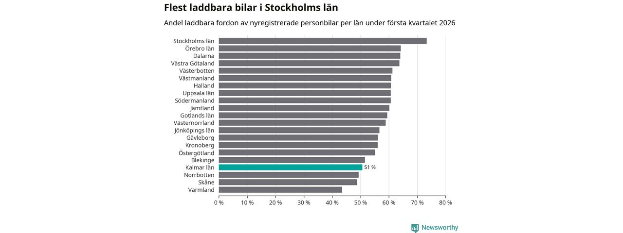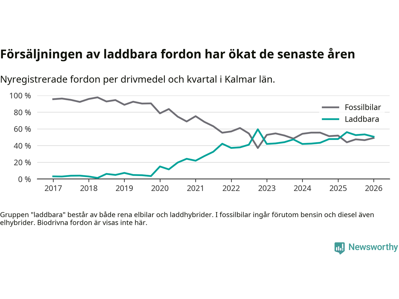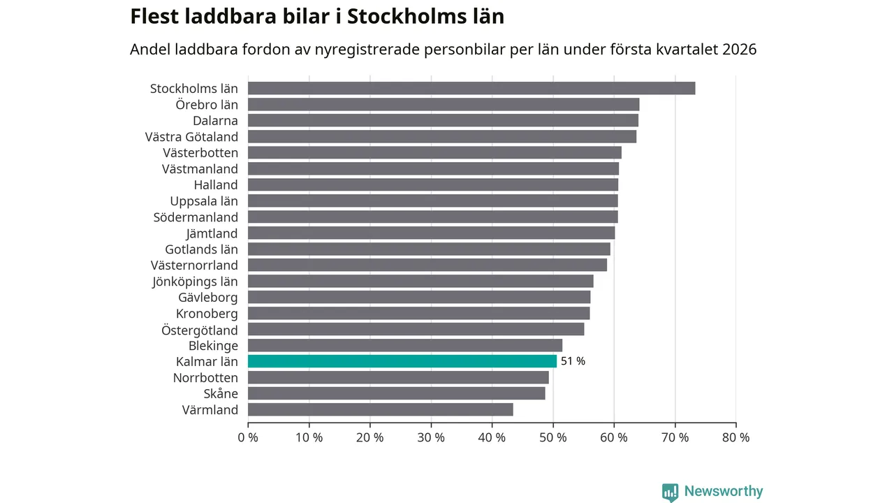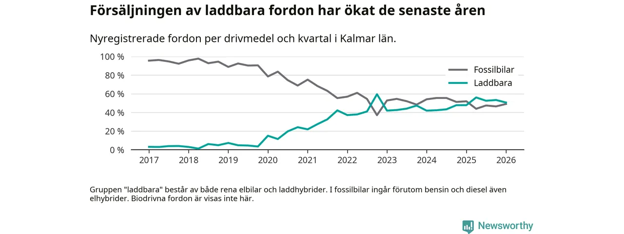 Under första kvartalet 2026 var 51 procent av alla nyregistrerade personbilar i Kalmar län laddbara (sammanlagt registrerades 1 049 nya bilar). Merparten av de laddbara bilarna var rena elbilar (29 procent av alla).