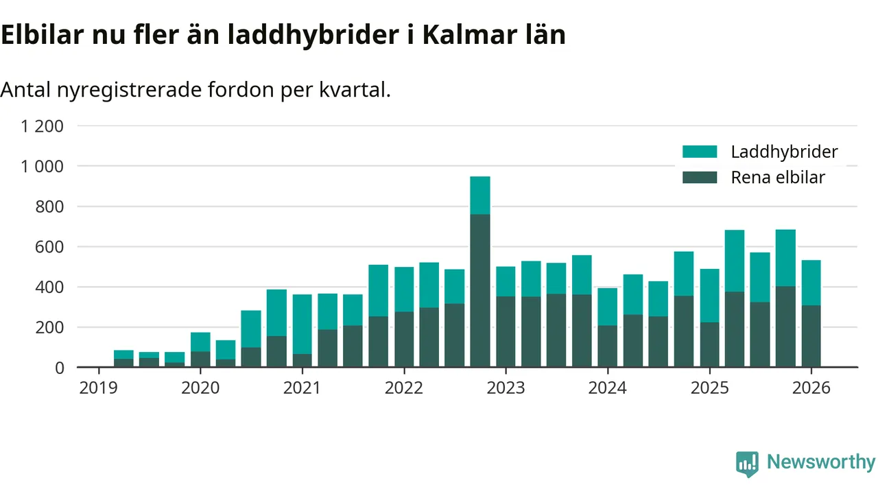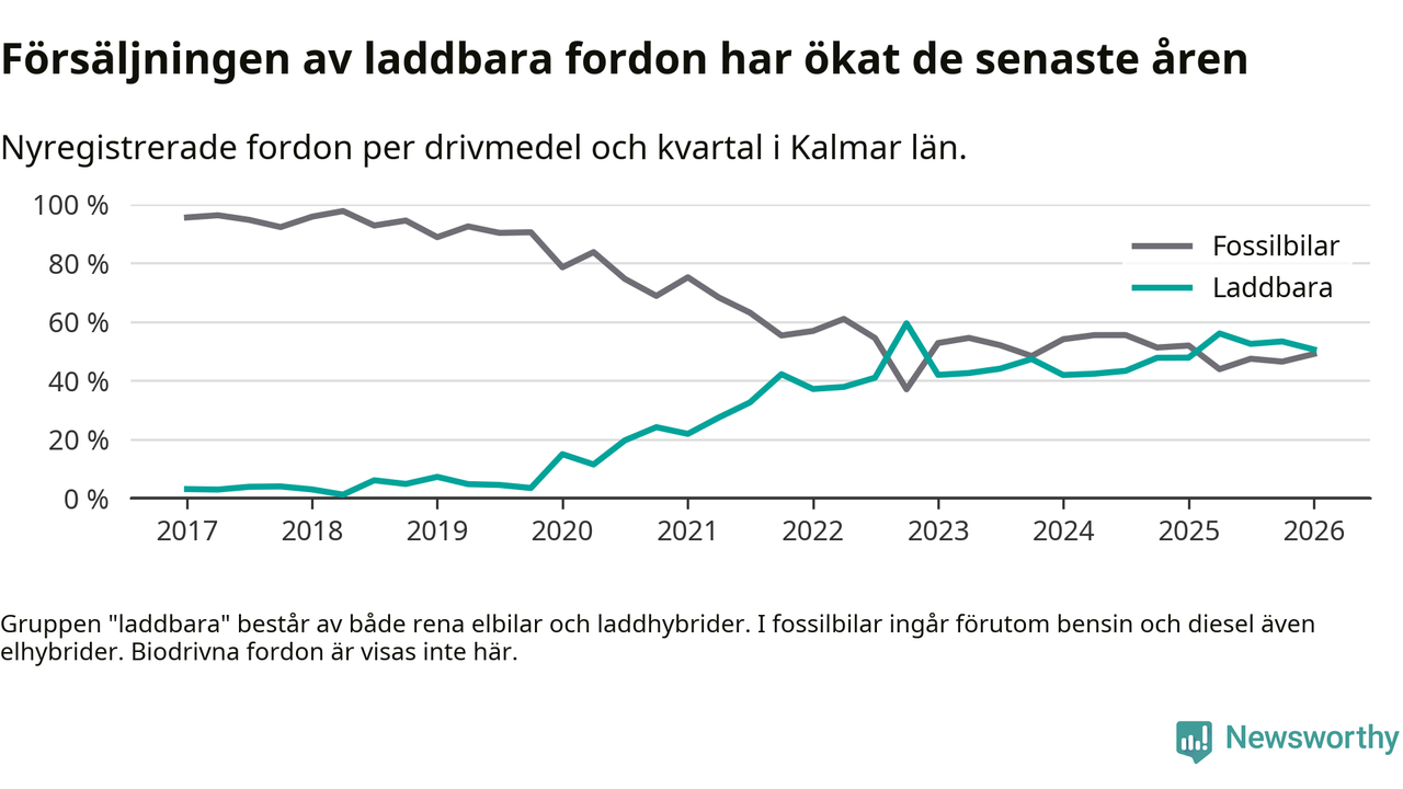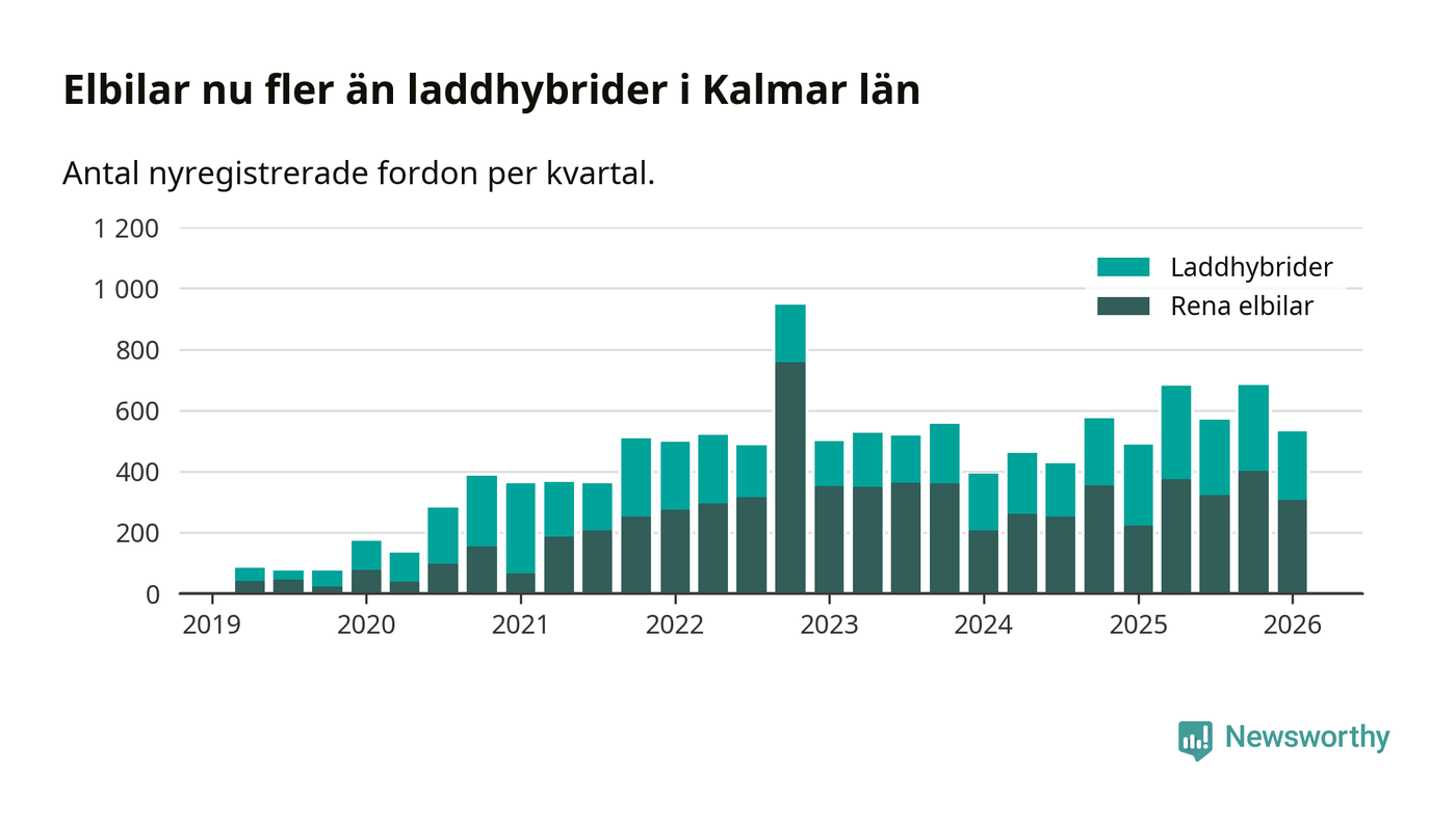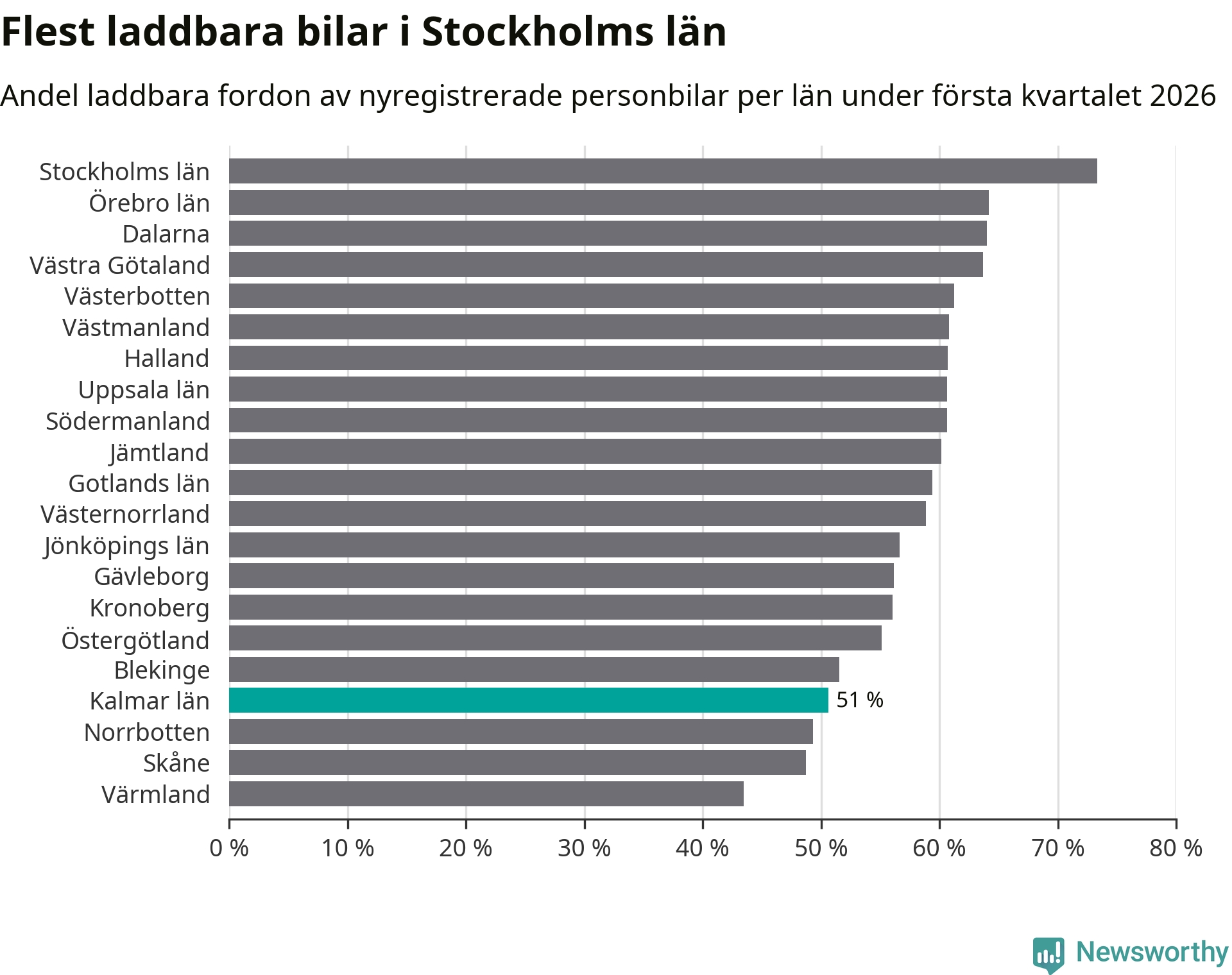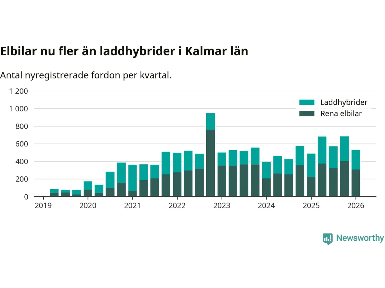 Under första kvartalet 2026 var 51 procent av alla nyregistrerade personbilar i Kalmar län laddbara (sammanlagt registrerades 1 049 nya bilar). Merparten av de laddbara bilarna var rena elbilar (29 procent av alla).