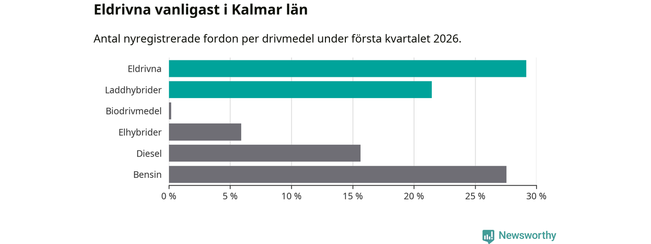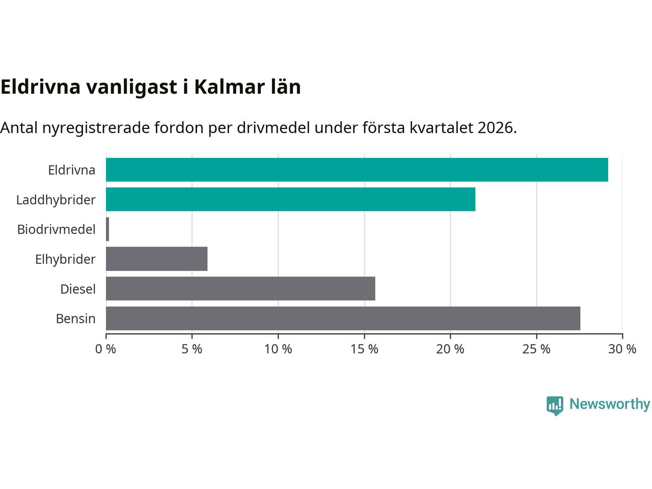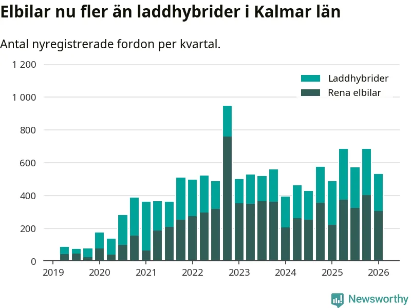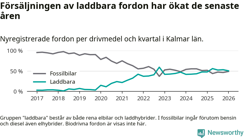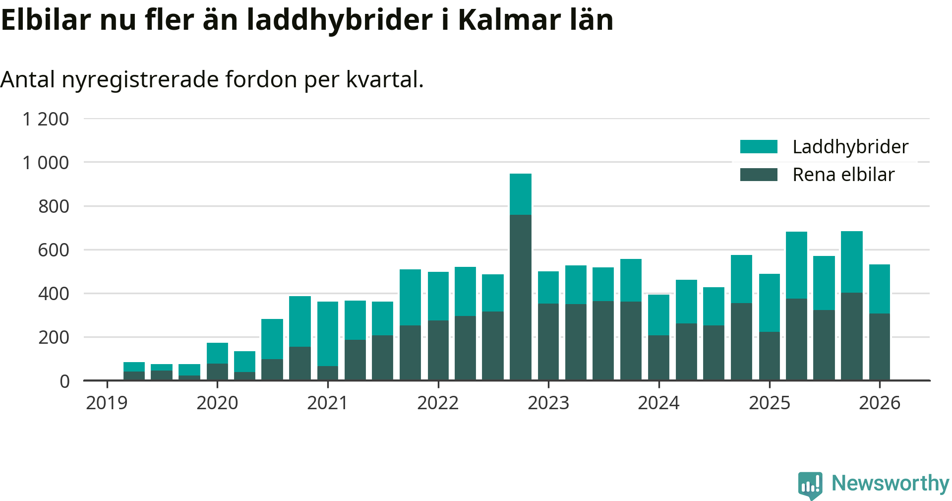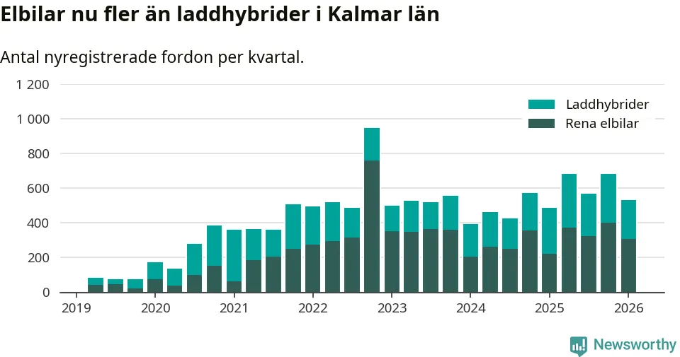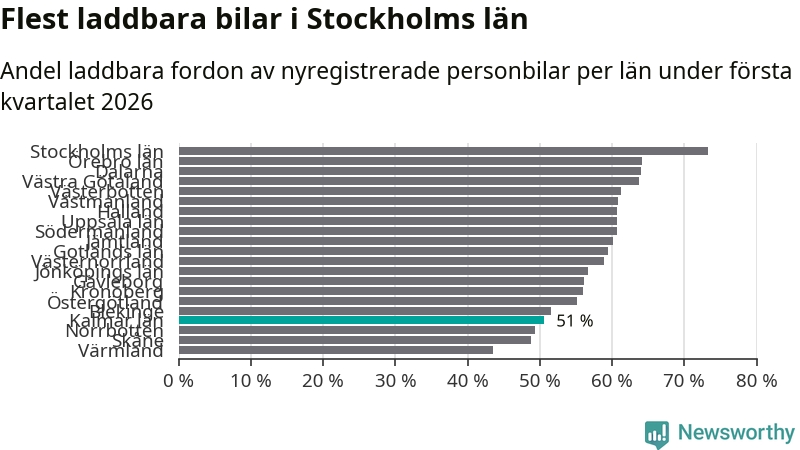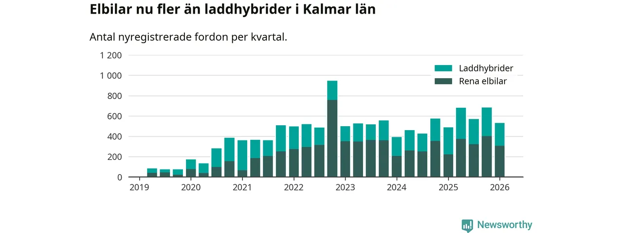 Under första kvartalet 2026 var 51 procent av alla nyregistrerade personbilar i Kalmar län laddbara (sammanlagt registrerades 1 049 nya bilar). Merparten av de laddbara bilarna var rena elbilar (29 procent av alla).