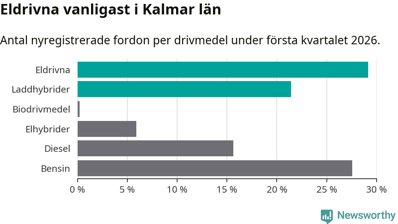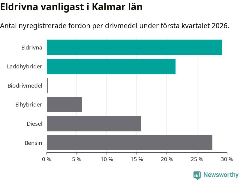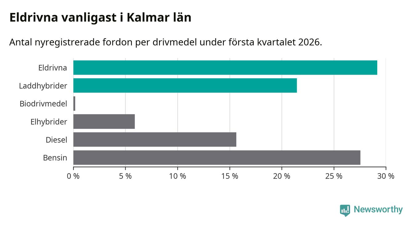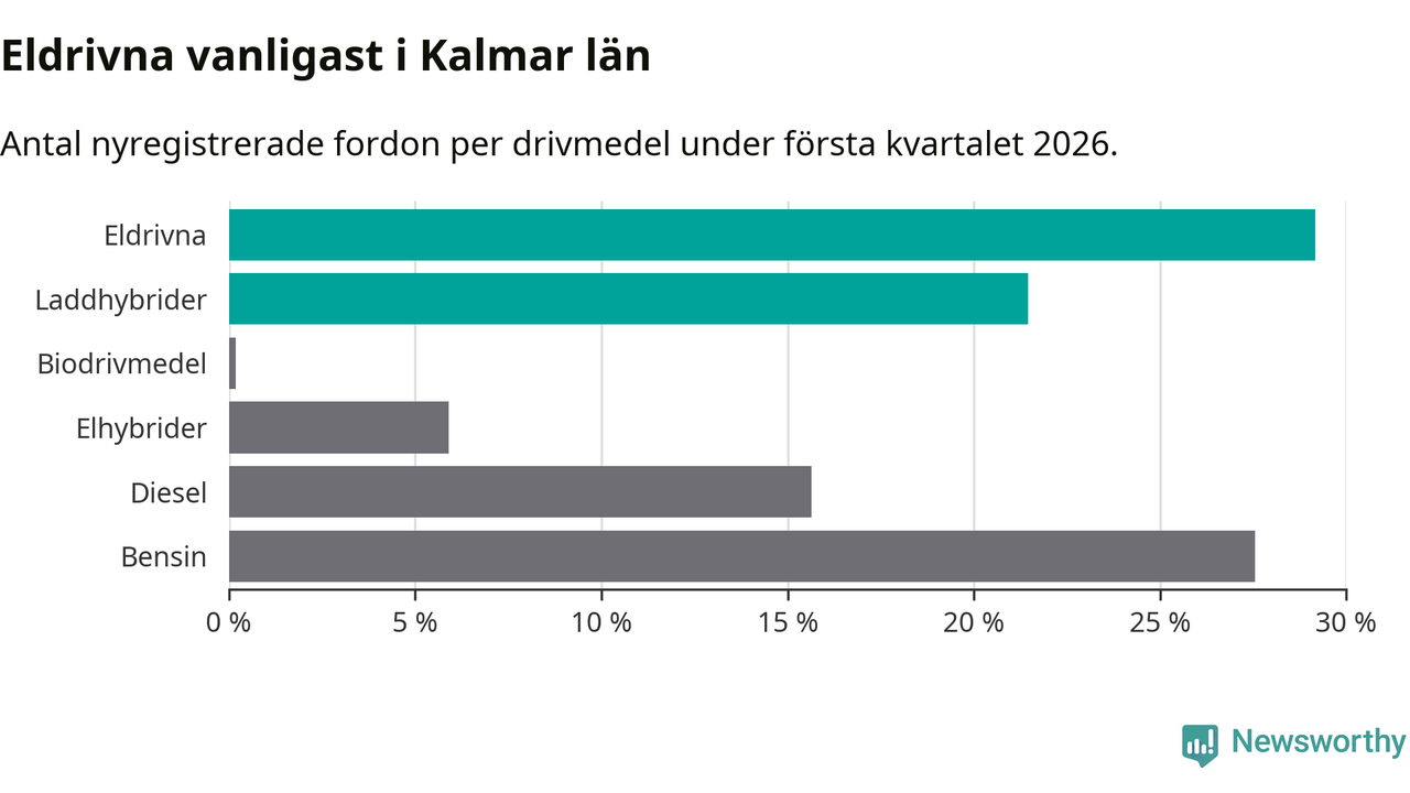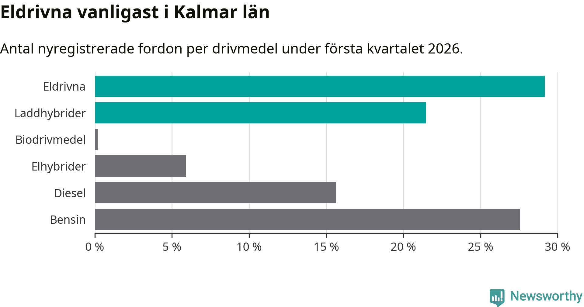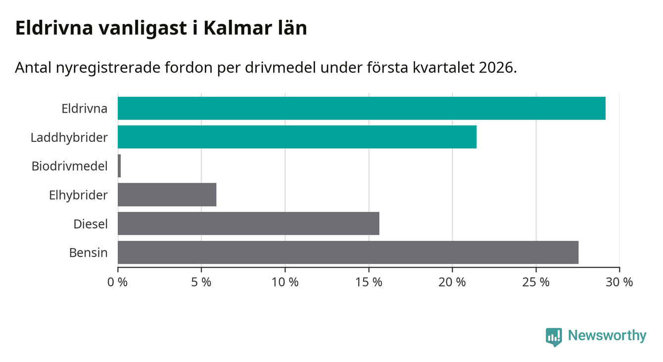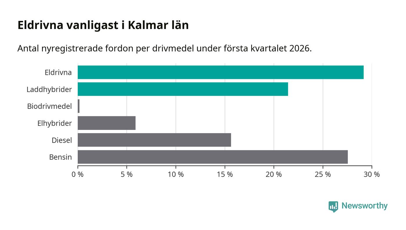 Under första kvartalet 2026 var 51 procent av alla nyregistrerade personbilar i Kalmar län laddbara (sammanlagt registrerades 1 049 nya bilar). Merparten av de laddbara bilarna var rena elbilar (29 procent av alla).