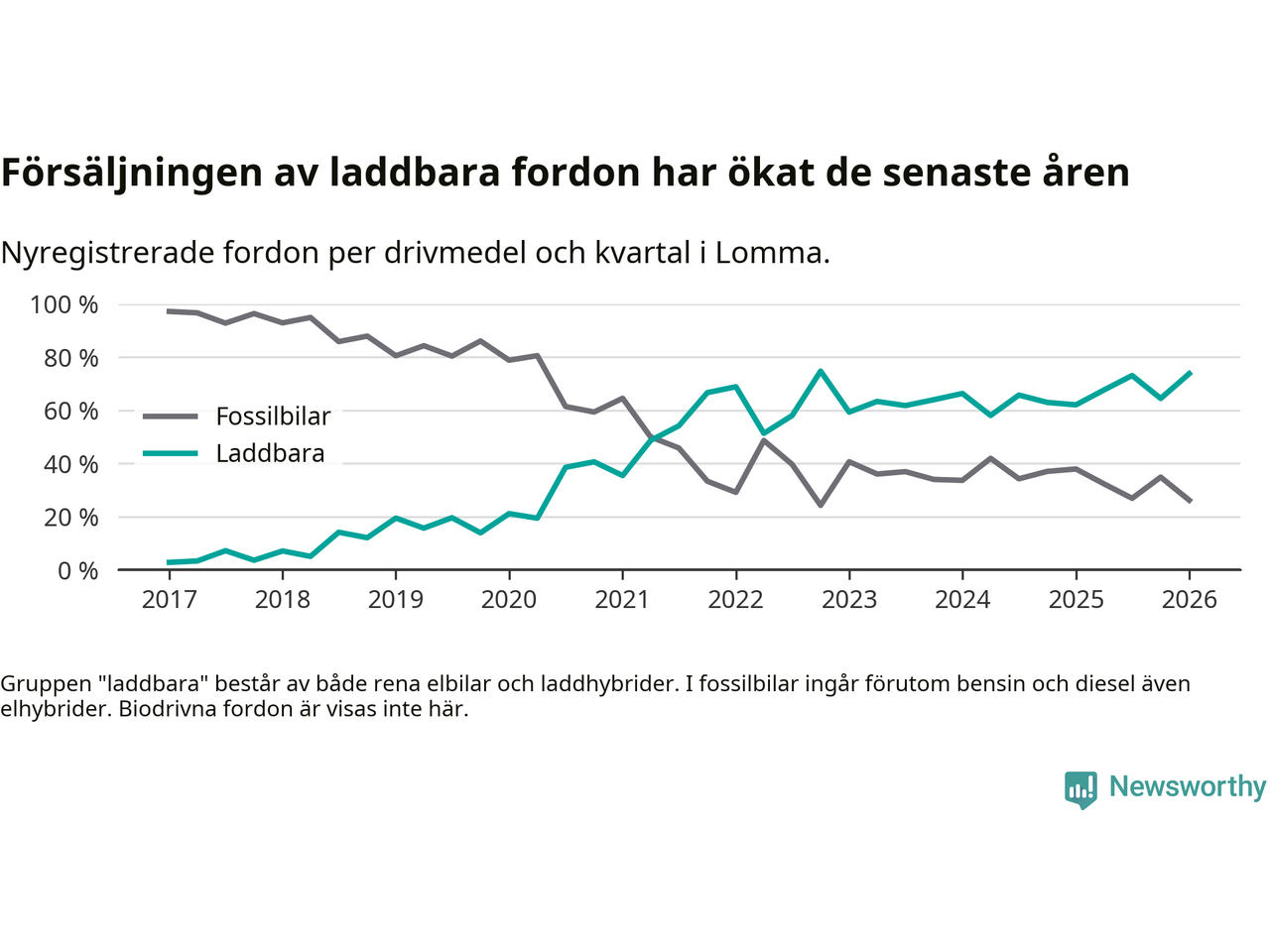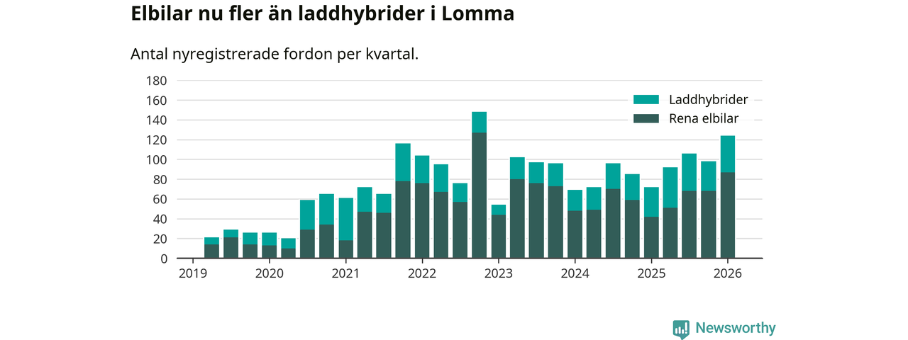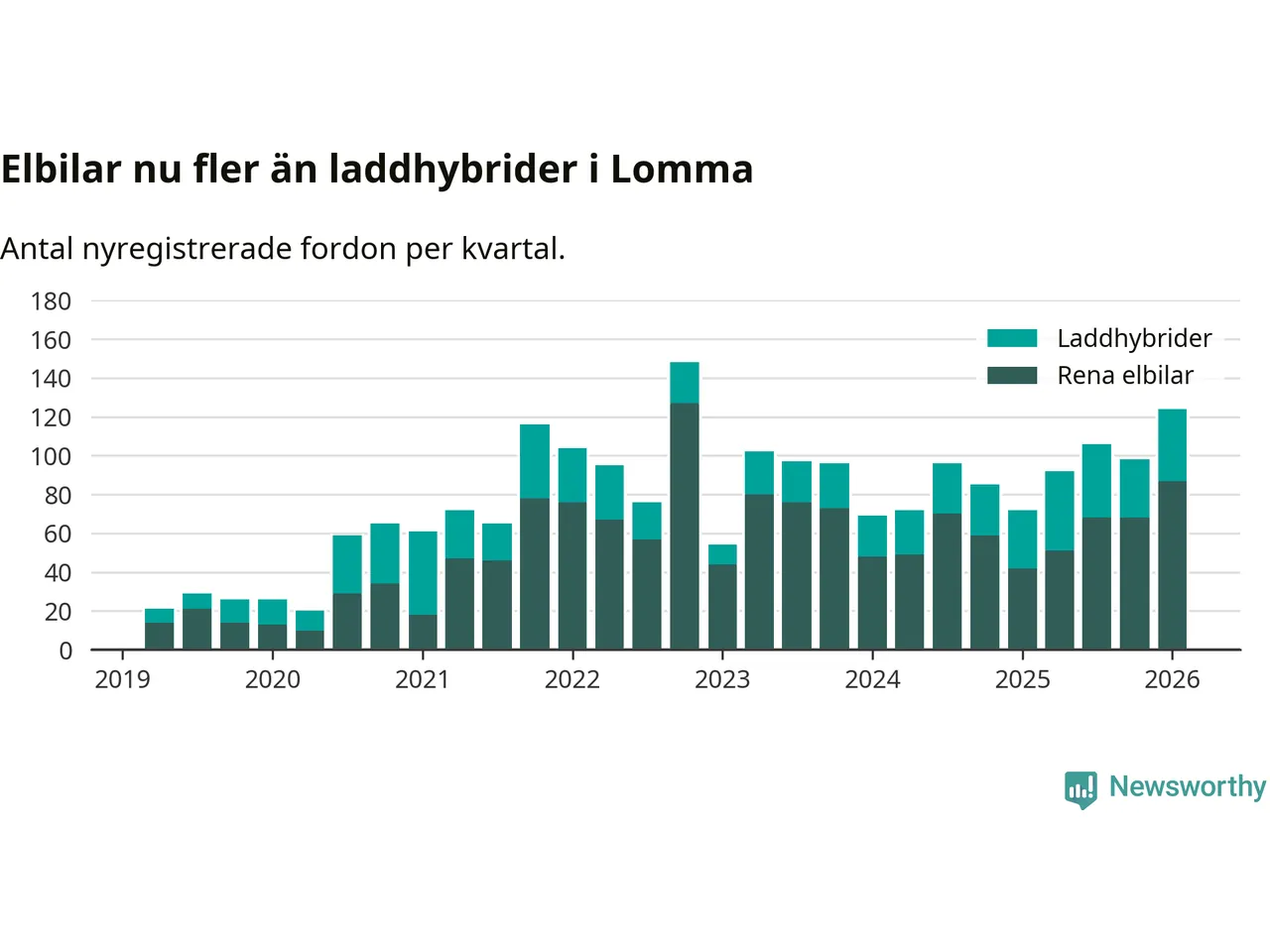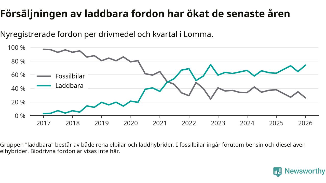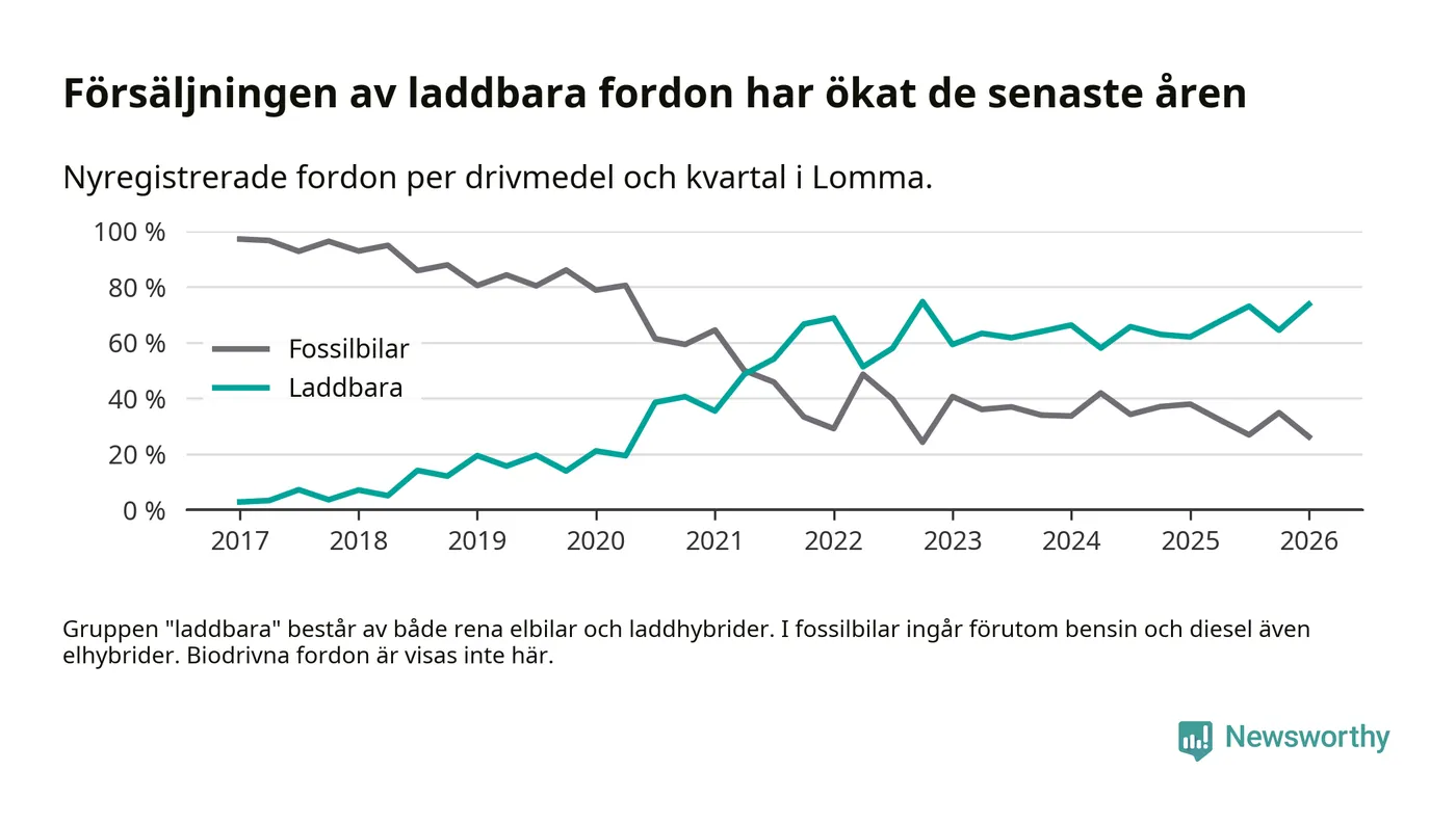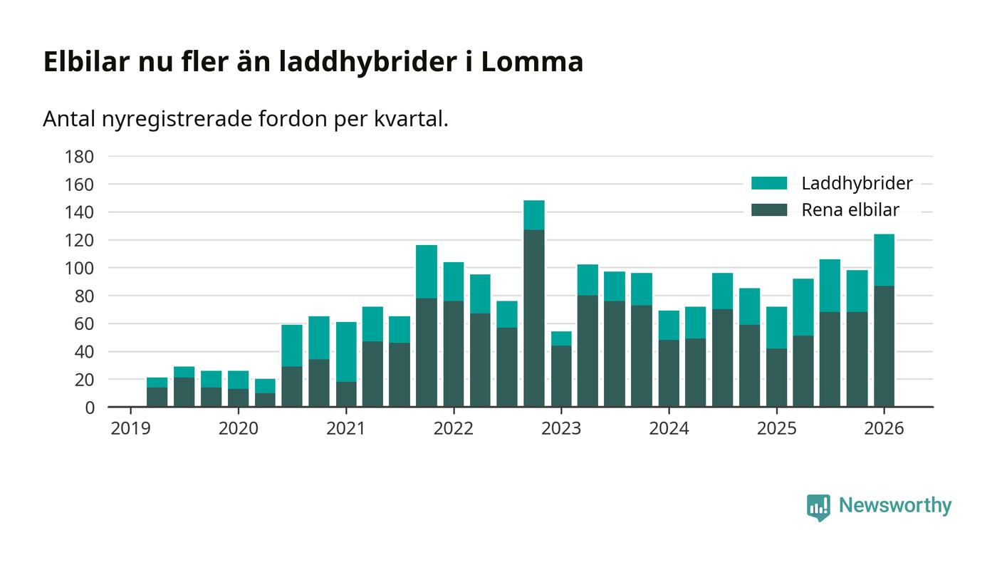 Under första kvartalet 2026 var 74 procent av alla nyregistrerade personbilar i Lomma laddbara (sammanlagt registrerades 168 nya bilar). Merparten av de laddbara bilarna var rena elbilar (52 procent av alla).