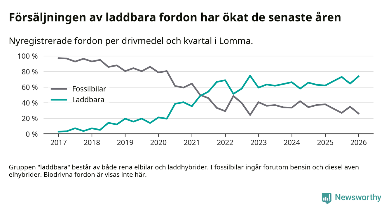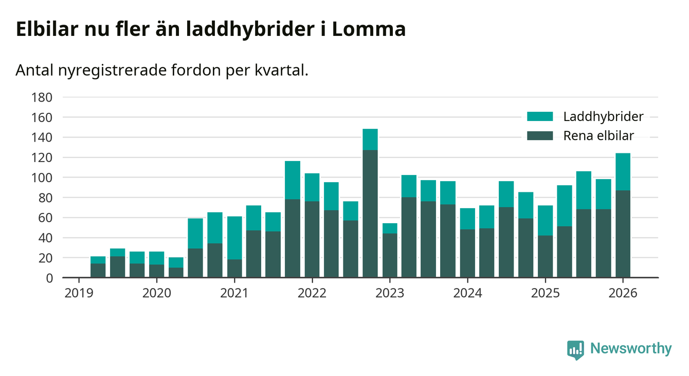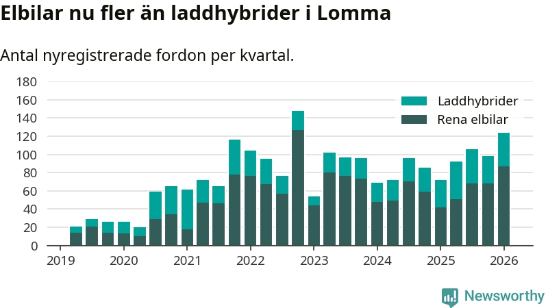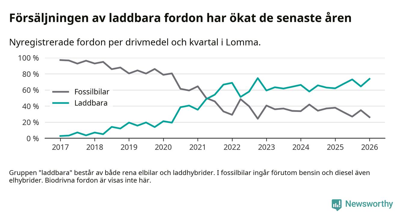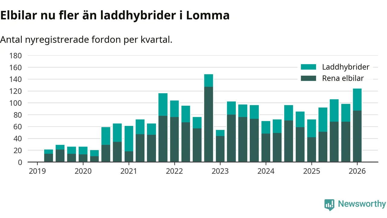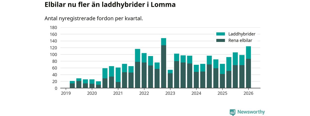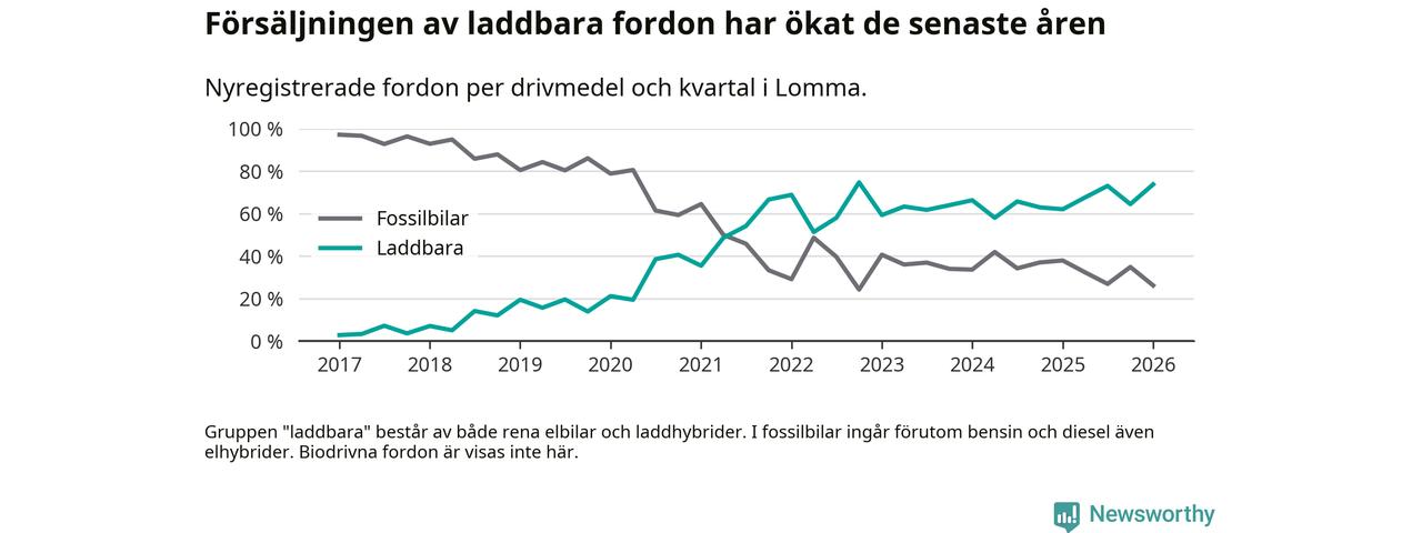 Under första kvartalet 2026 var 74 procent av alla nyregistrerade personbilar i Lomma laddbara (sammanlagt registrerades 168 nya bilar). Merparten av de laddbara bilarna var rena elbilar (52 procent av alla).