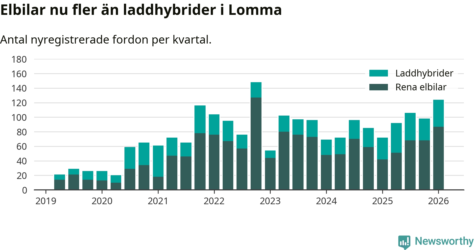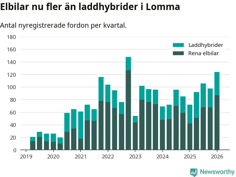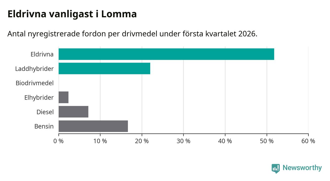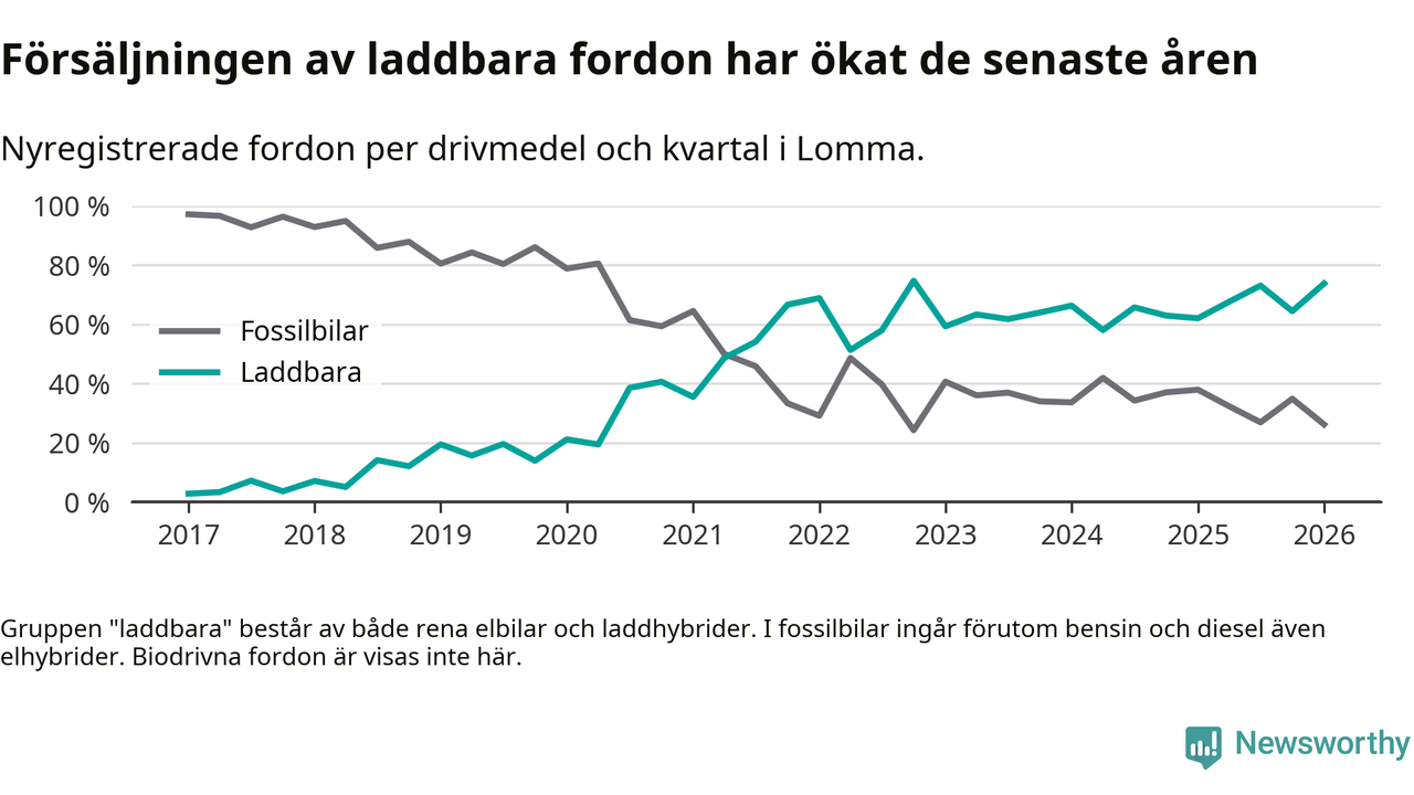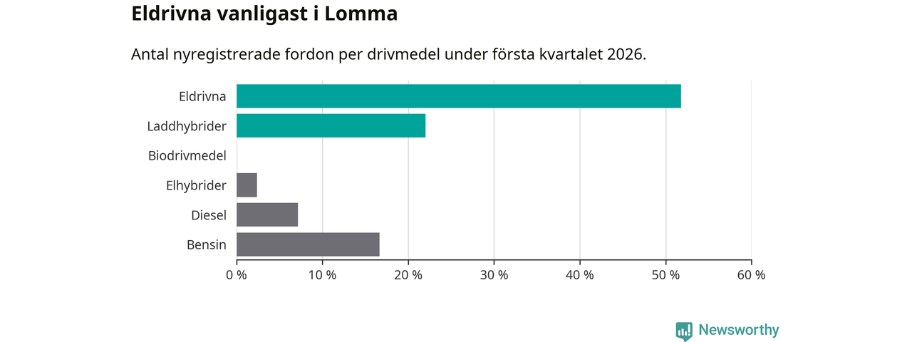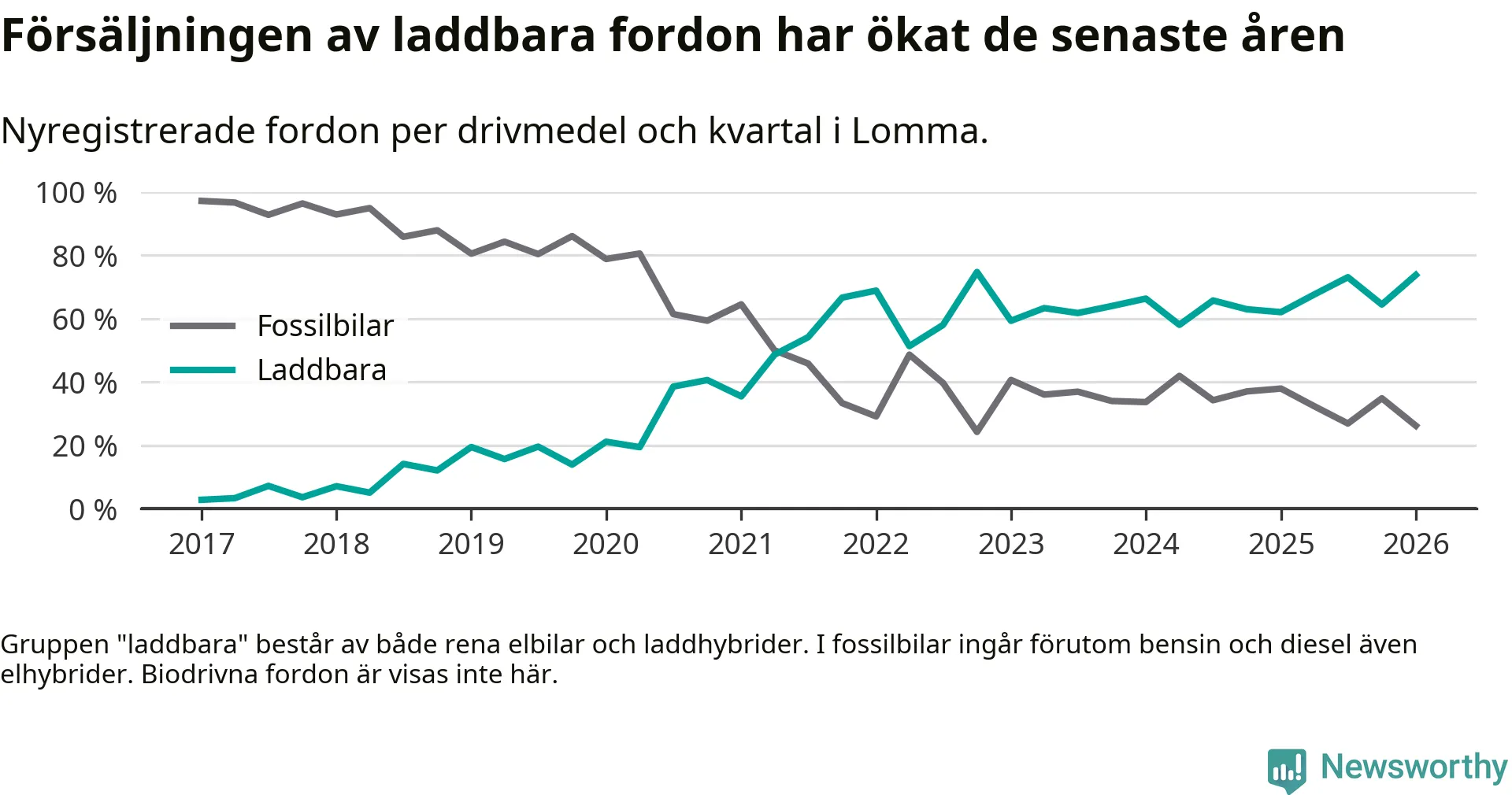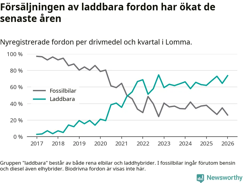 Under första kvartalet 2026 var 74 procent av alla nyregistrerade personbilar i Lomma laddbara (sammanlagt registrerades 168 nya bilar). Merparten av de laddbara bilarna var rena elbilar (52 procent av alla).
