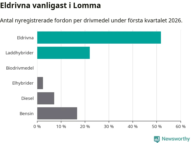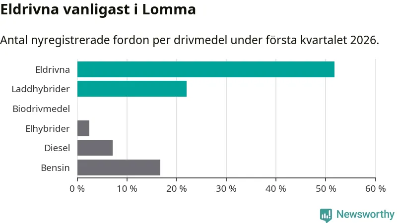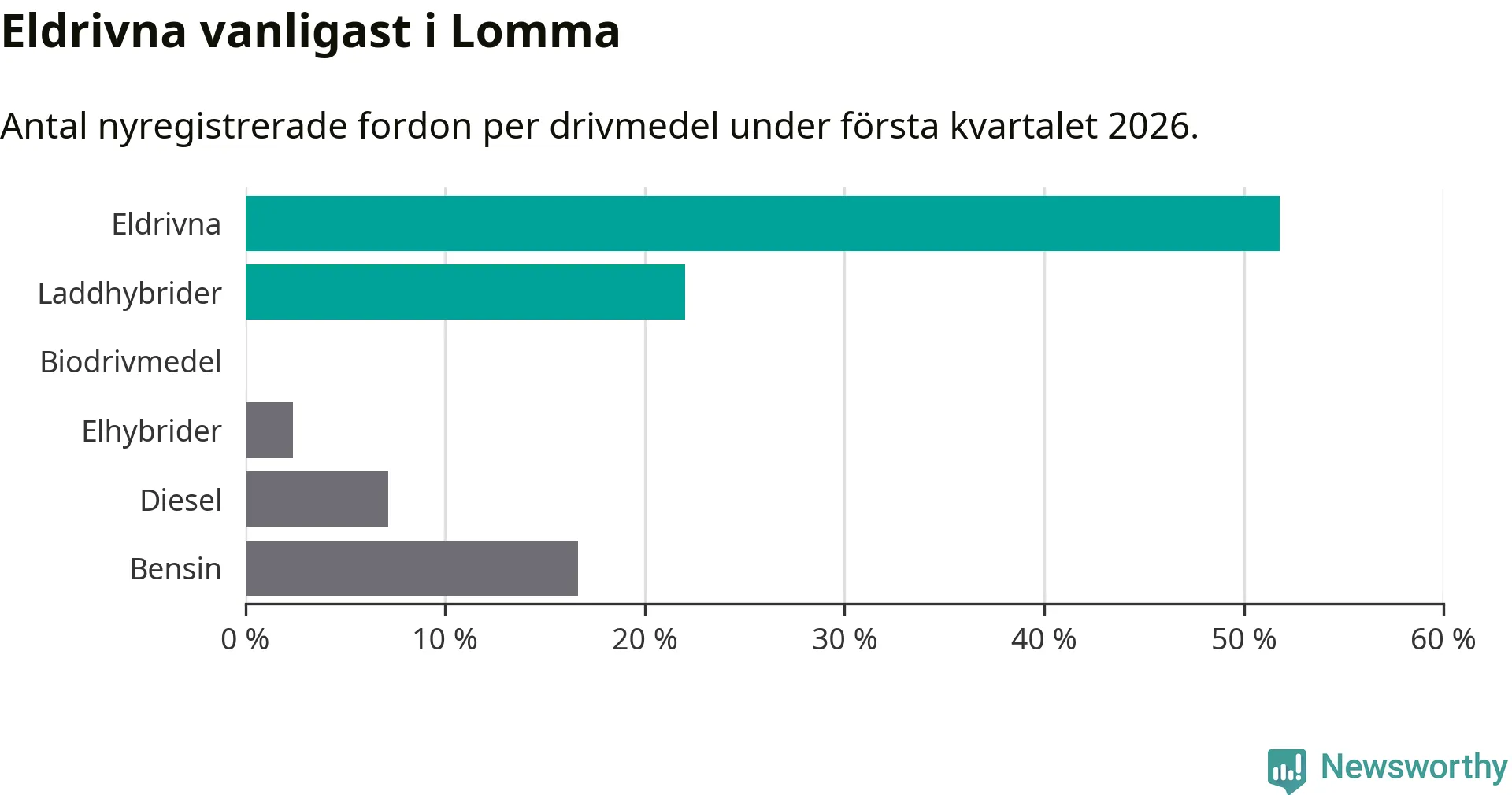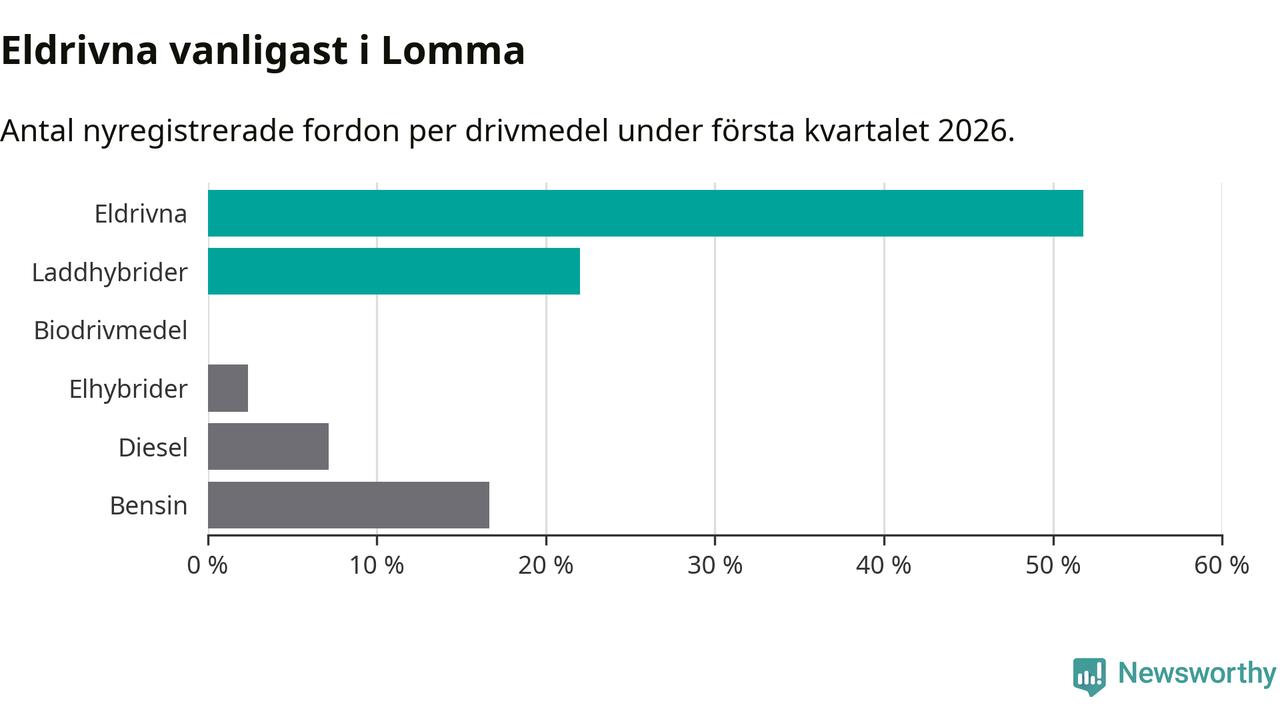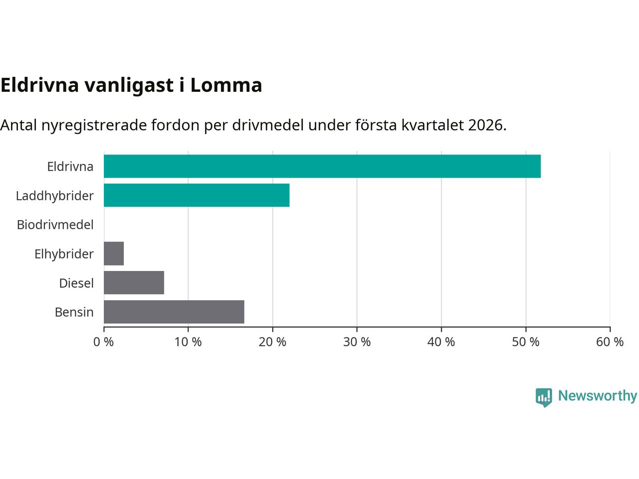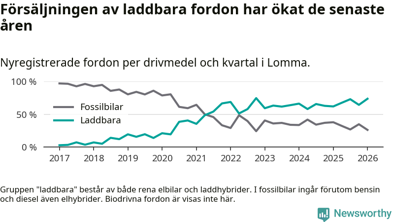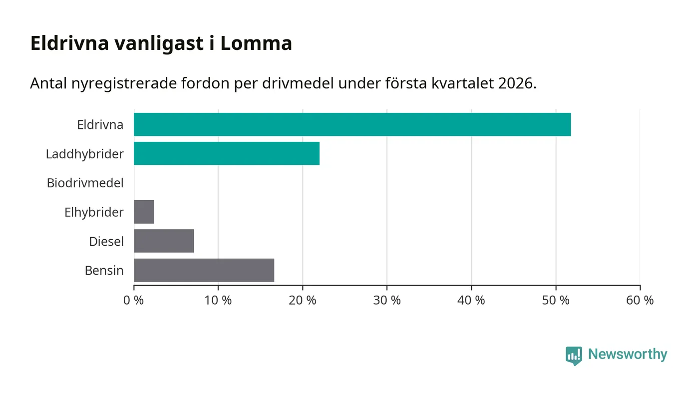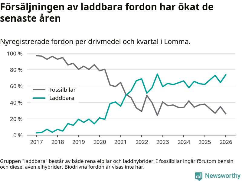 Under första kvartalet 2026 var 74 procent av alla nyregistrerade personbilar i Lomma laddbara (sammanlagt registrerades 168 nya bilar). Merparten av de laddbara bilarna var rena elbilar (52 procent av alla).