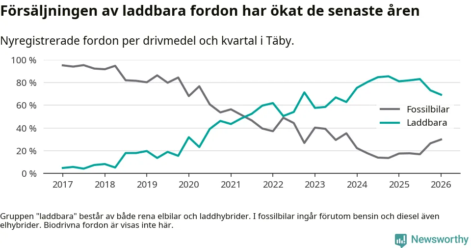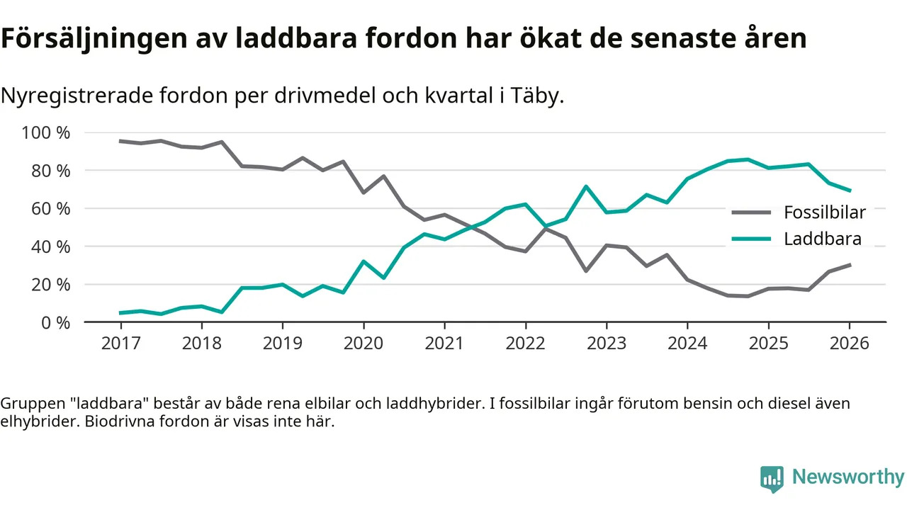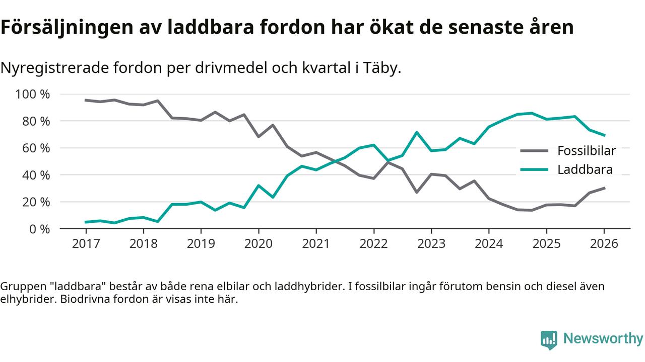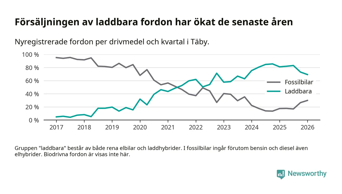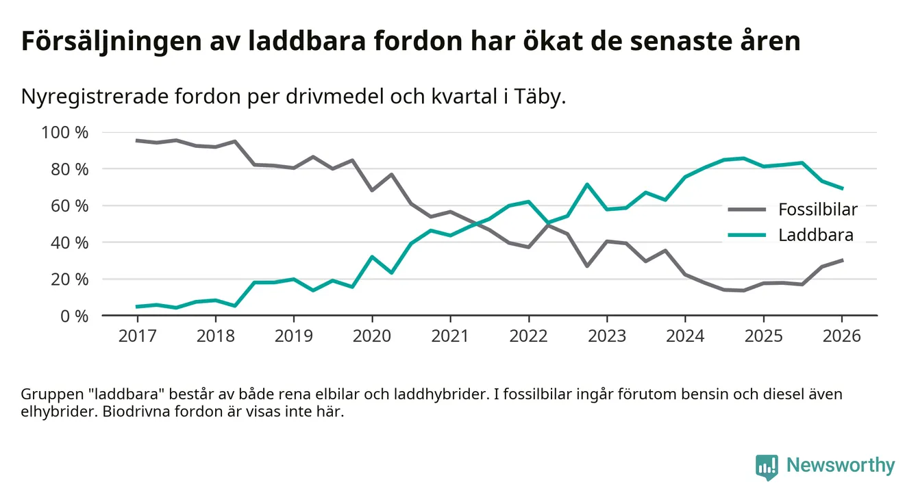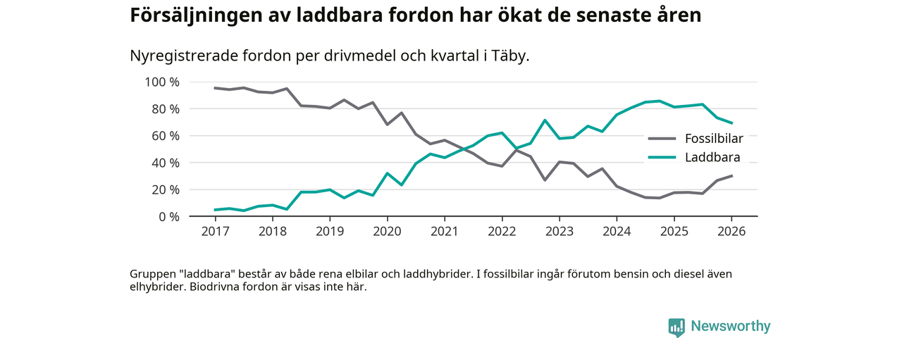 Under första kvartalet 2026 var 69 procent av alla nyregistrerade personbilar i Täby laddbara (sammanlagt registrerades 512 nya bilar). Merparten av de laddbara bilarna var rena elbilar (43 procent av alla).