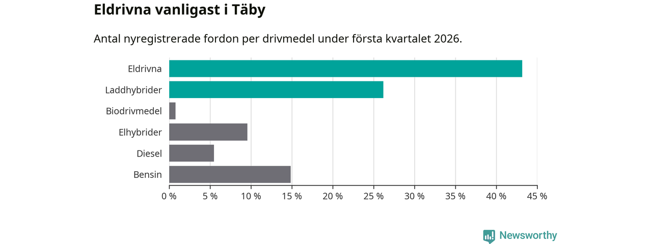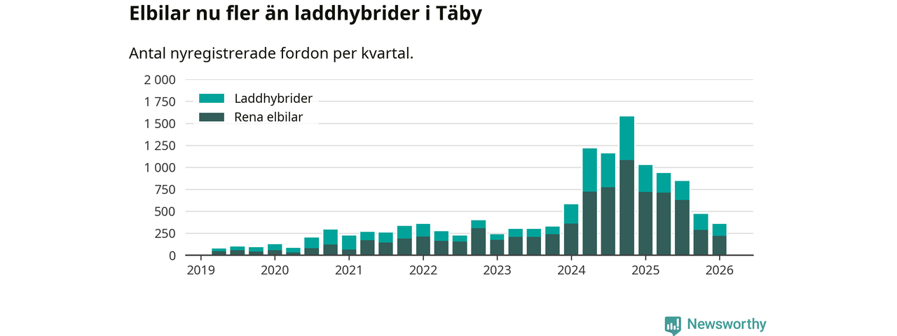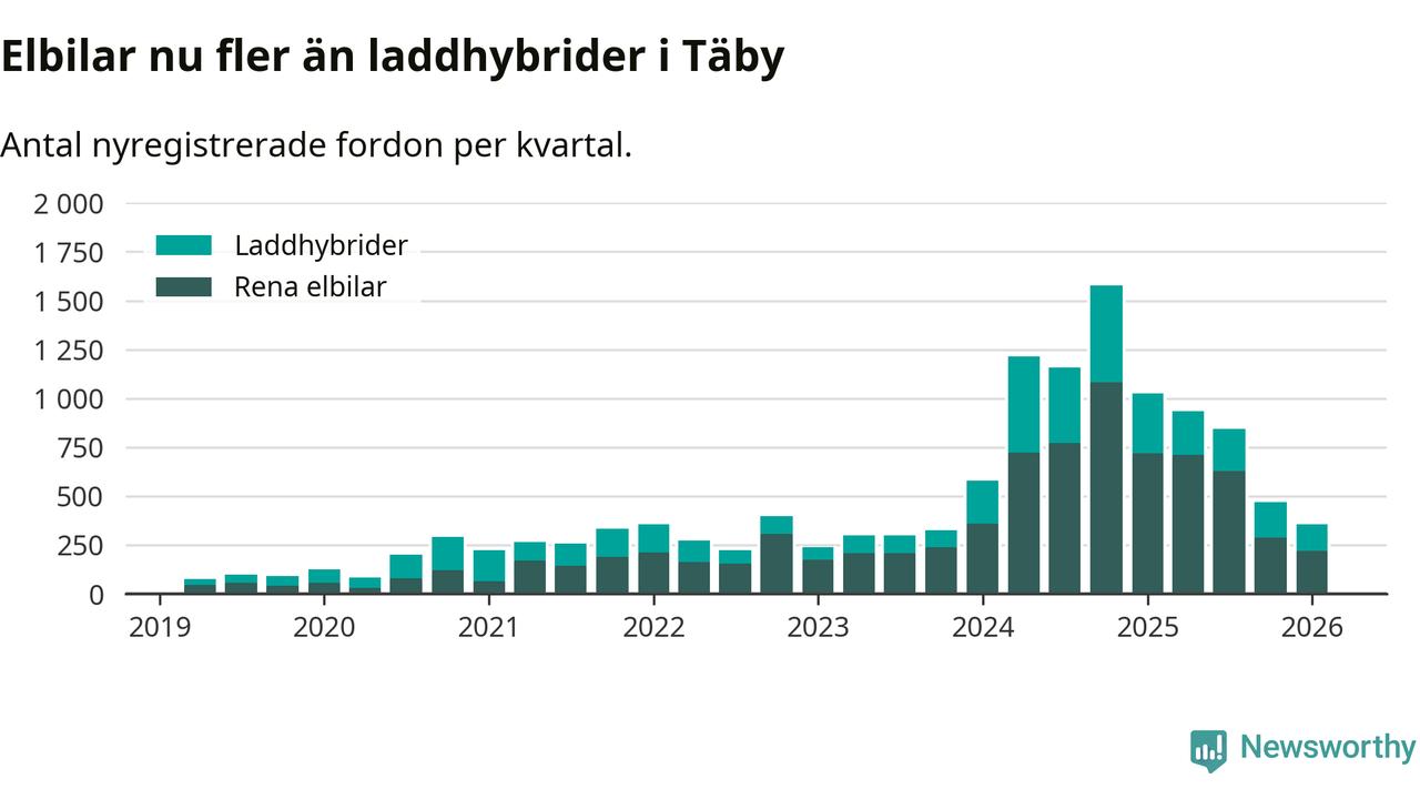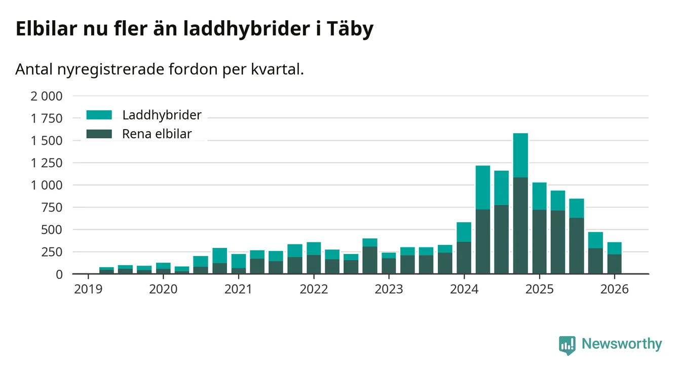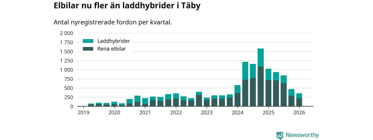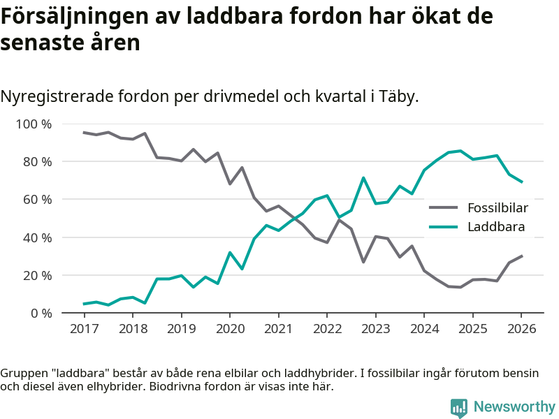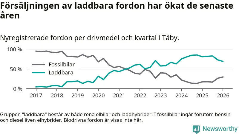 Under första kvartalet 2026 var 69 procent av alla nyregistrerade personbilar i Täby laddbara (sammanlagt registrerades 512 nya bilar). Merparten av de laddbara bilarna var rena elbilar (43 procent av alla).