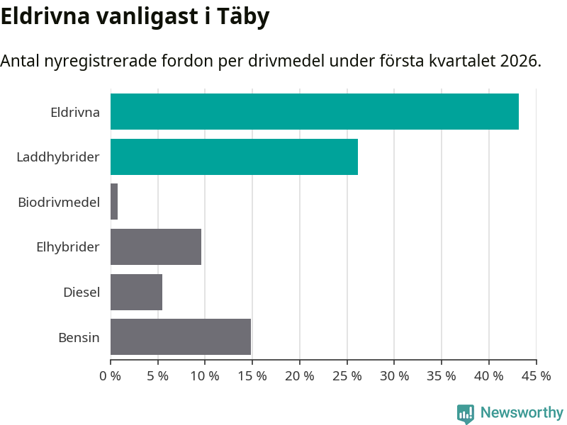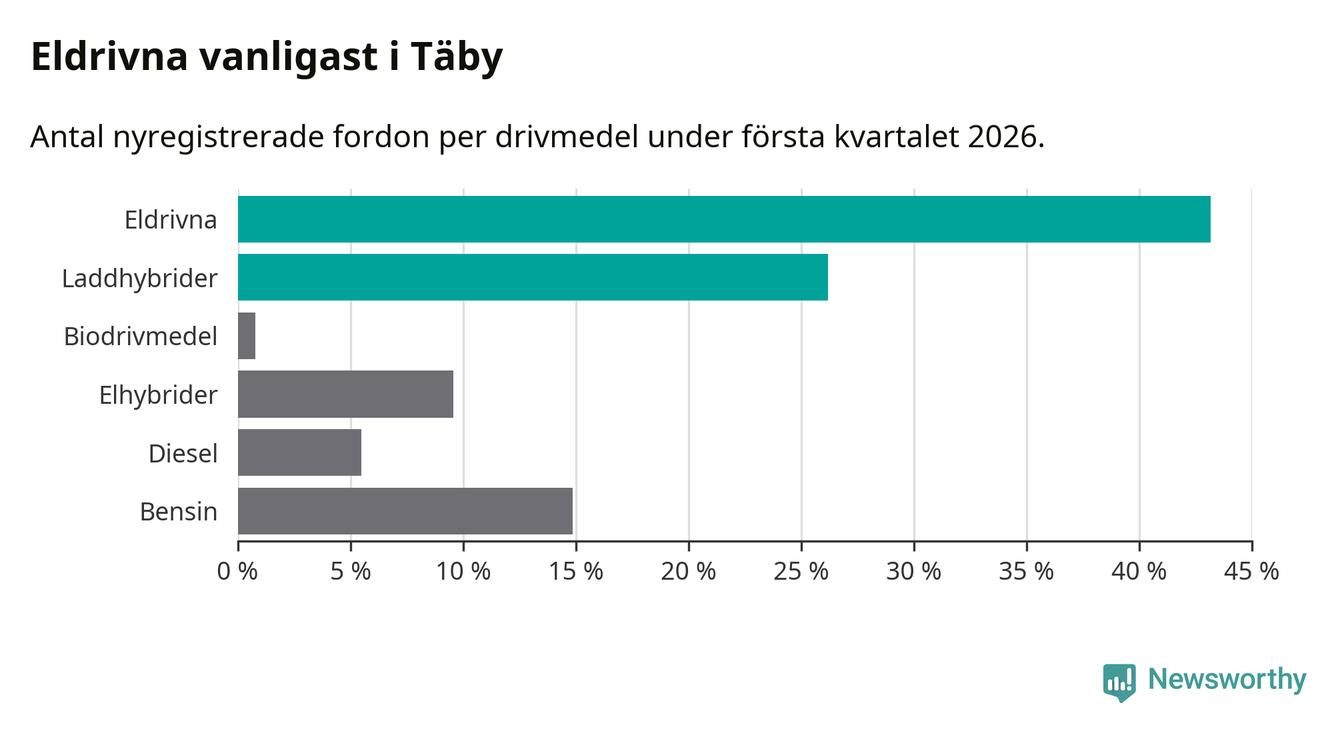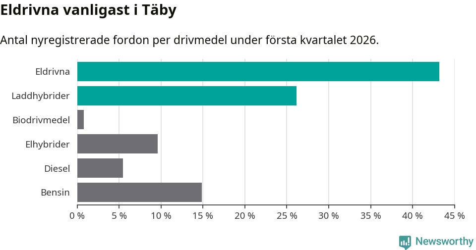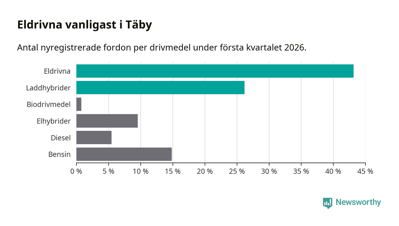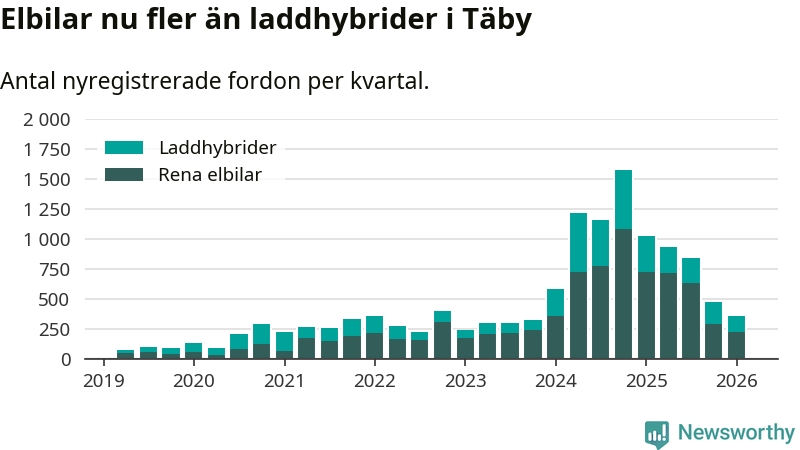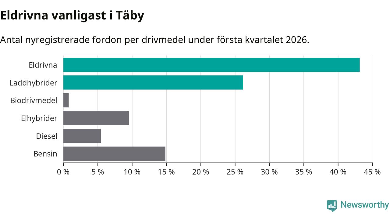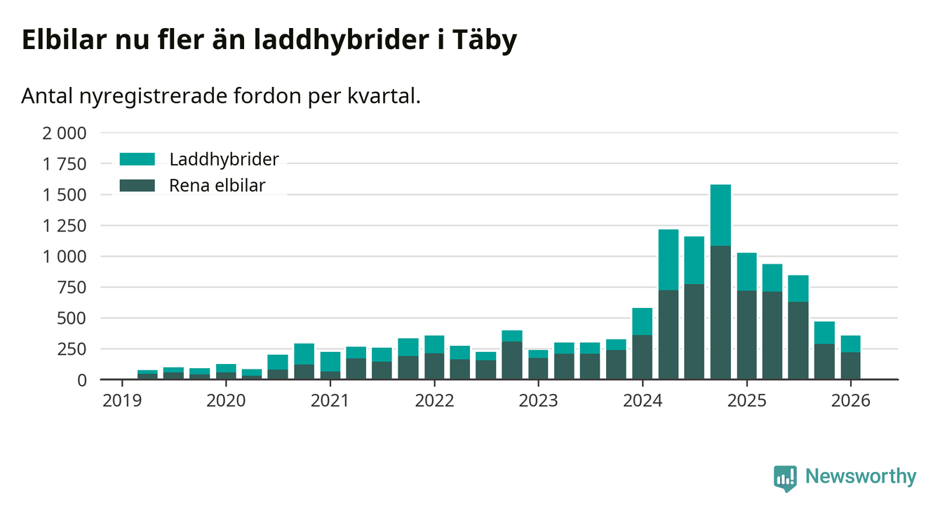Under första kvartalet 2026 var 69 procent av alla nyregistrerade personbilar i Täby laddbara (sammanlagt registrerades 512 nya bilar). Merparten av de laddbara bilarna var rena elbilar (43 procent av alla).
