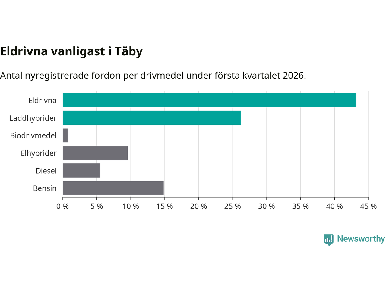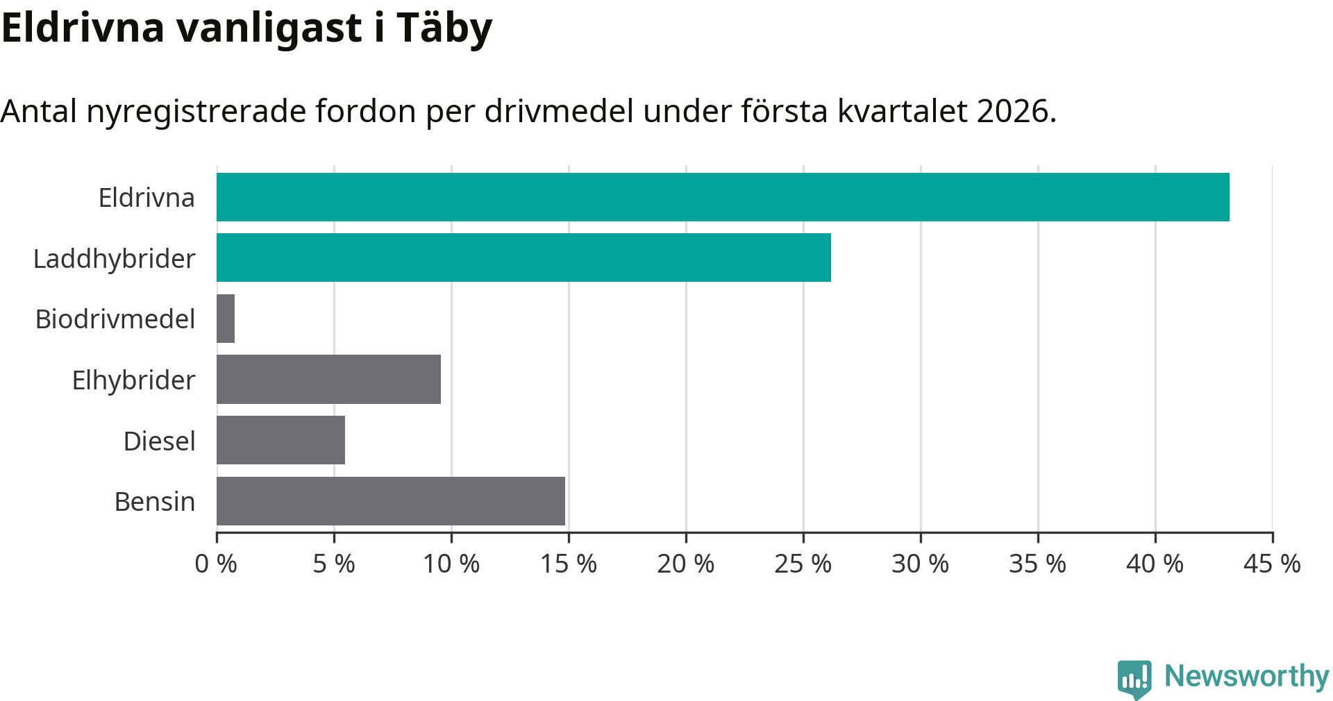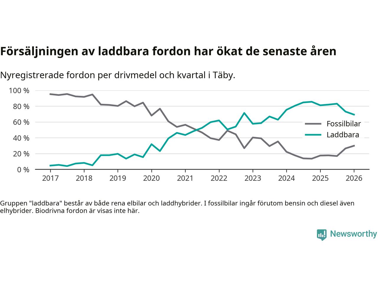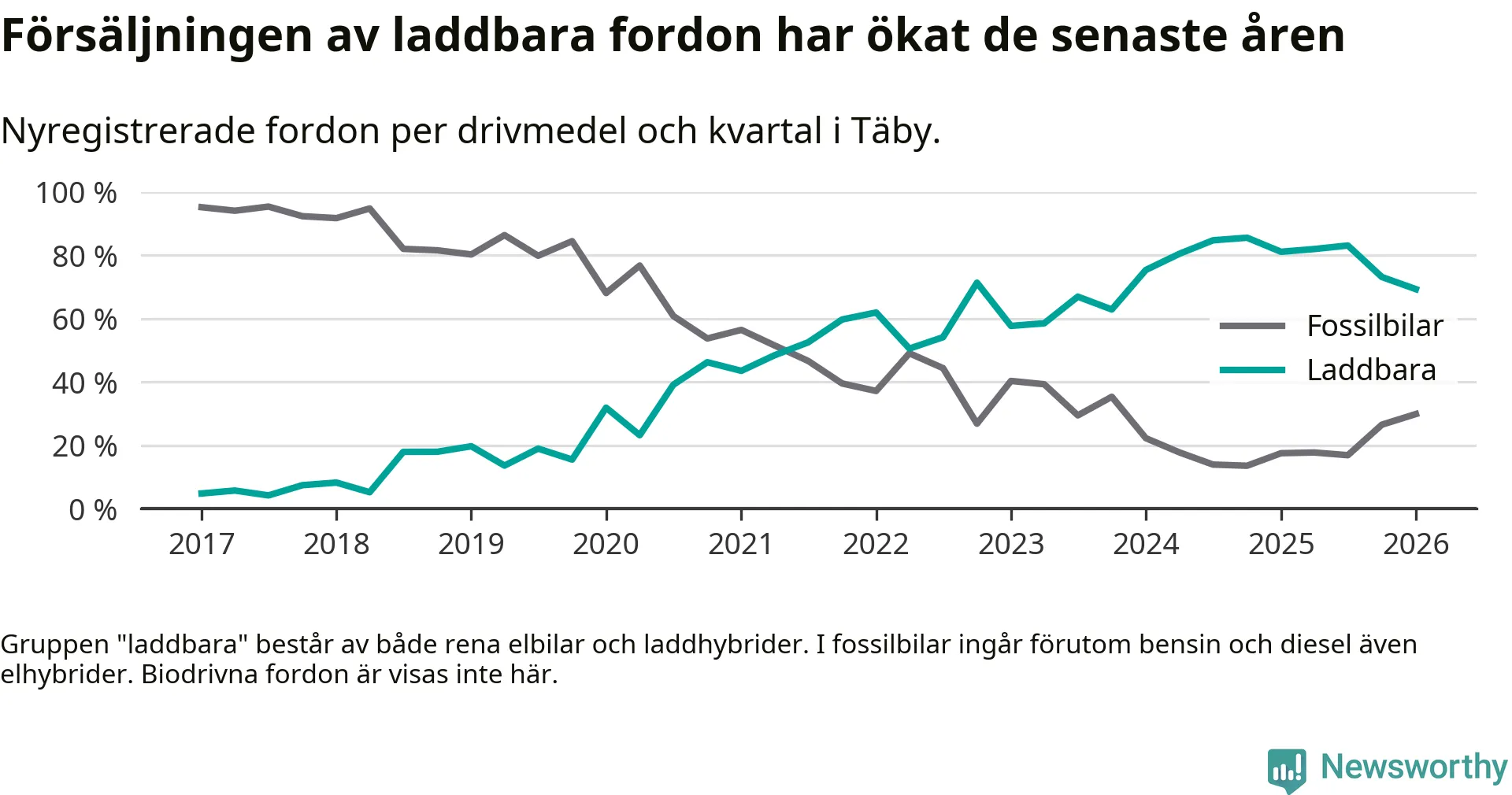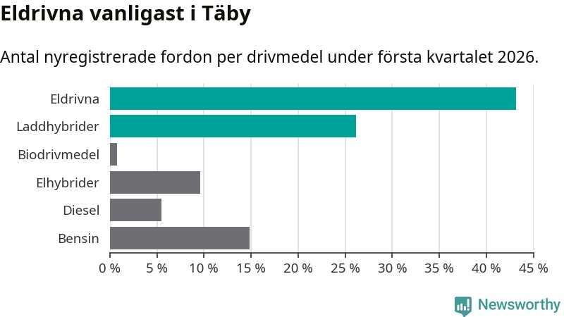 Under första kvartalet 2026 var 69 procent av alla nyregistrerade personbilar i Täby laddbara (sammanlagt registrerades 512 nya bilar). Merparten av de laddbara bilarna var rena elbilar (43 procent av alla).