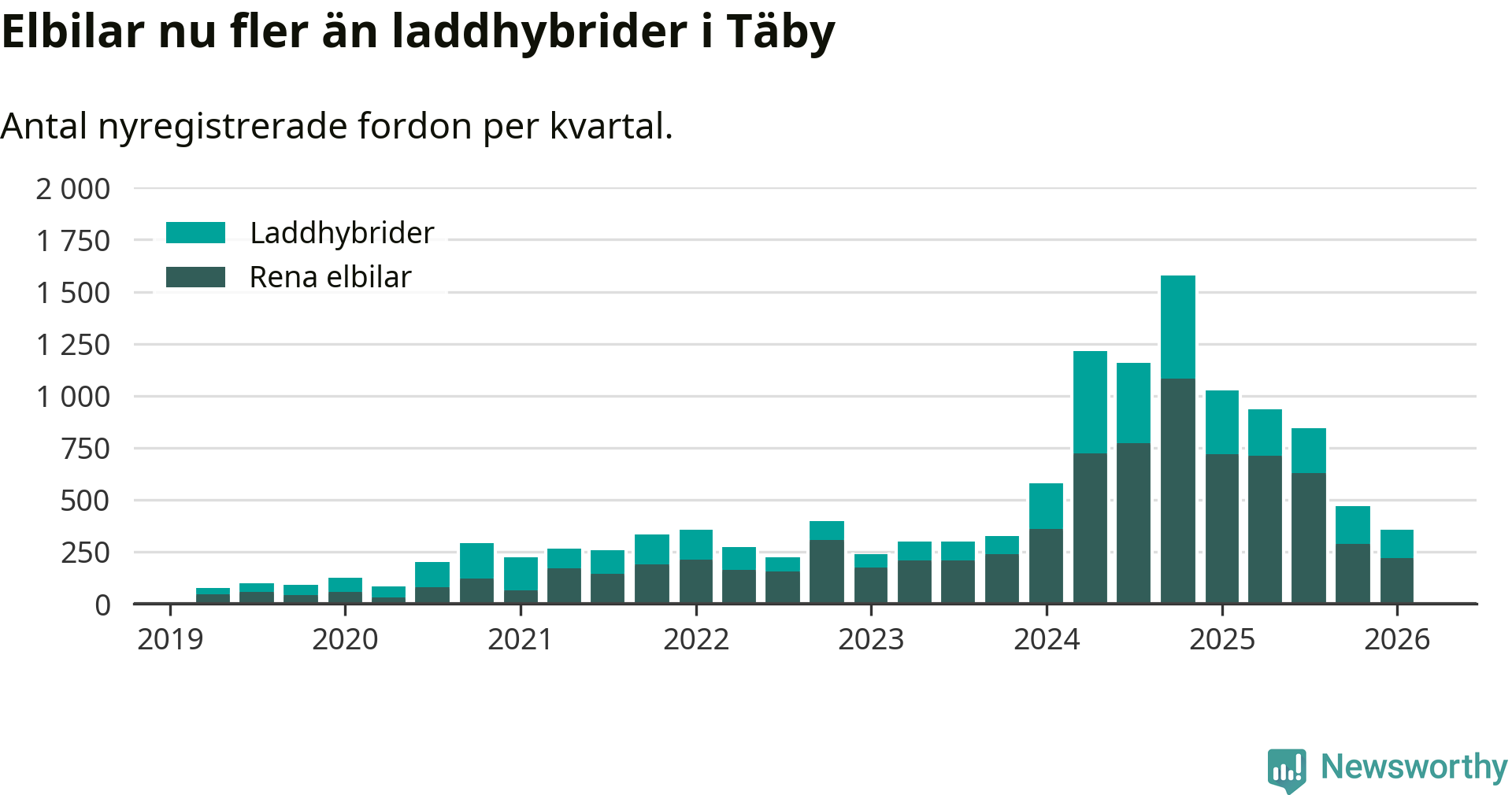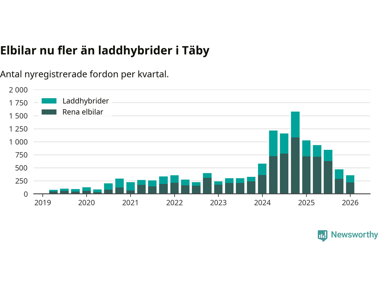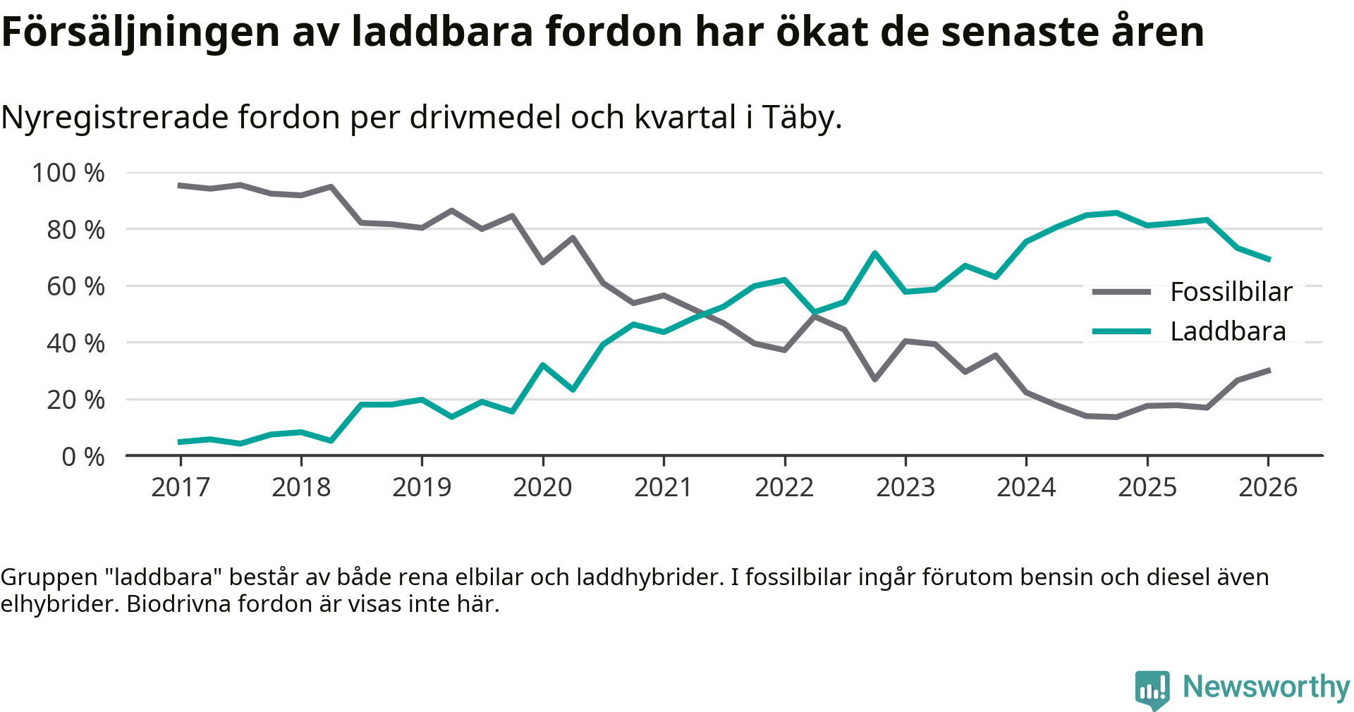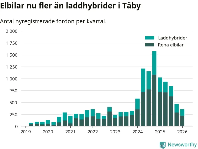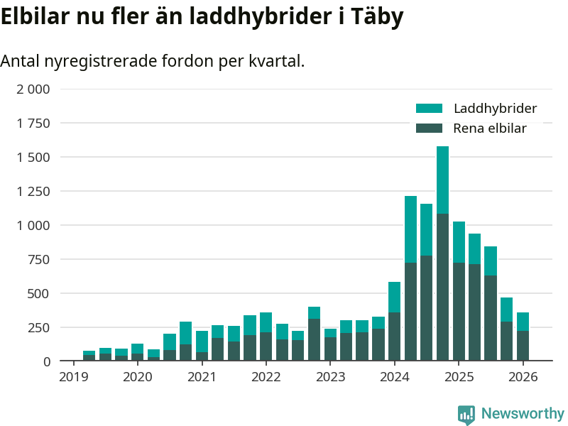 I Täby minskade andelen laddbara bilar under första kvartalet jämfört med kvartalet innan (−3,8 procentenheter). Nyregistreringen peakade under fjärde kvartalet 2024 då 86 procent av de nya bilarna var laddbara.