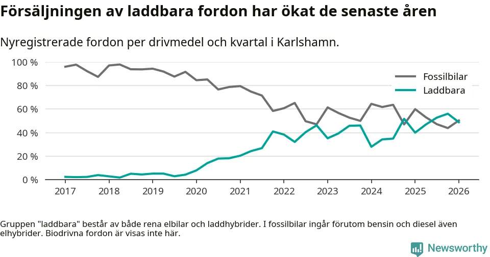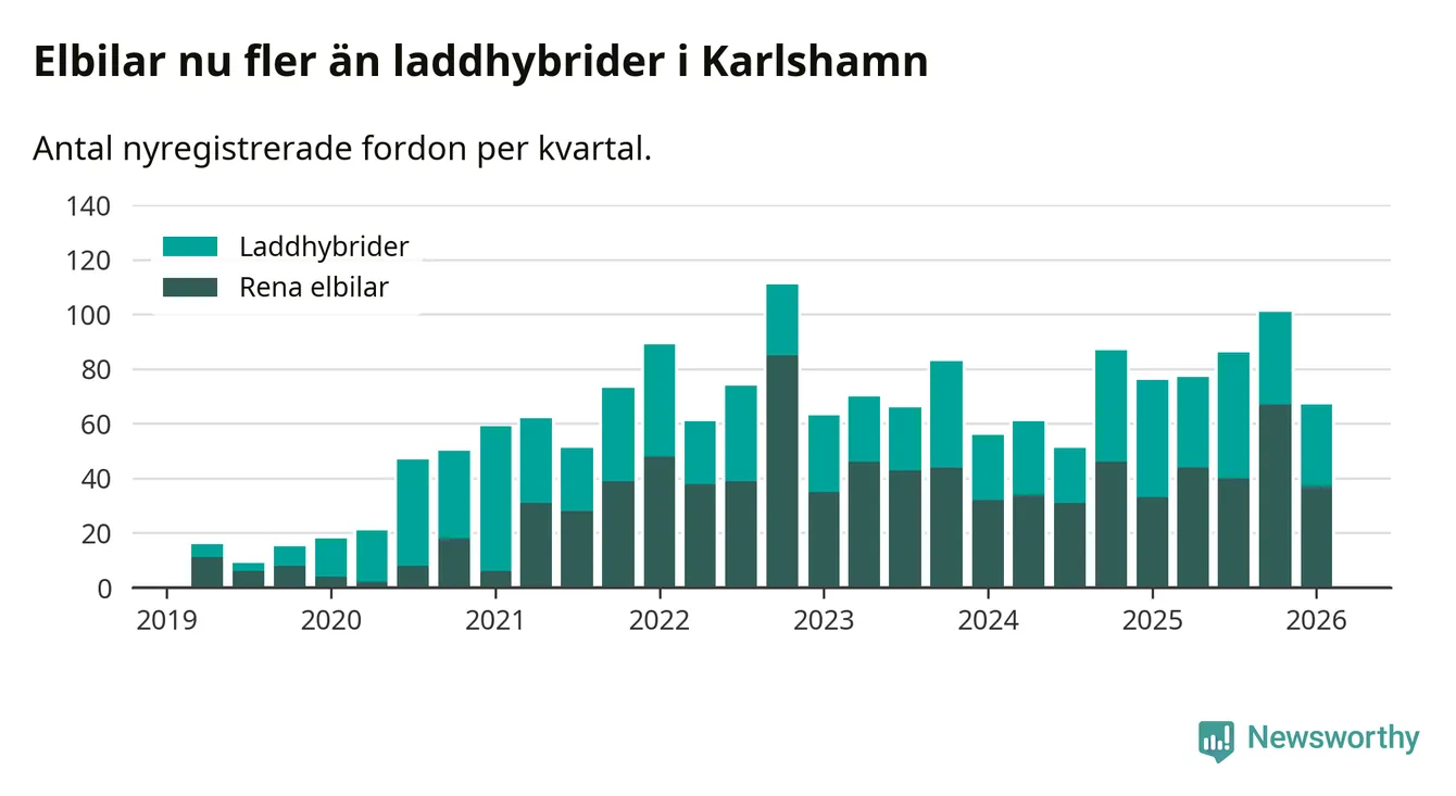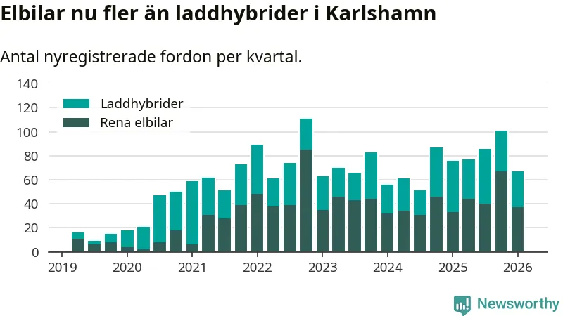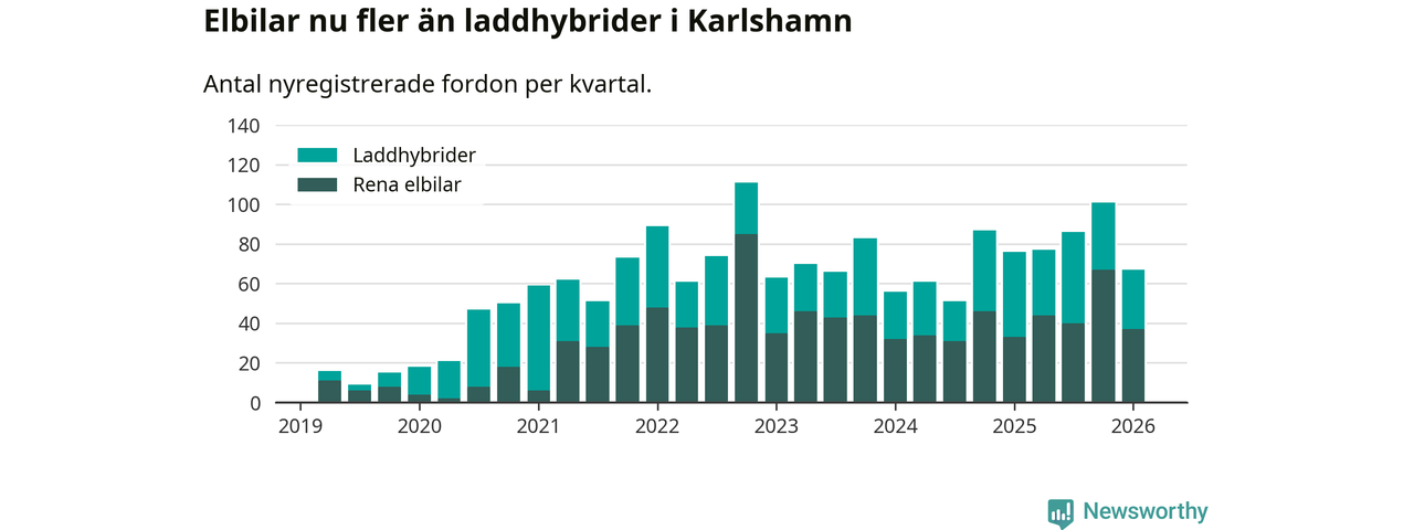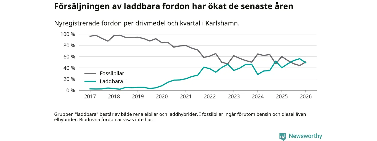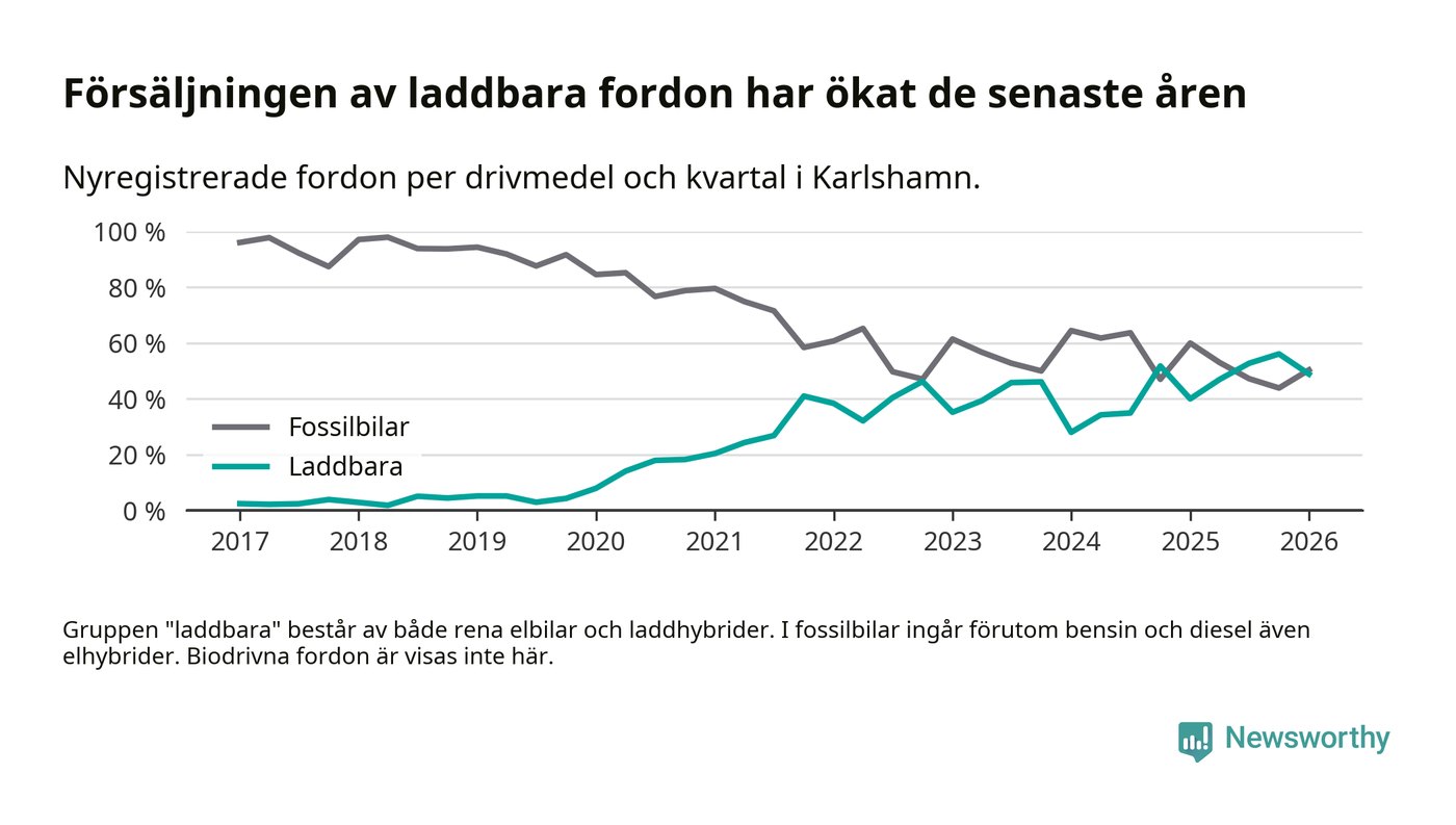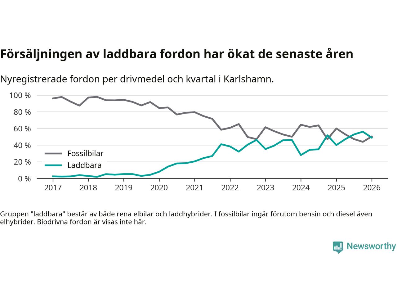 I Karlshamn minskade andelen laddbara bilar under första kvartalet jämfört med kvartalet innan (−7,2 procentenheter). Nyregistreringen peakade under fjärde kvartalet 2025 då 56 procent av de nya bilarna var laddbara.