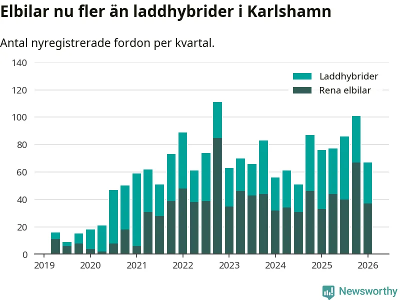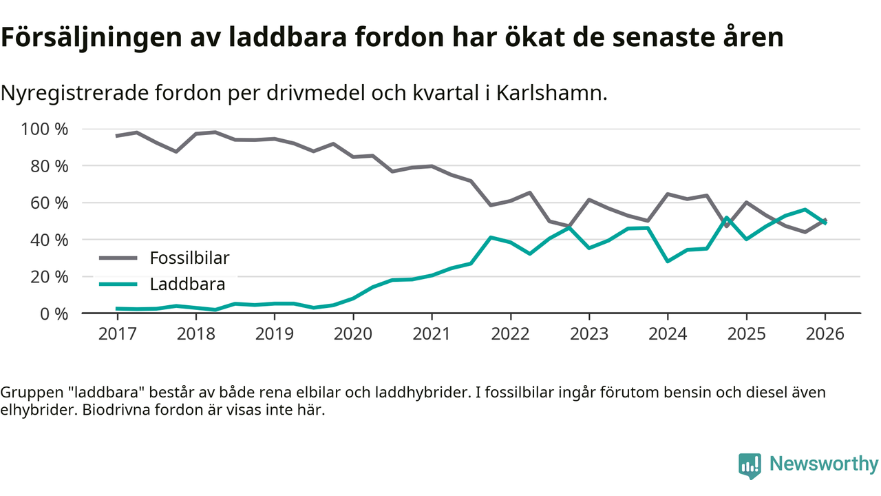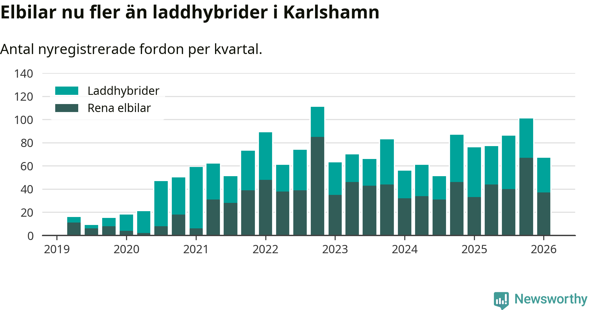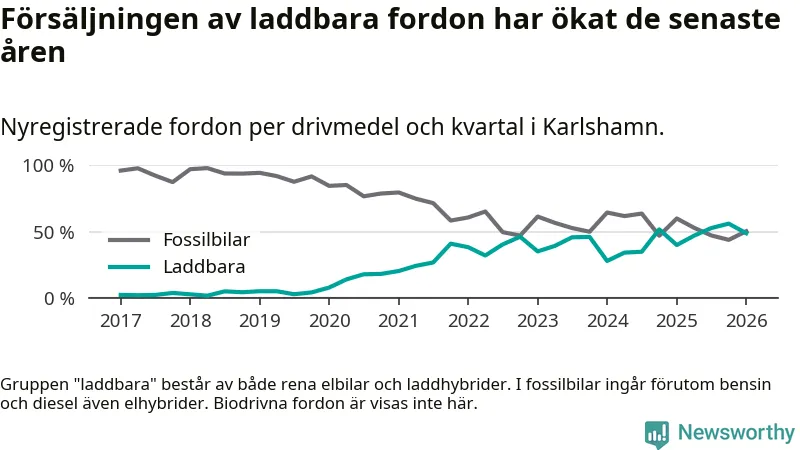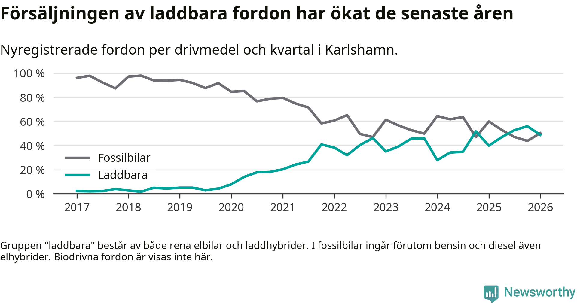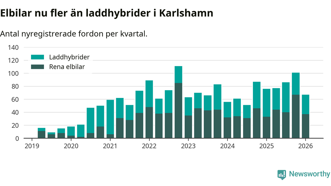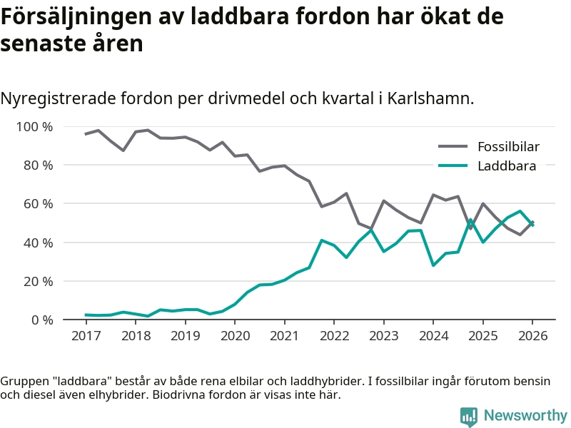 I Karlshamn minskade andelen laddbara bilar under första kvartalet jämfört med kvartalet innan (−7,2 procentenheter). Nyregistreringen peakade under fjärde kvartalet 2025 då 56 procent av de nya bilarna var laddbara.