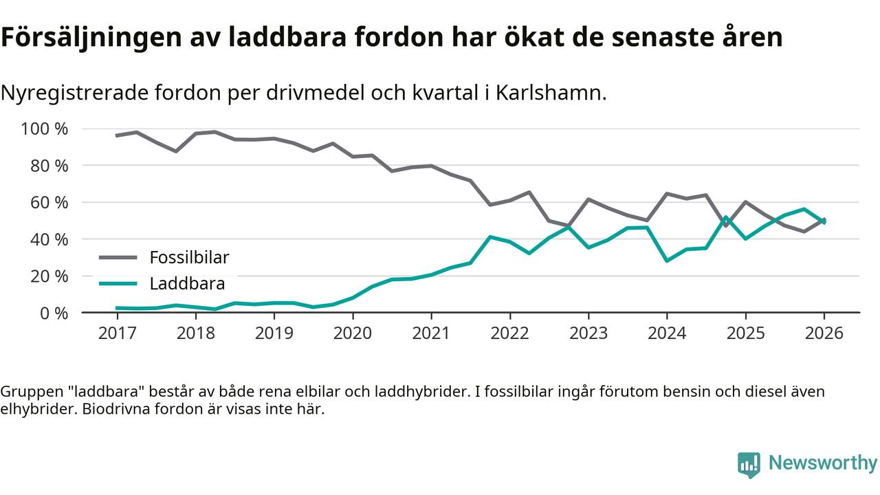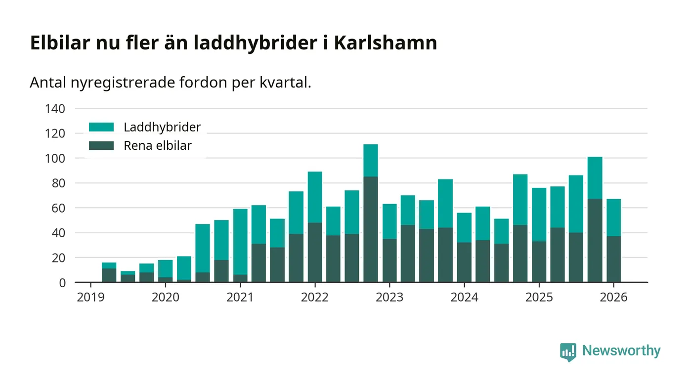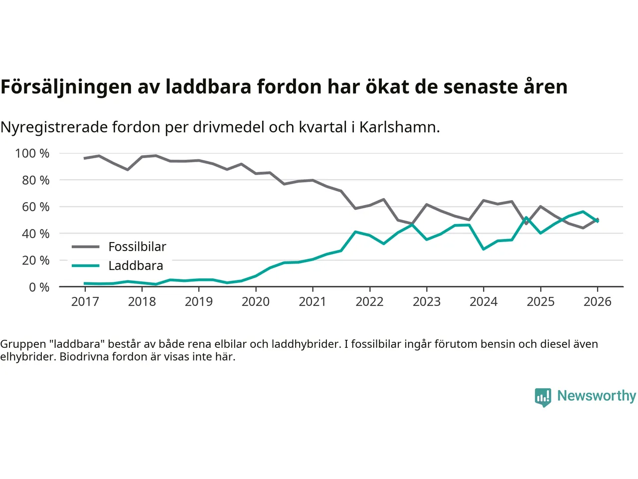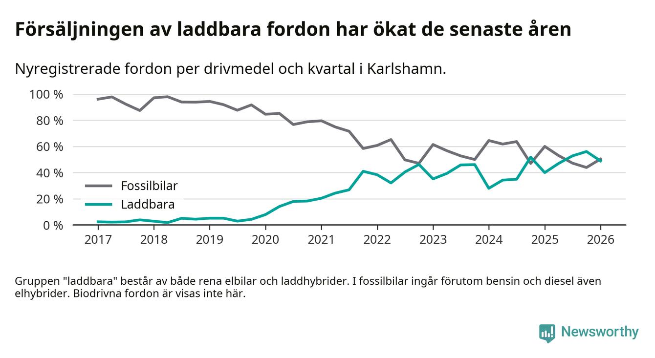 Under första kvartalet 2026 var 49 procent av alla nyregistrerade personbilar i Karlshamn laddbara (sammanlagt registrerades 137 nya bilar). Merparten av de laddbara bilarna var rena elbilar (27 procent av alla).