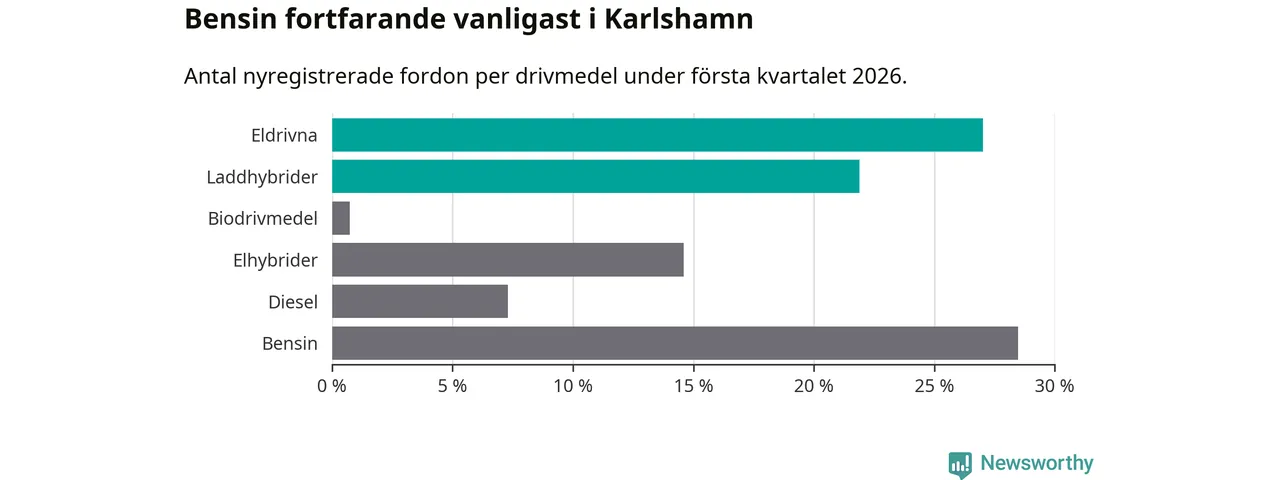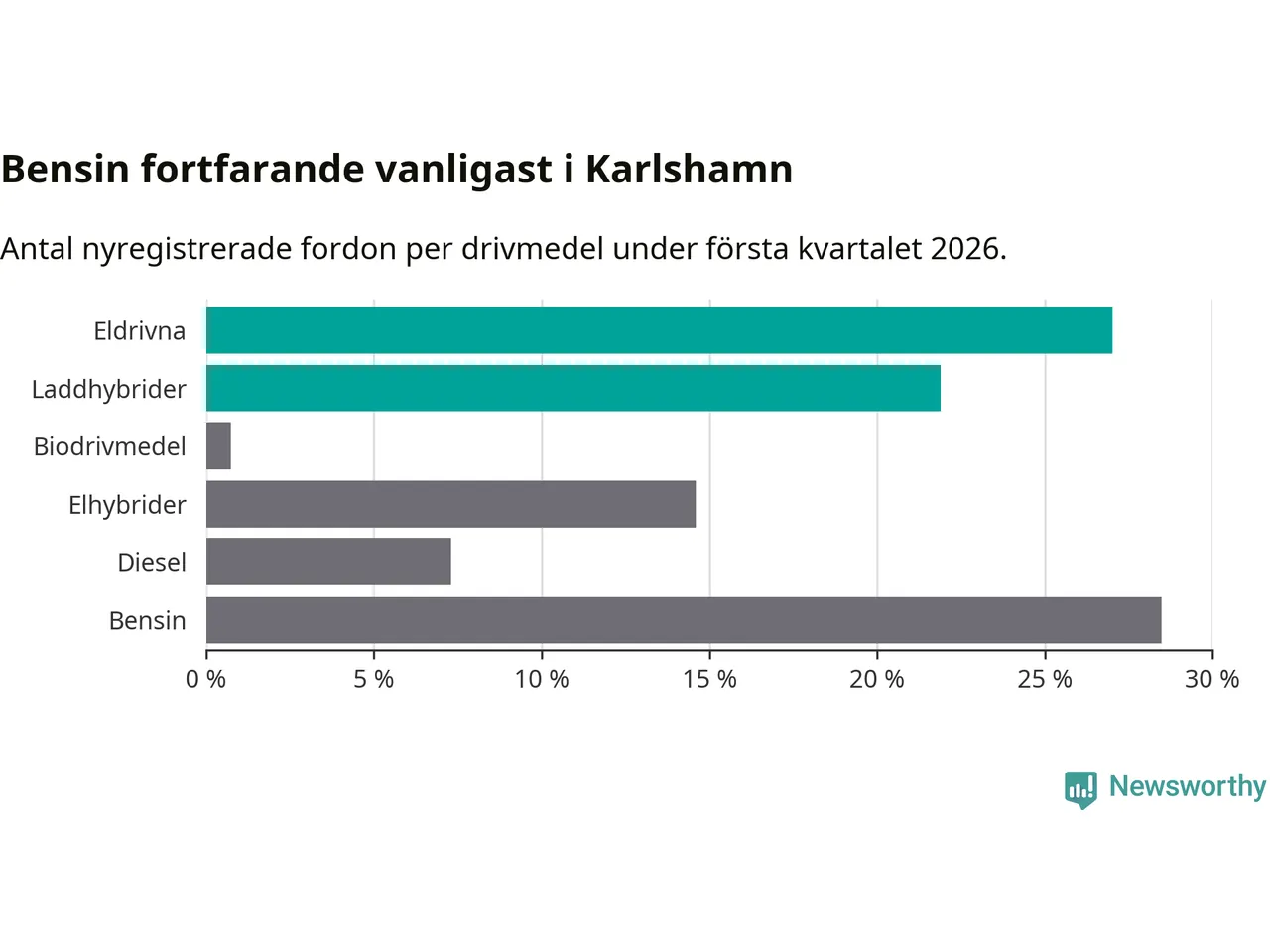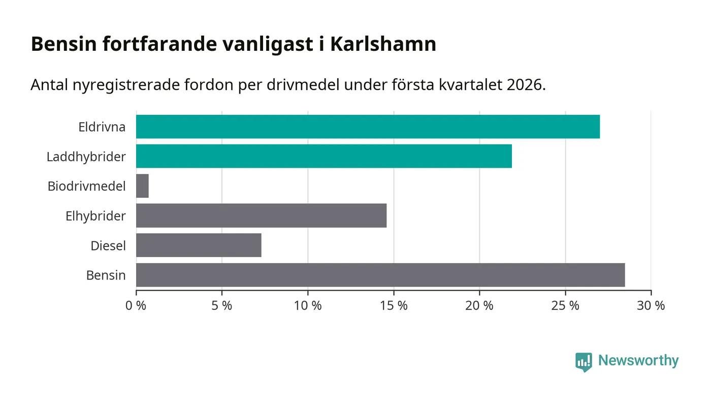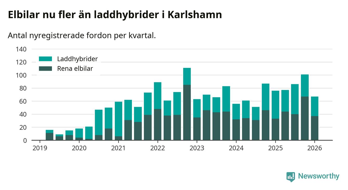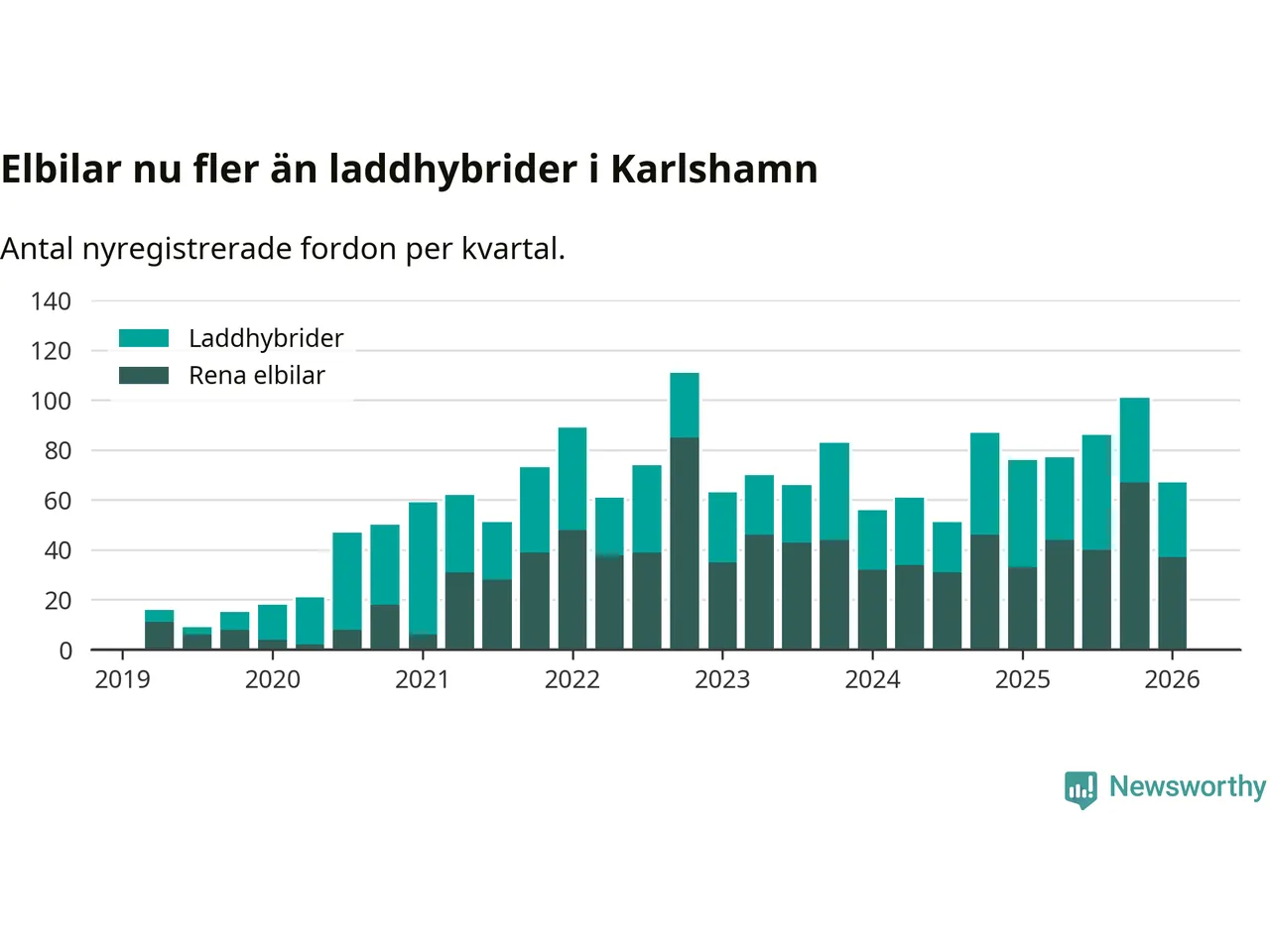 Under första kvartalet 2026 var 49 procent av alla nyregistrerade personbilar i Karlshamn laddbara (sammanlagt registrerades 137 nya bilar). Merparten av de laddbara bilarna var rena elbilar (27 procent av alla).