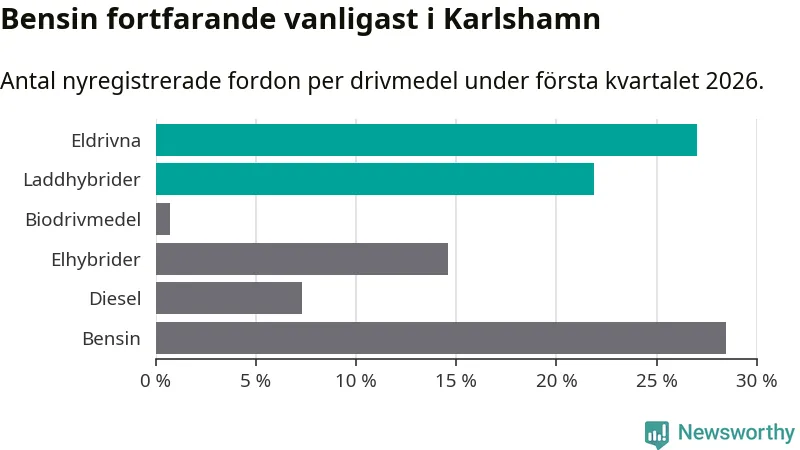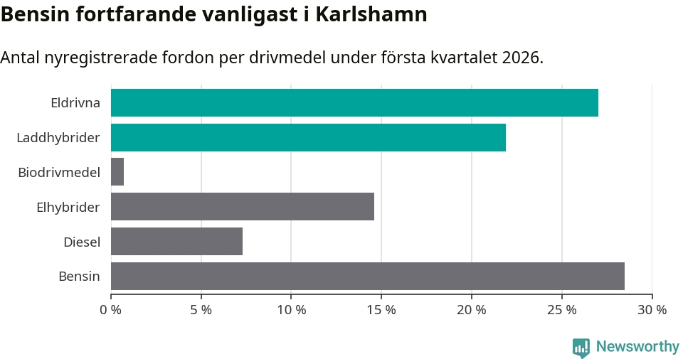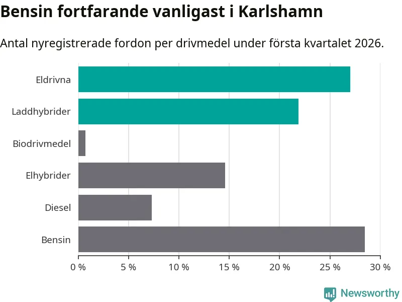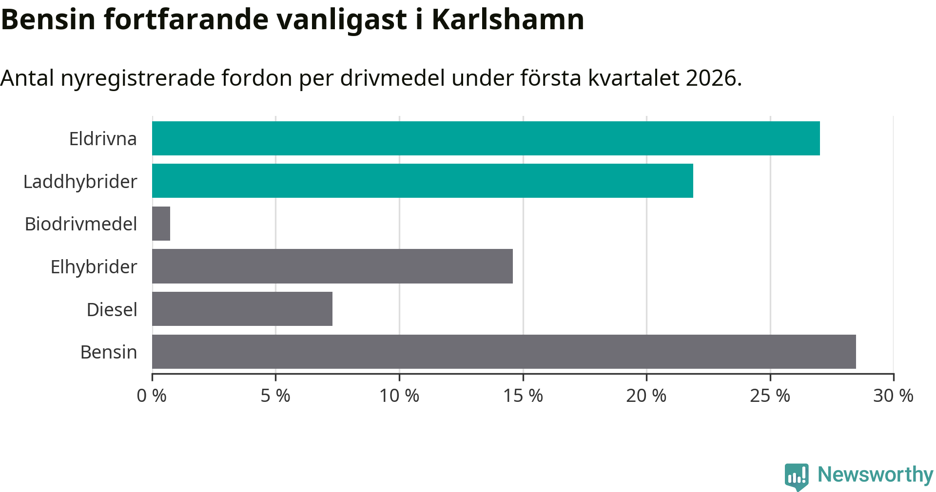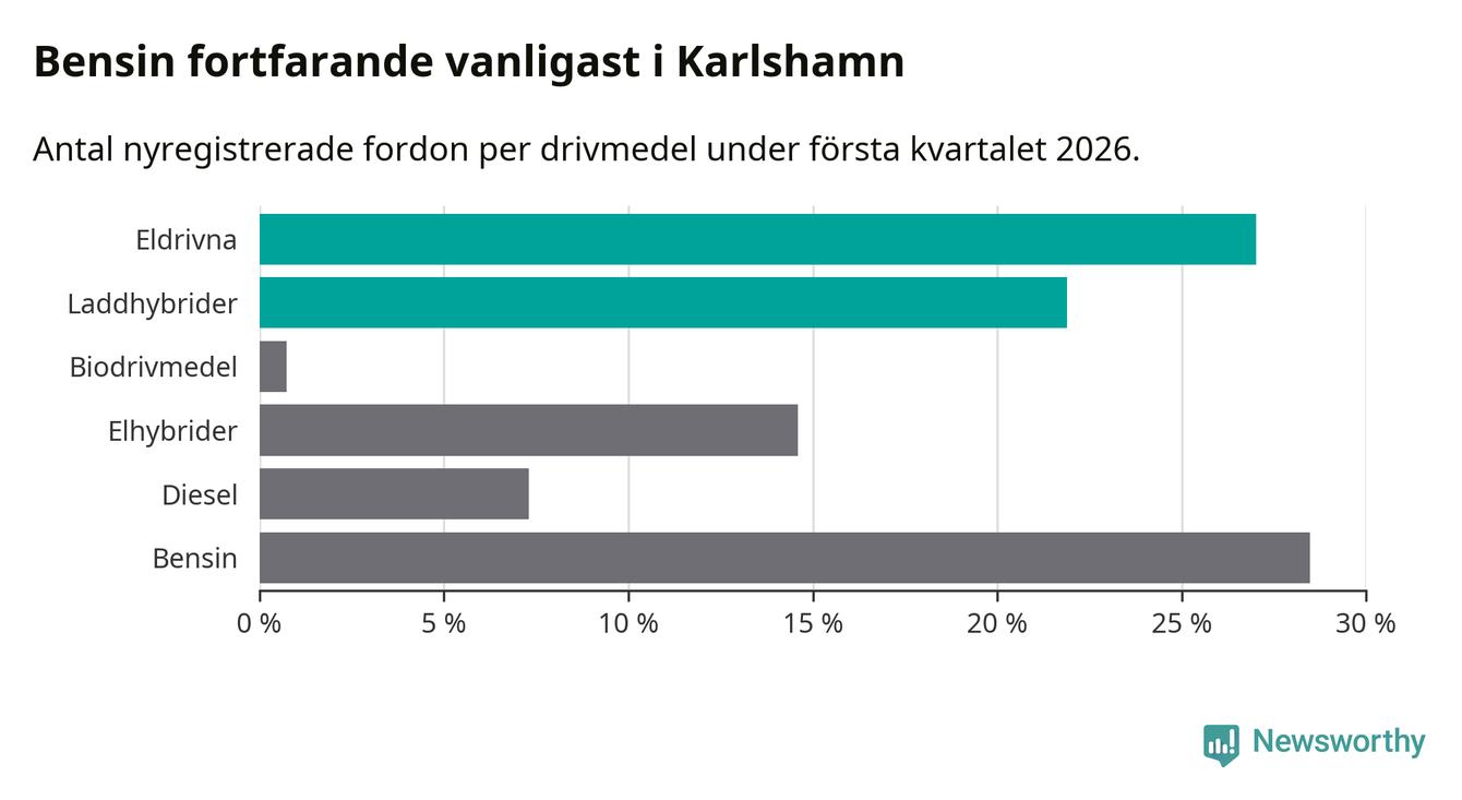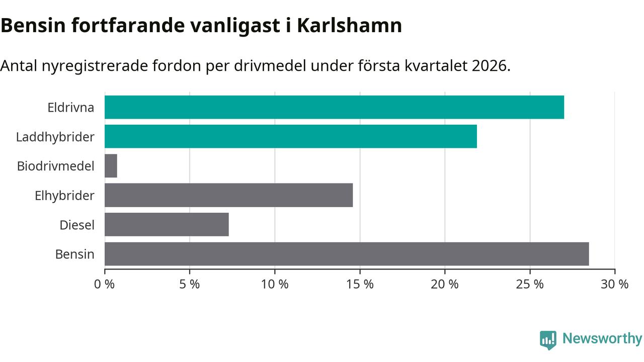 Under första kvartalet 2026 var 49 procent av alla nyregistrerade personbilar i Karlshamn laddbara (sammanlagt registrerades 137 nya bilar). Merparten av de laddbara bilarna var rena elbilar (27 procent av alla).