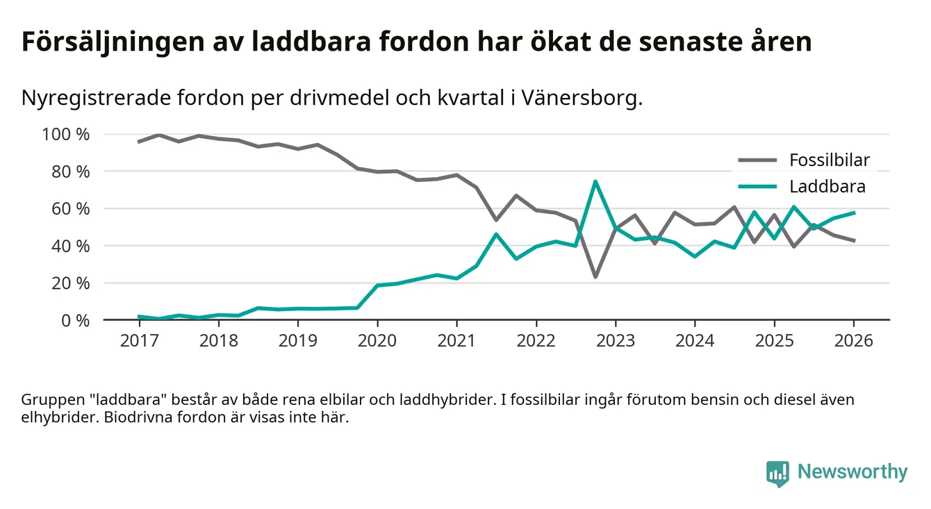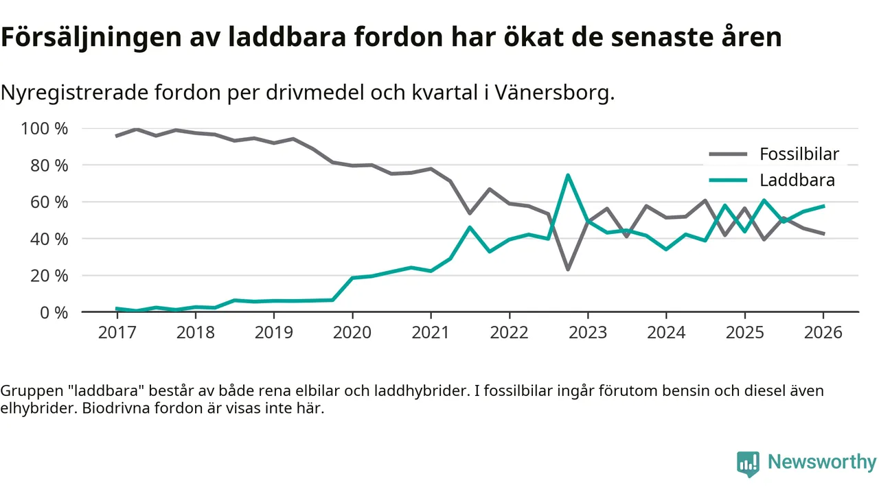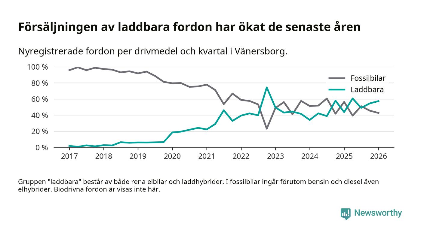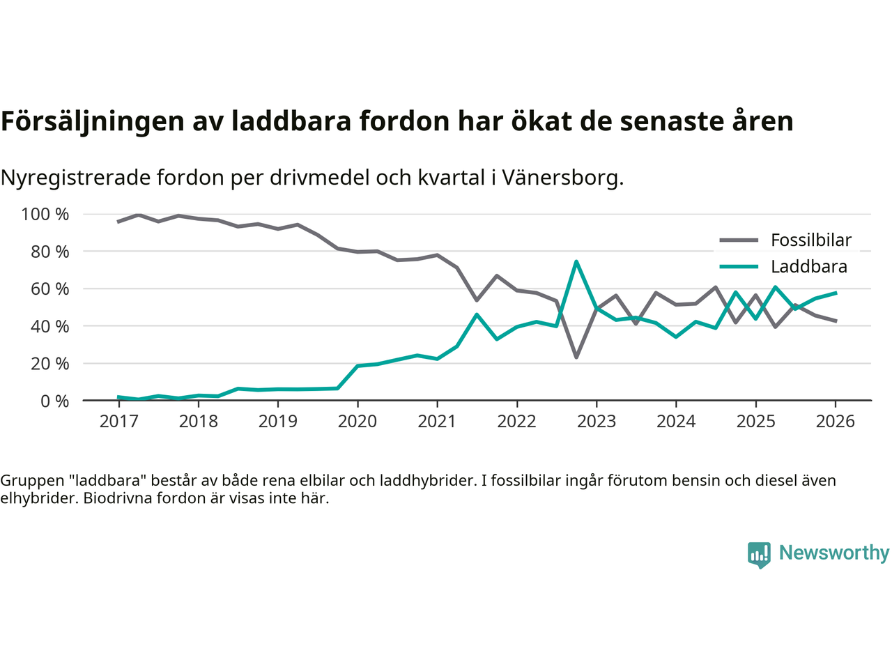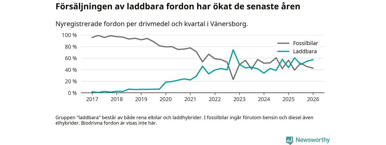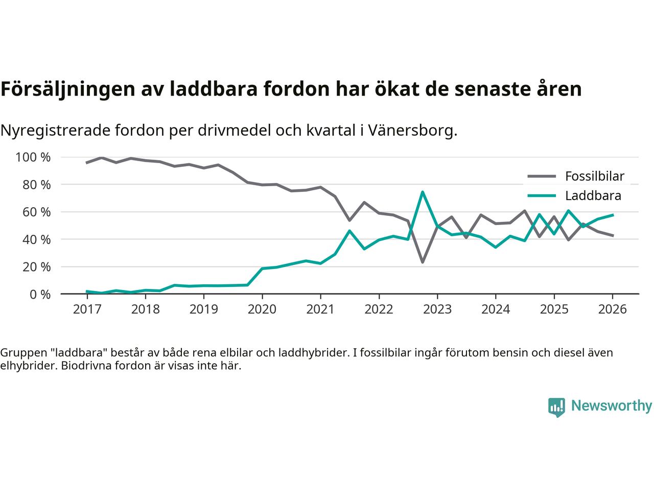 Under första kvartalet 2026 var 57 procent av alla nyregistrerade personbilar i Vänersborg laddbara (sammanlagt registrerades 176 nya bilar). Merparten av de laddbara bilarna var rena elbilar (41 procent av alla).