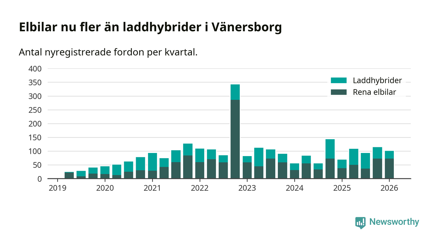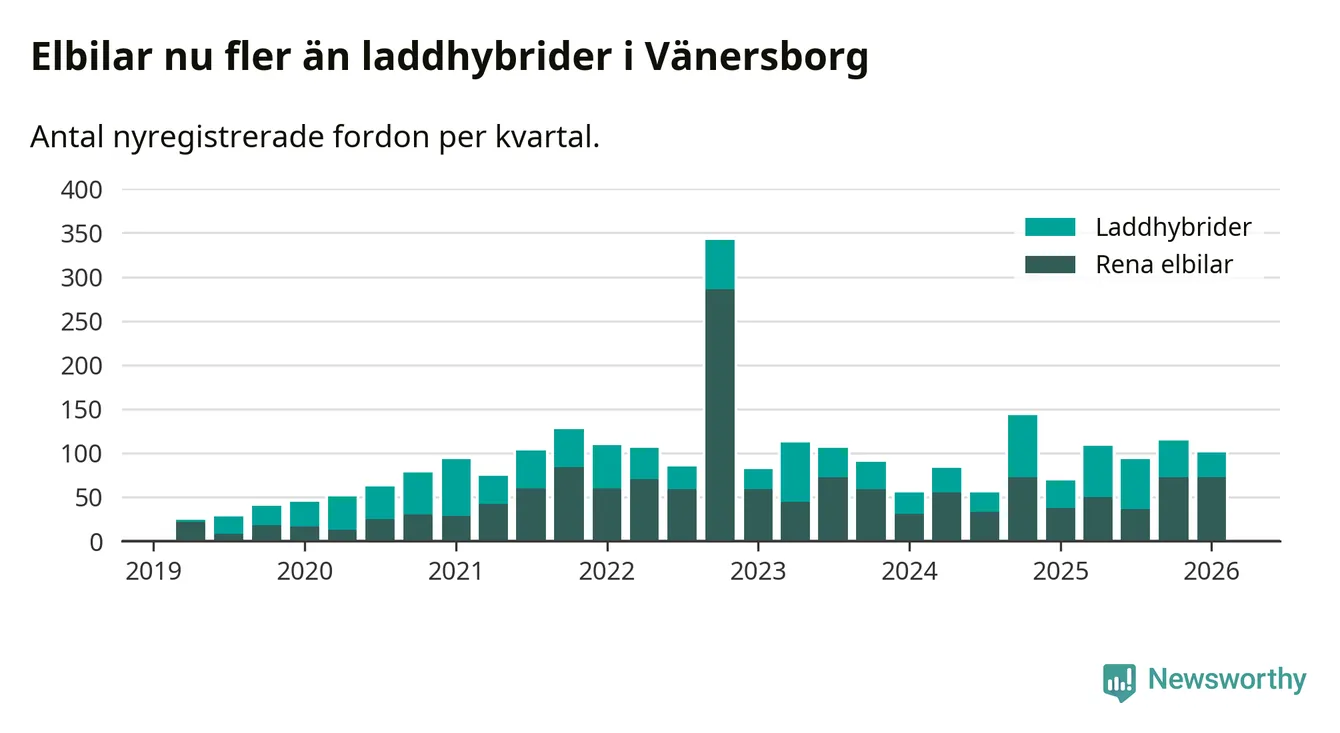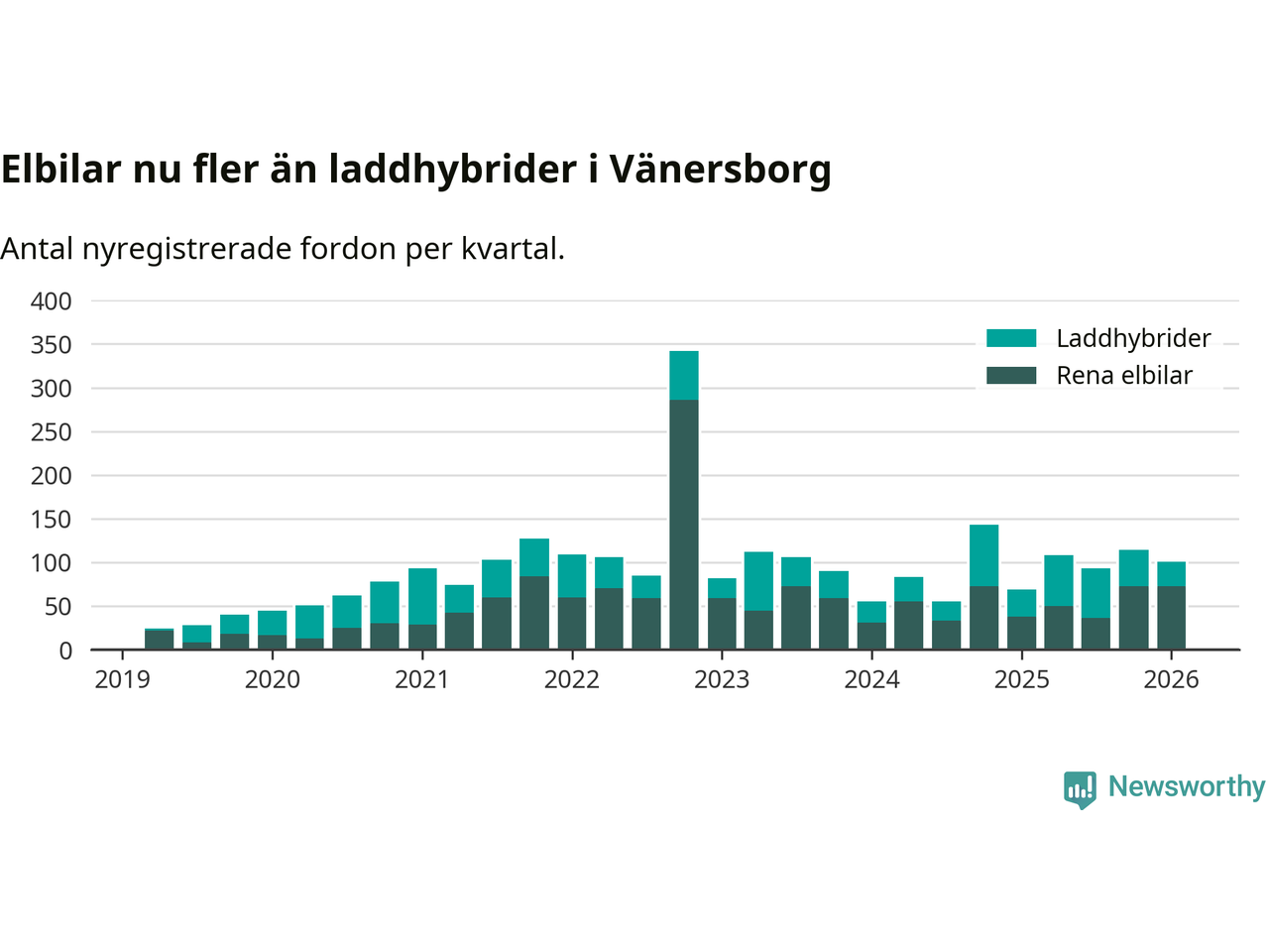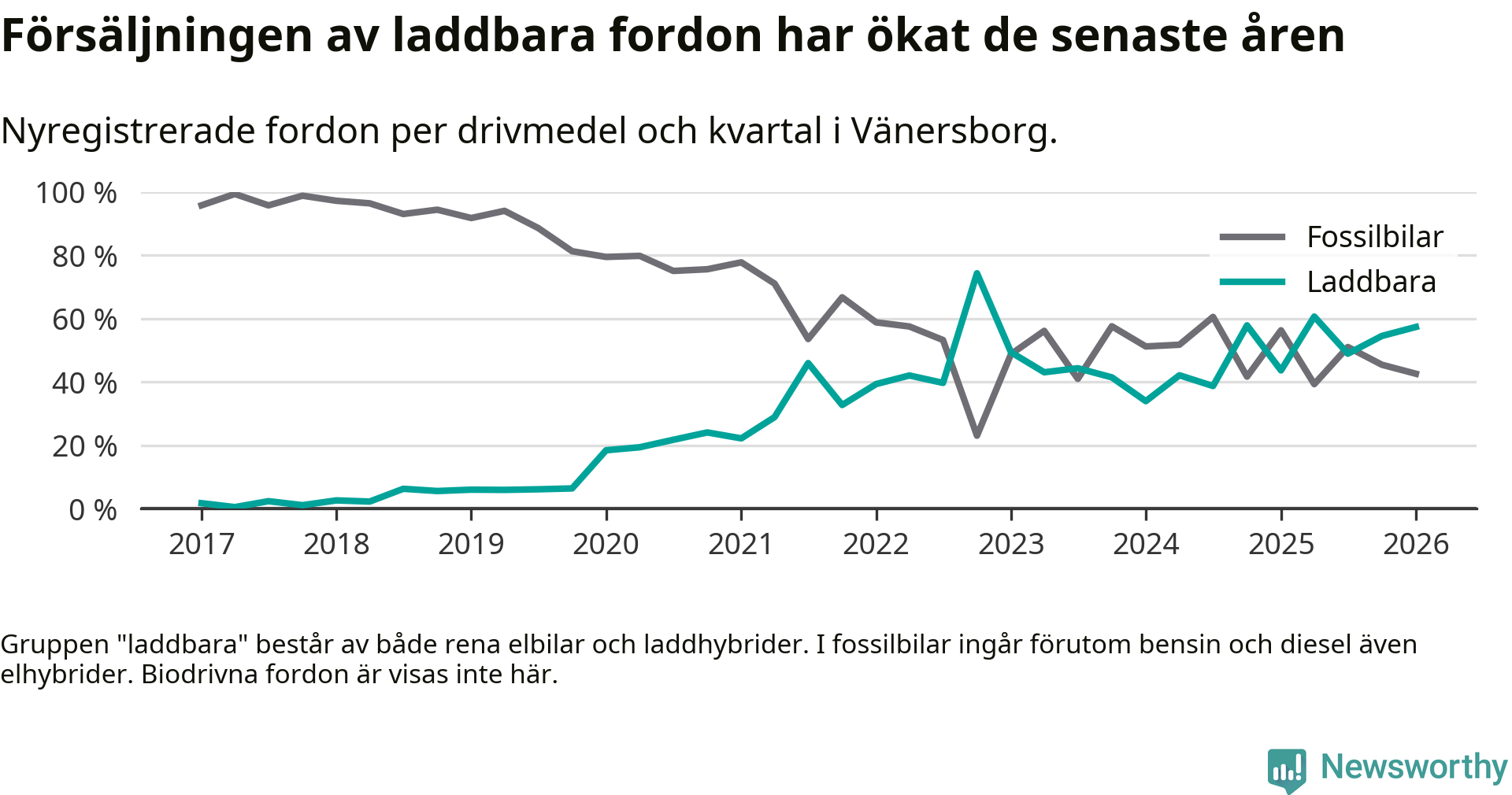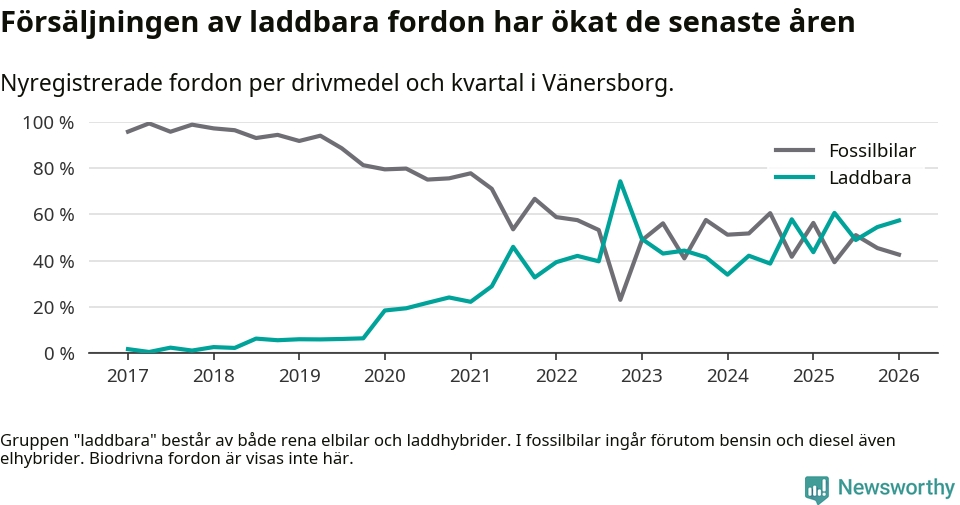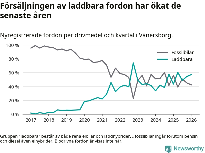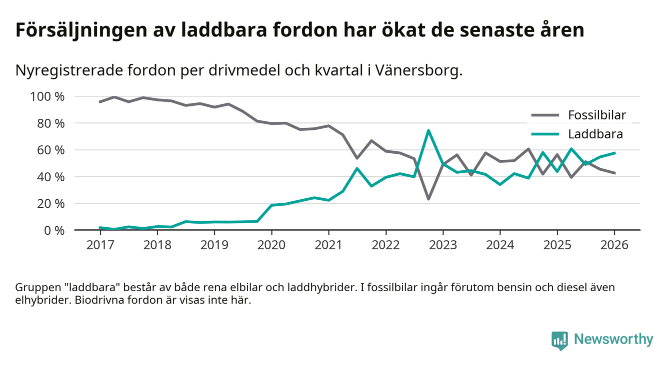 Under första kvartalet 2026 var 57 procent av alla nyregistrerade personbilar i Vänersborg laddbara (sammanlagt registrerades 176 nya bilar). Merparten av de laddbara bilarna var rena elbilar (41 procent av alla).