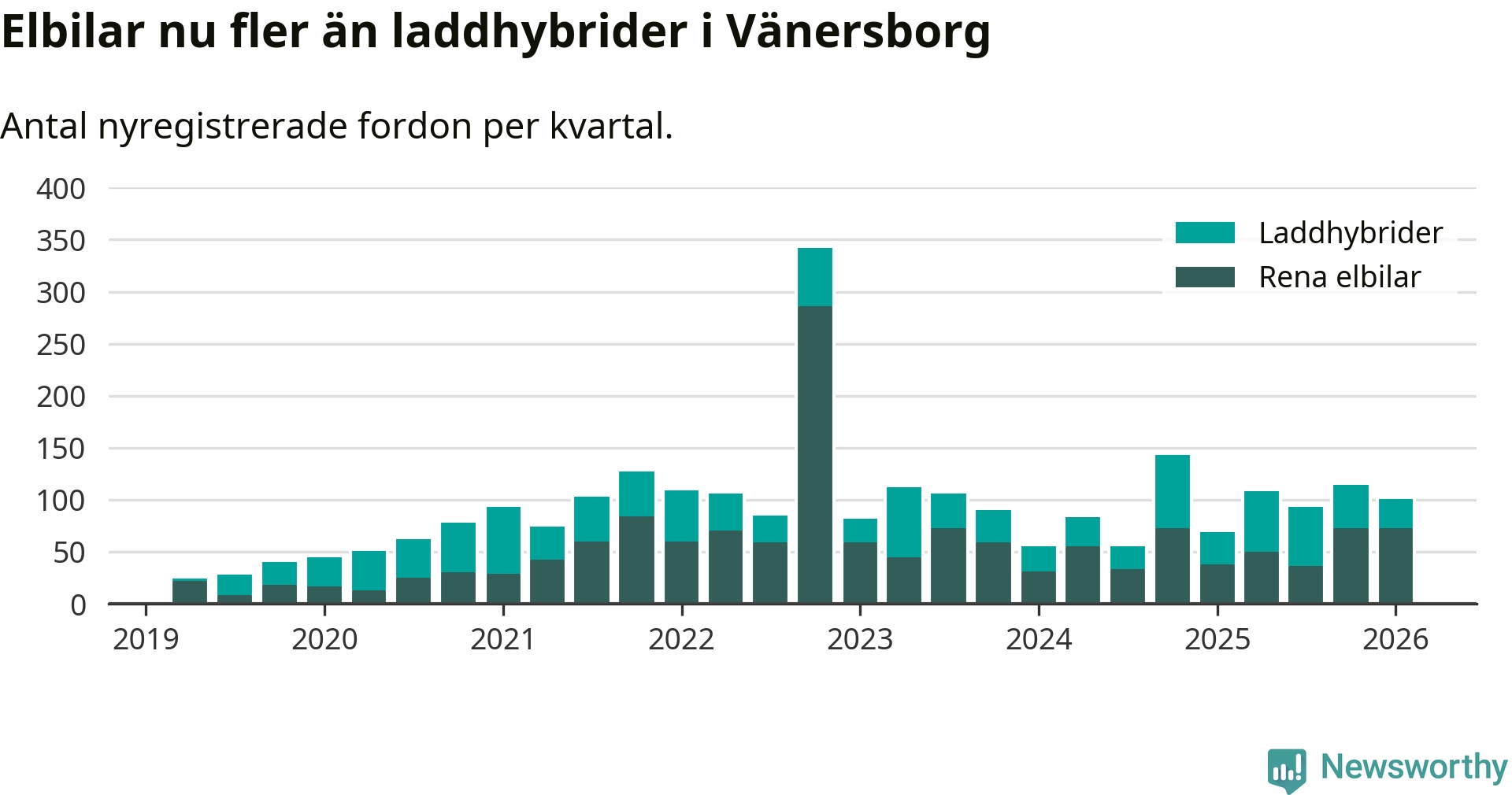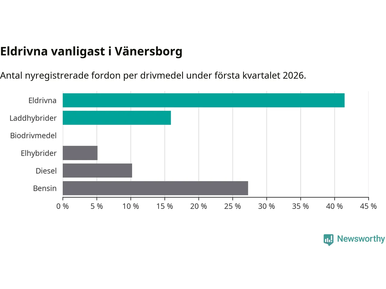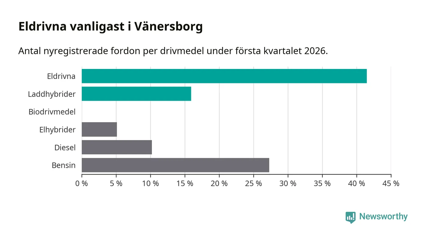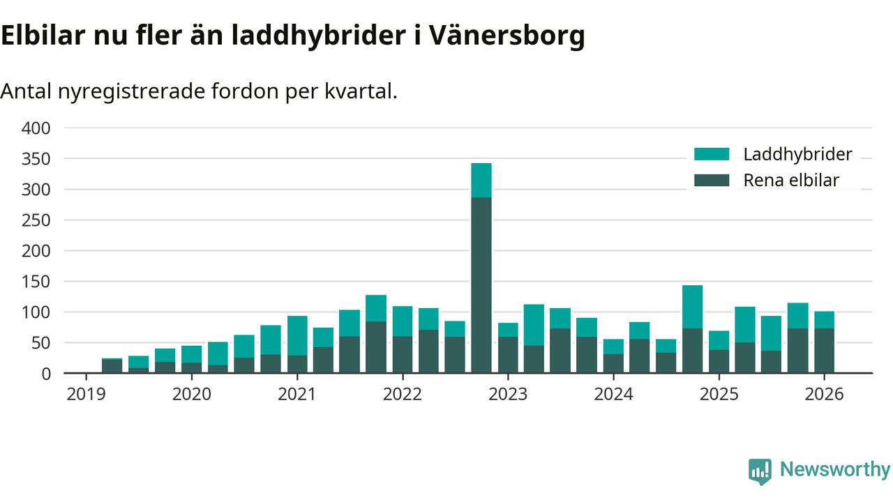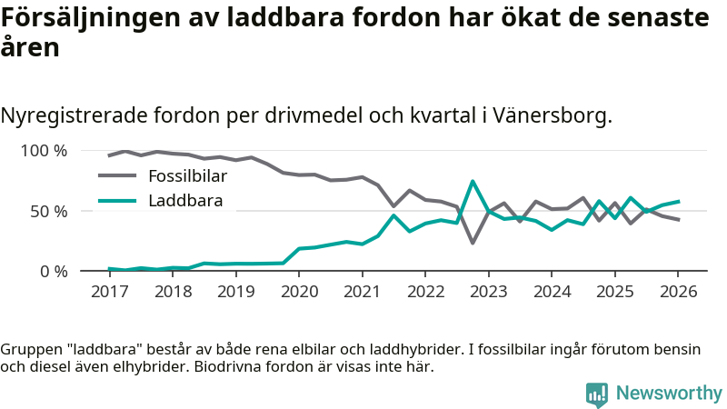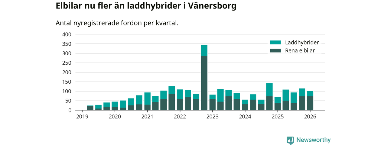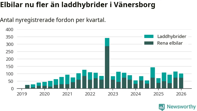 Under första kvartalet 2026 var 57 procent av alla nyregistrerade personbilar i Vänersborg laddbara (sammanlagt registrerades 176 nya bilar). Merparten av de laddbara bilarna var rena elbilar (41 procent av alla).
