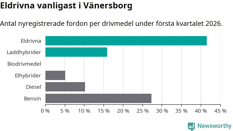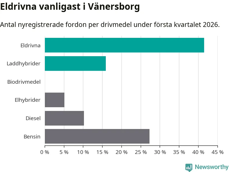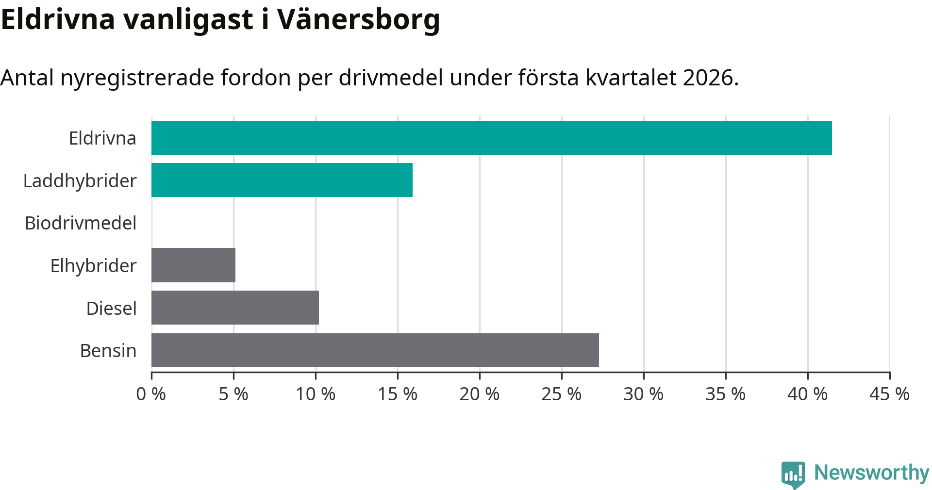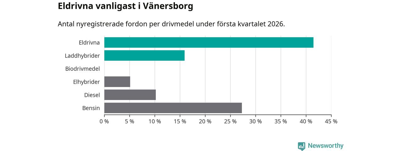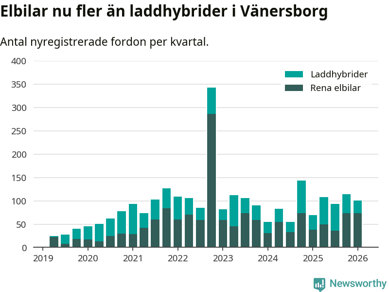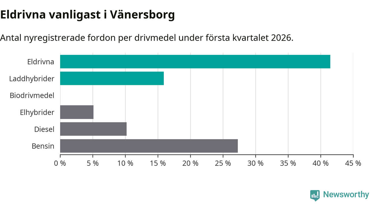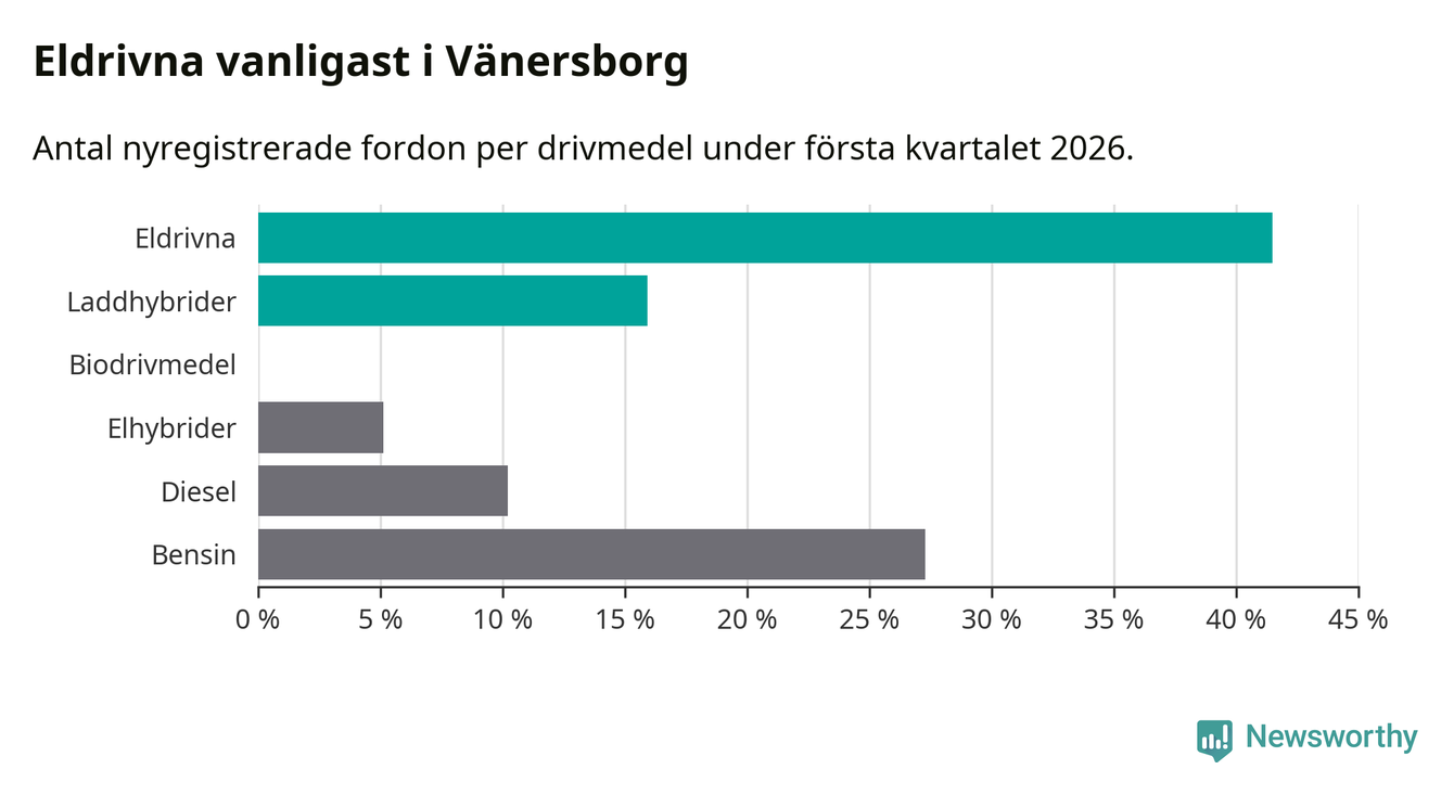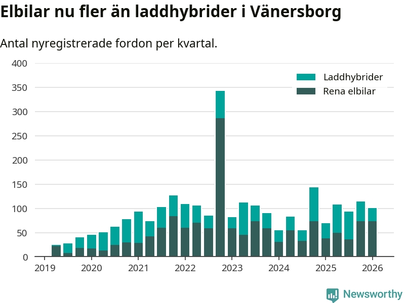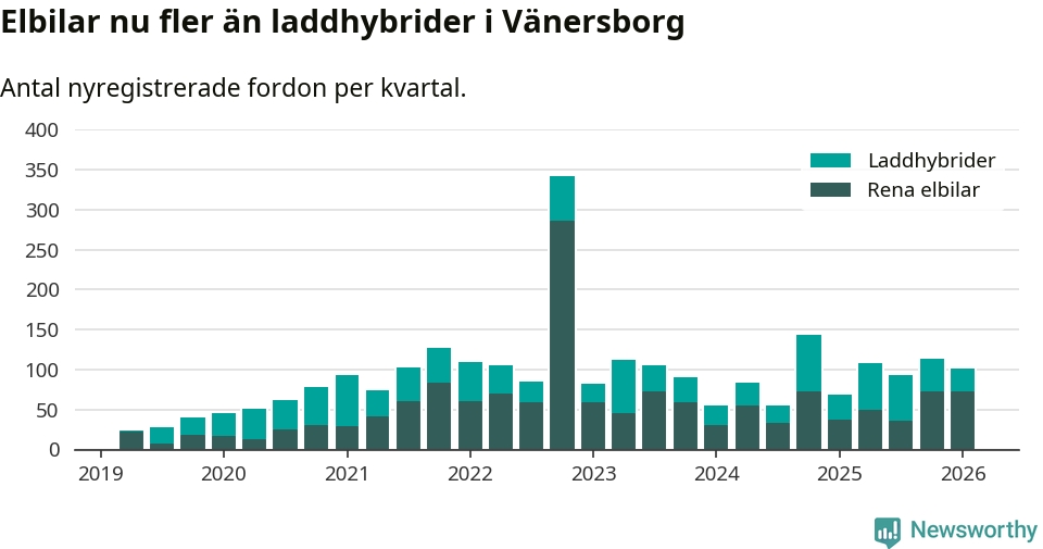 Under första kvartalet 2026 var 57 procent av alla nyregistrerade personbilar i Vänersborg laddbara (sammanlagt registrerades 176 nya bilar). Merparten av de laddbara bilarna var rena elbilar (41 procent av alla).
