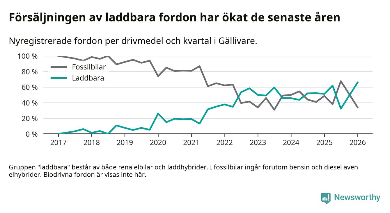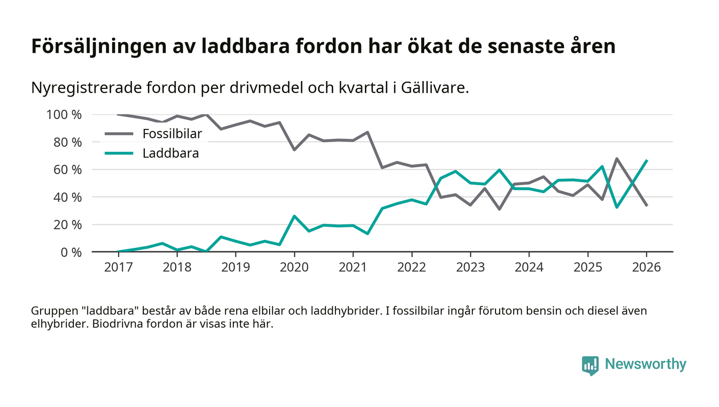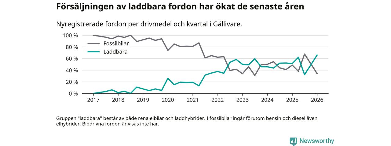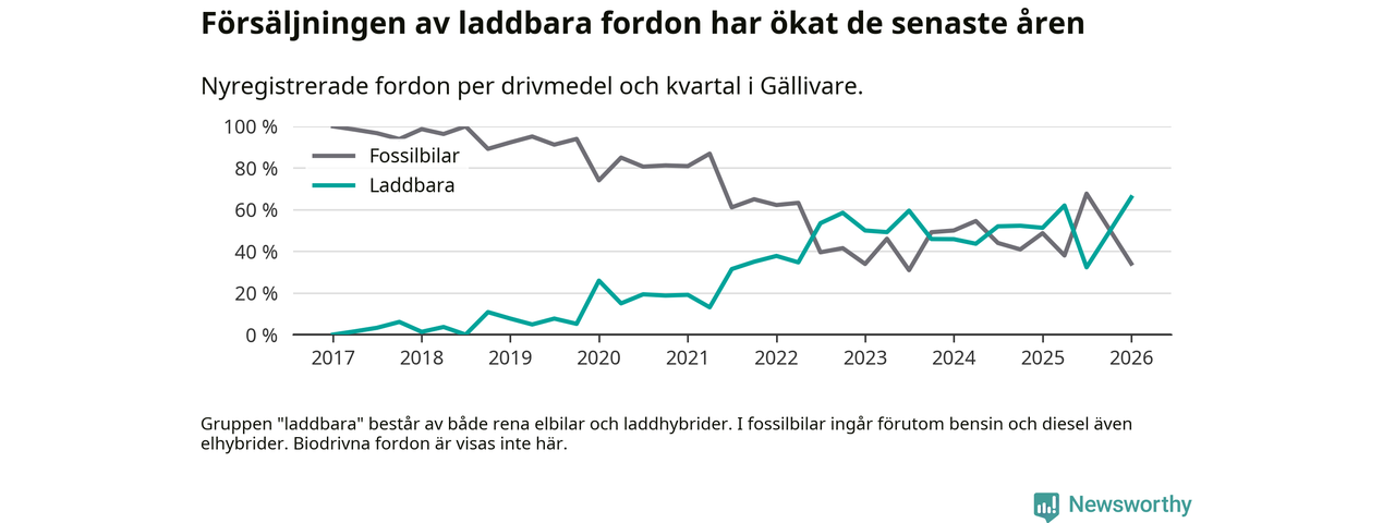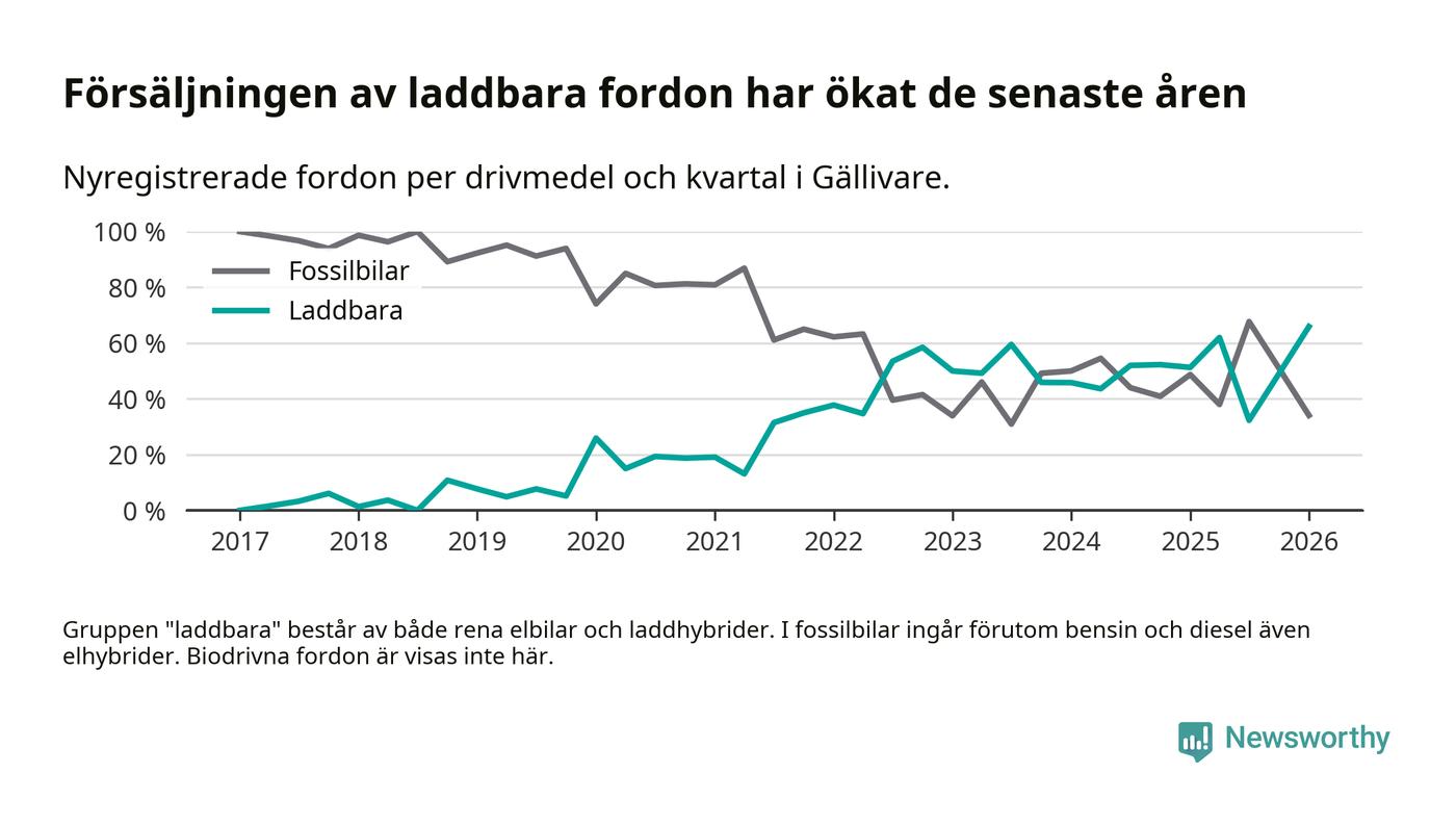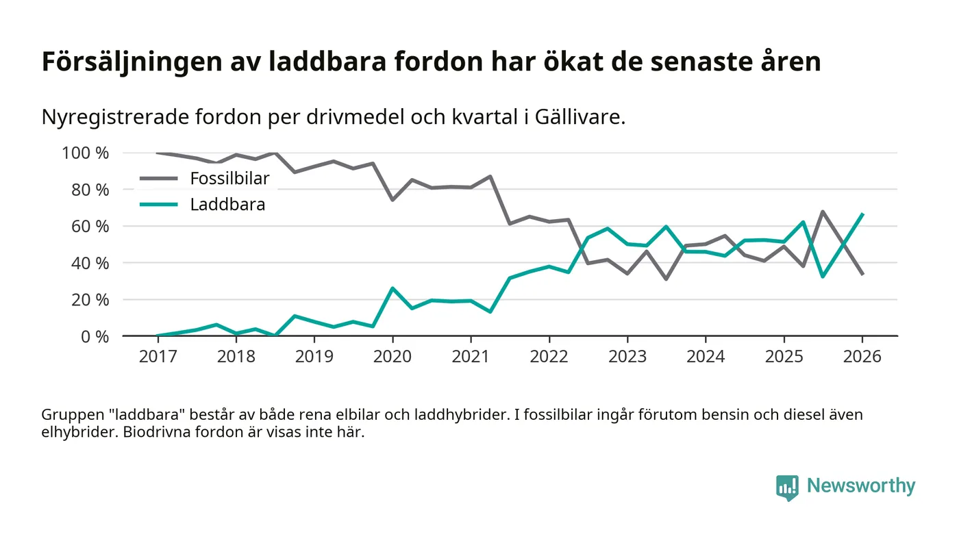 Under första kvartalet 2026 var 66 procent av alla nyregistrerade personbilar i Gällivare laddbara (sammanlagt registrerades 44 nya bilar). Merparten av de laddbara bilarna var rena elbilar (36 procent av alla).