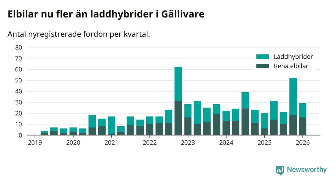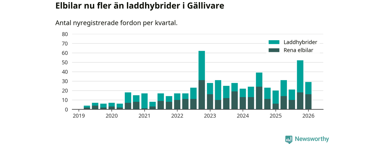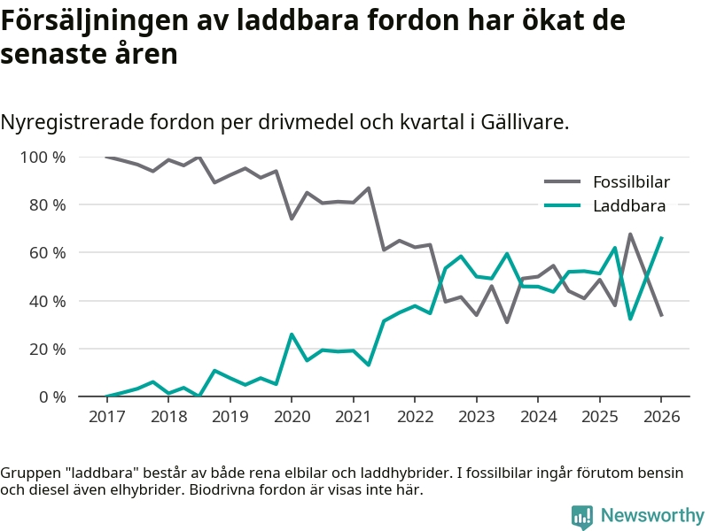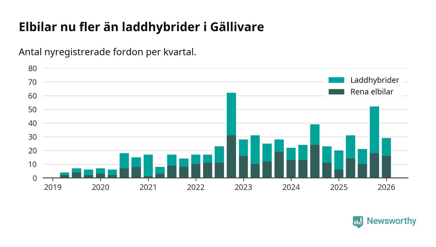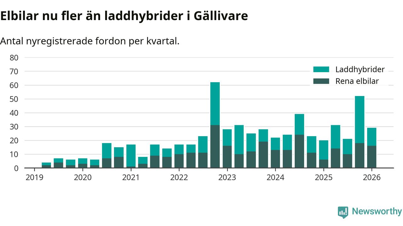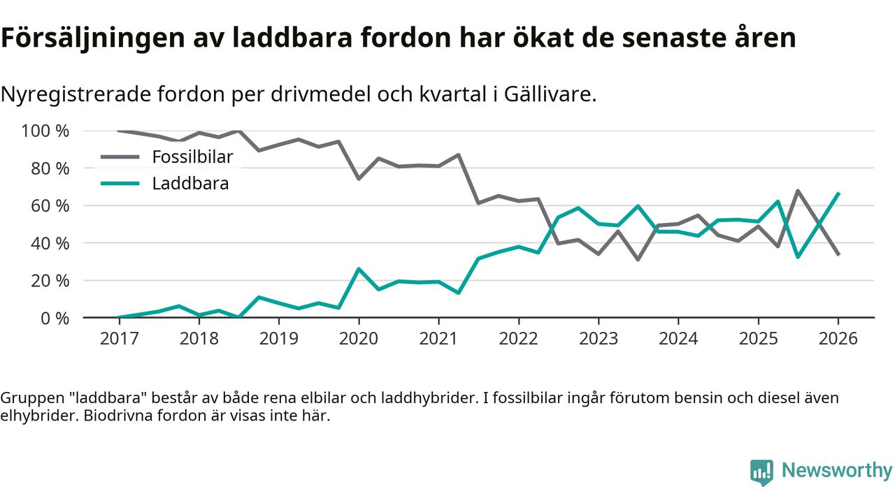 Under första kvartalet 2026 var 66 procent av alla nyregistrerade personbilar i Gällivare laddbara (sammanlagt registrerades 44 nya bilar). Merparten av de laddbara bilarna var rena elbilar (36 procent av alla).