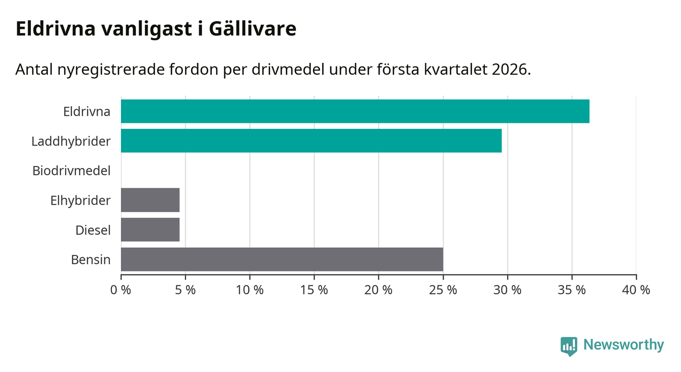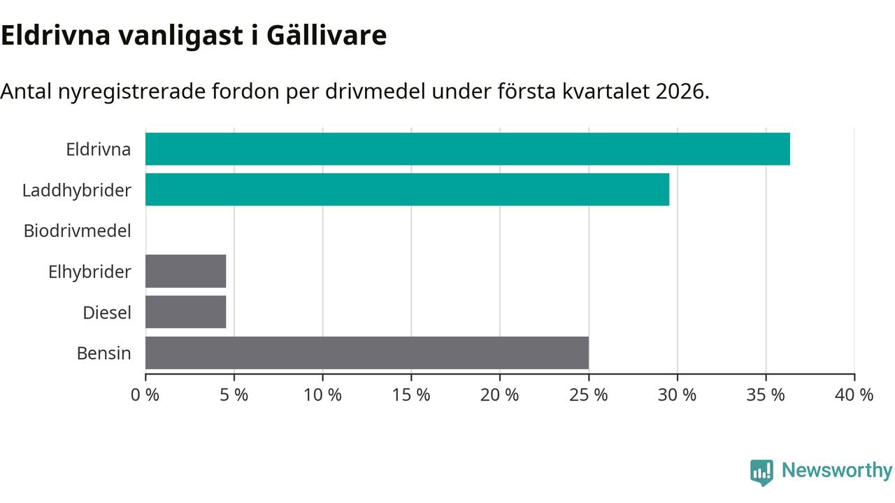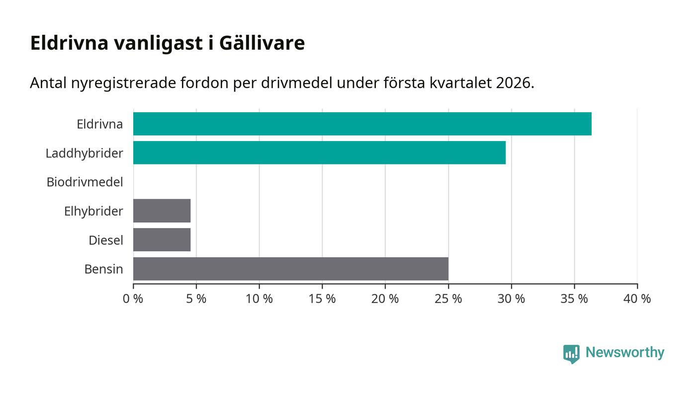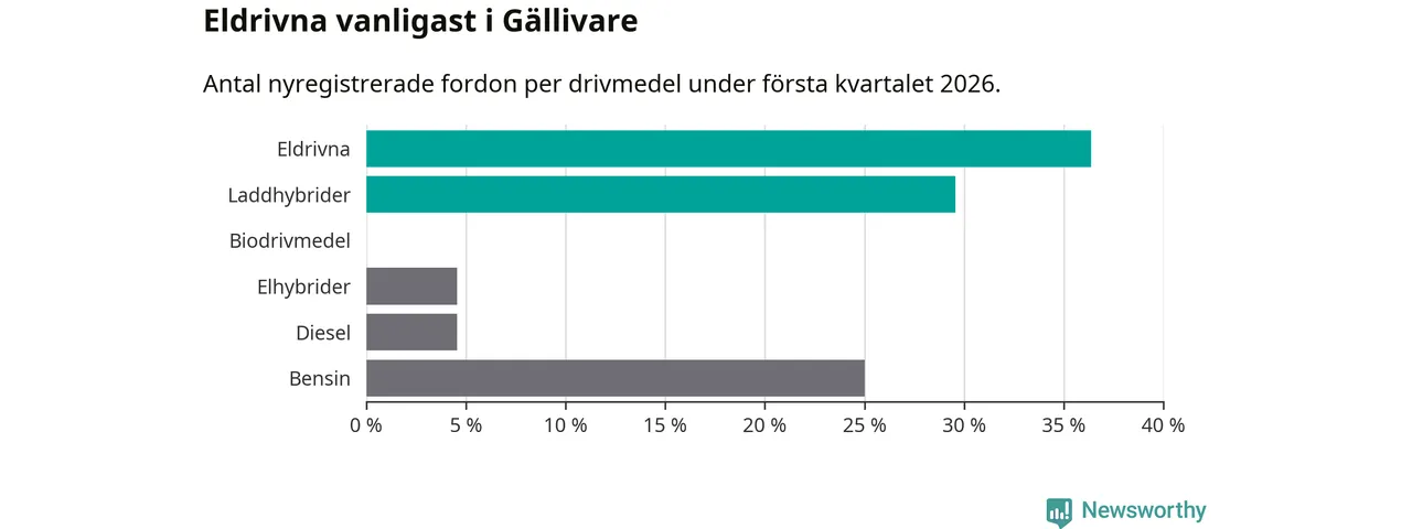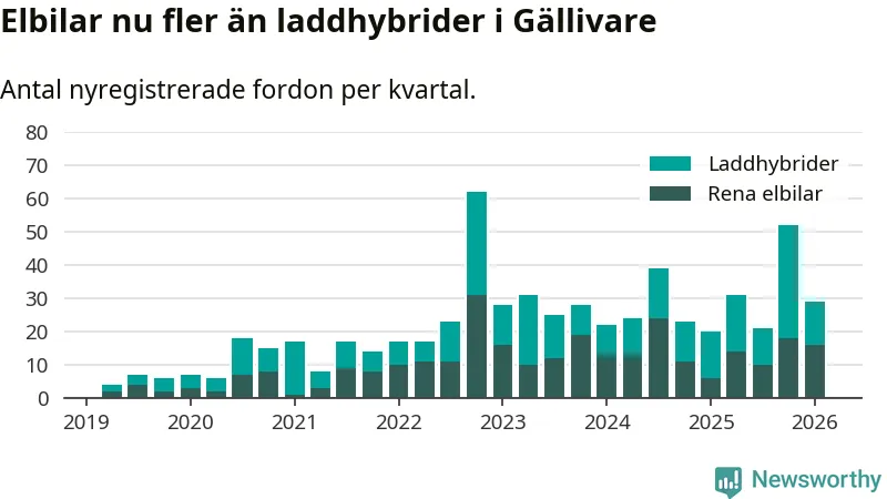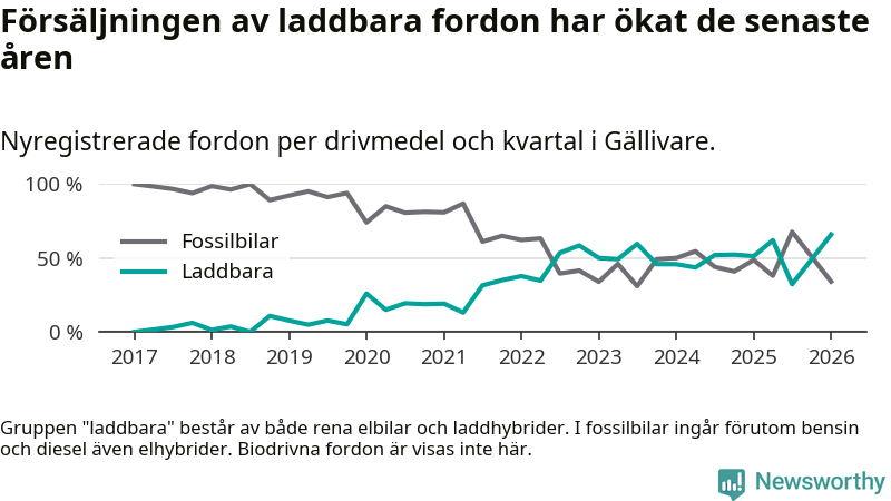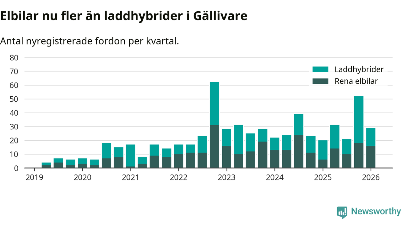Under första kvartalet 2026 var 66 procent av alla nyregistrerade personbilar i Gällivare laddbara (sammanlagt registrerades 44 nya bilar). Merparten av de laddbara bilarna var rena elbilar (36 procent av alla).