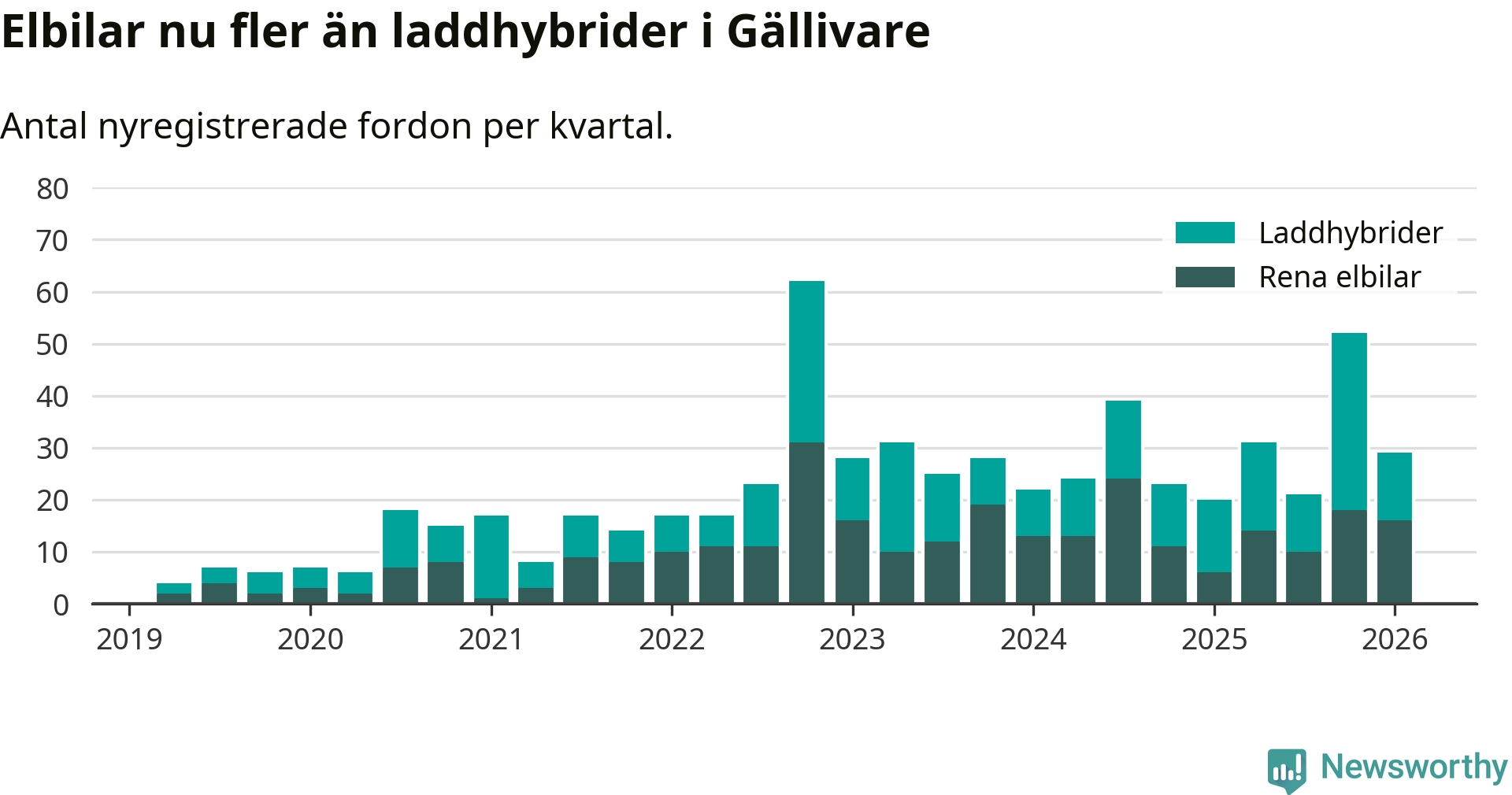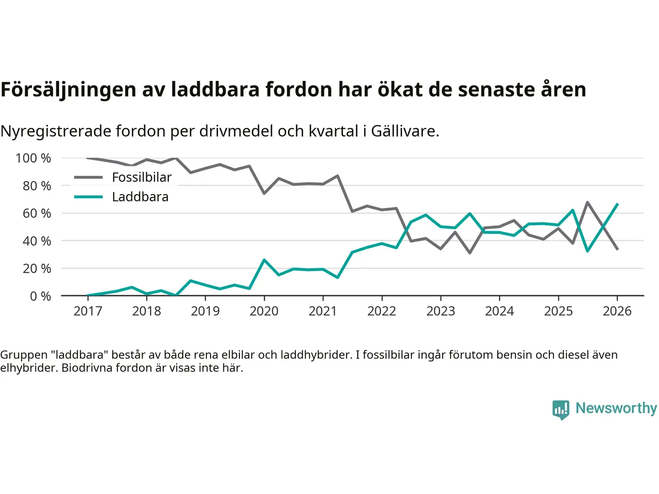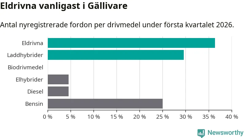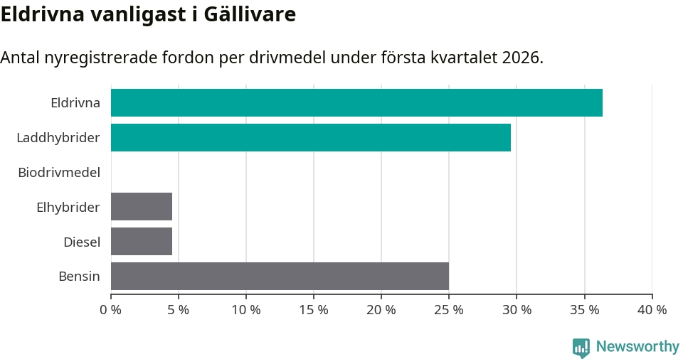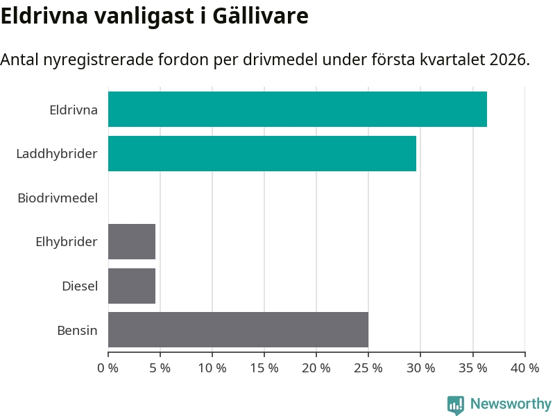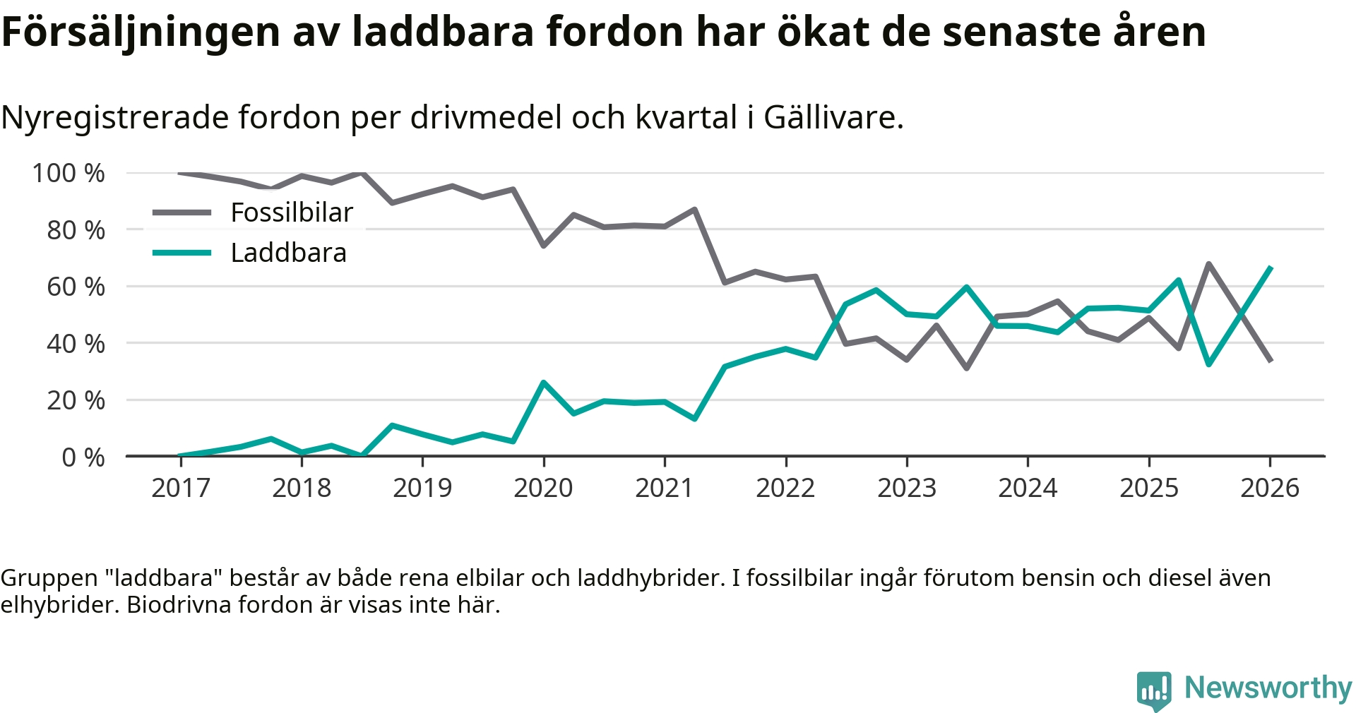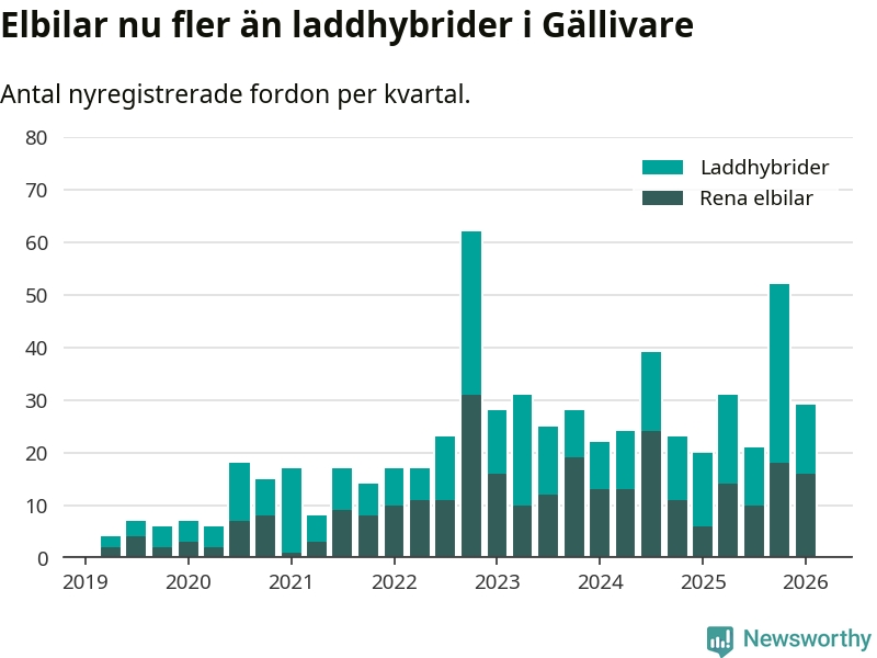 Under första kvartalet 2026 var 66 procent av alla nyregistrerade personbilar i Gällivare laddbara (sammanlagt registrerades 44 nya bilar). Merparten av de laddbara bilarna var rena elbilar (36 procent av alla).