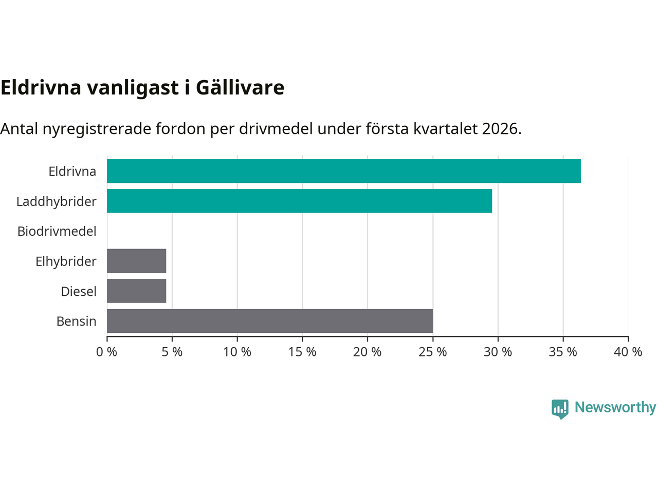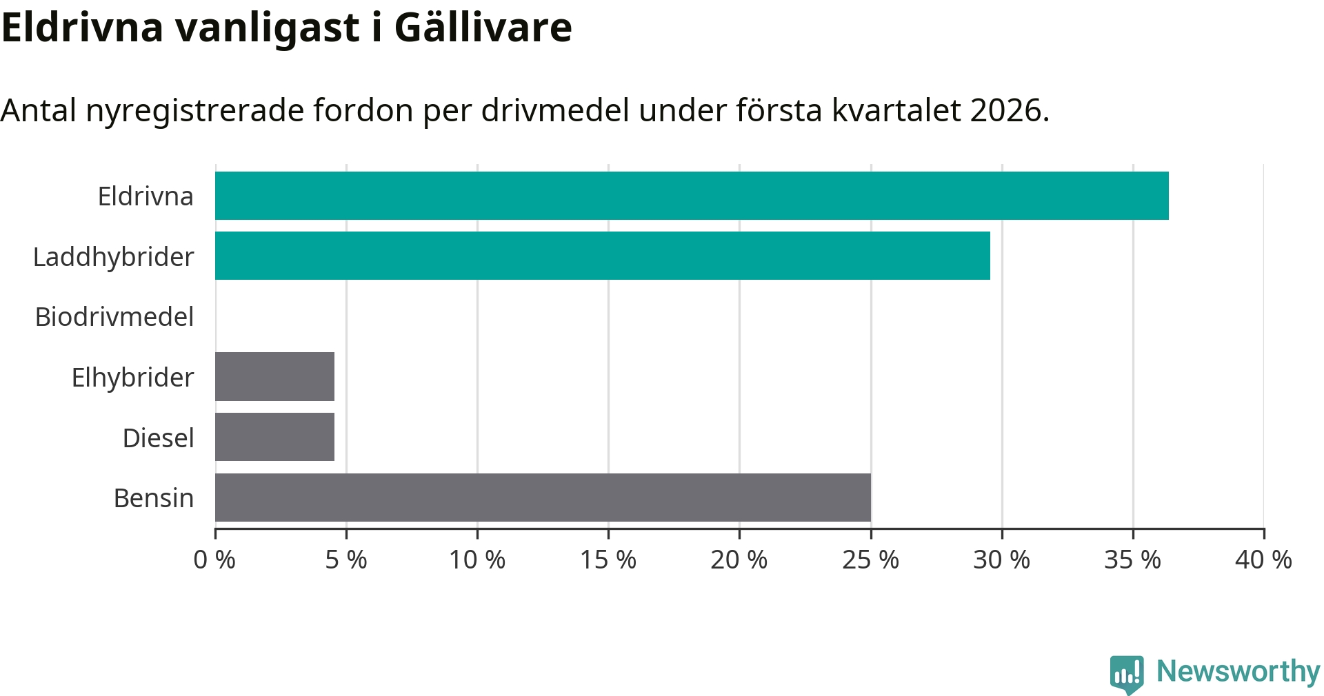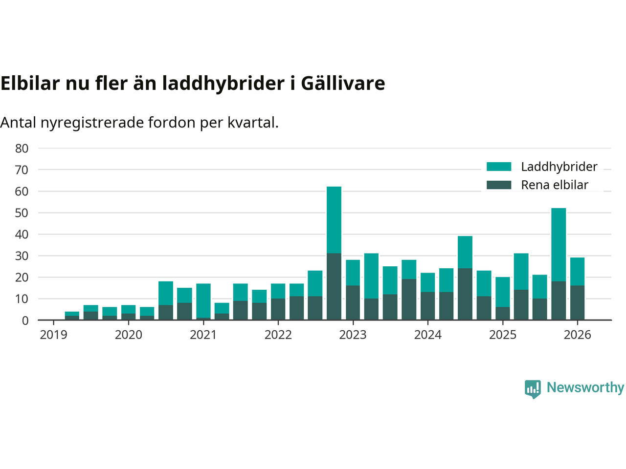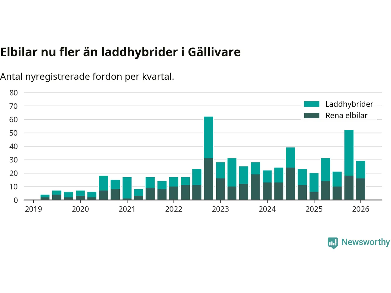 Under första kvartalet 2026 var 66 procent av alla nyregistrerade personbilar i Gällivare laddbara (sammanlagt registrerades 44 nya bilar). Merparten av de laddbara bilarna var rena elbilar (36 procent av alla).