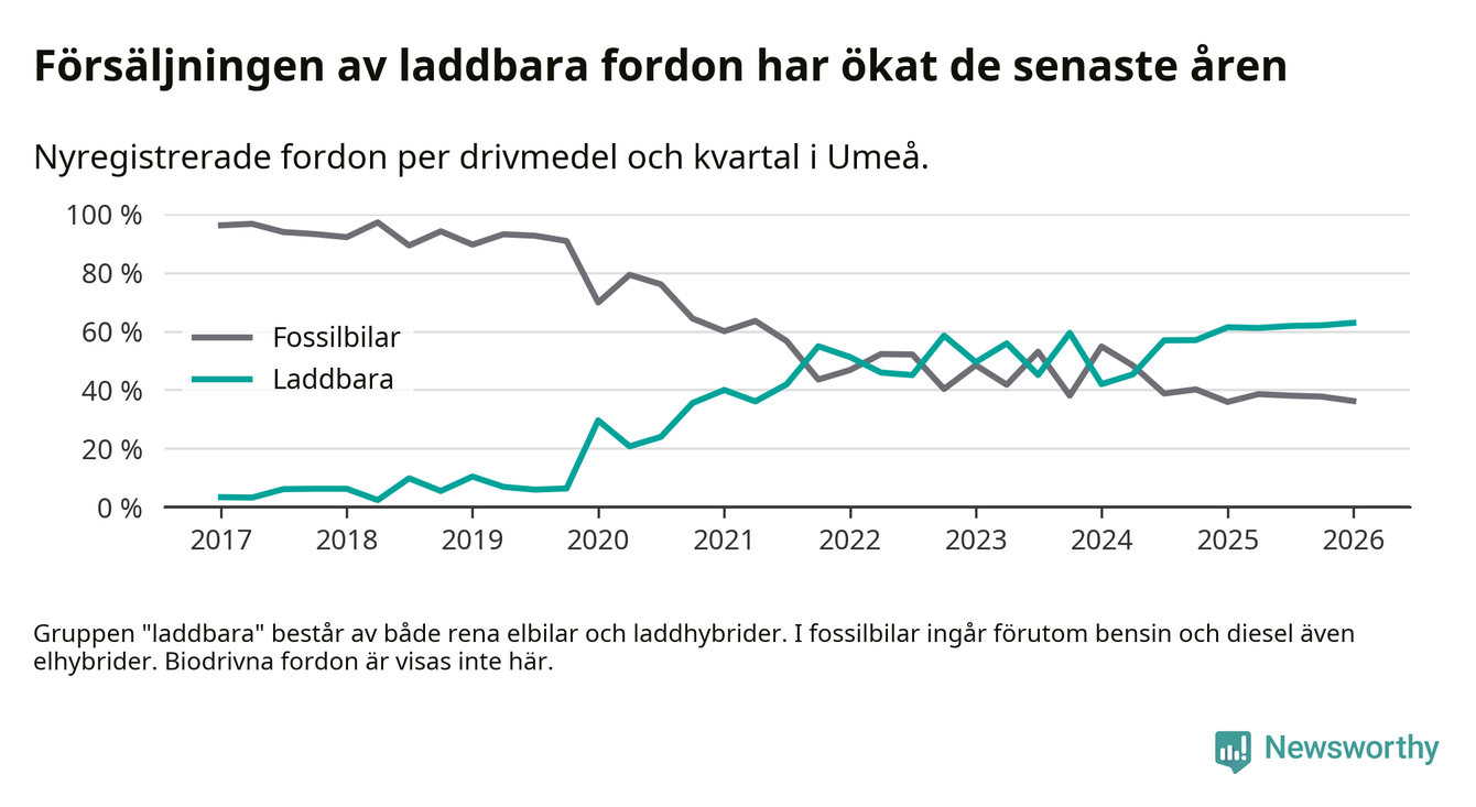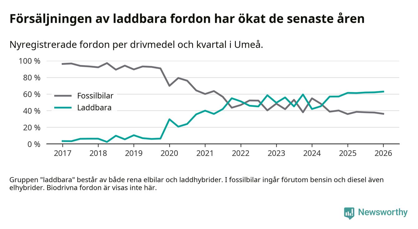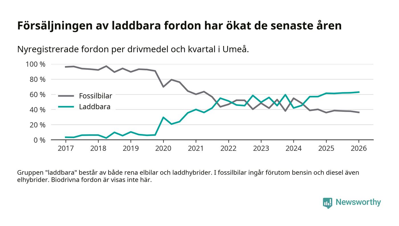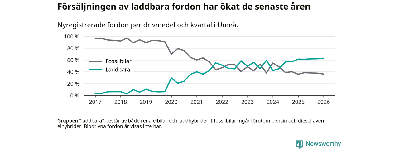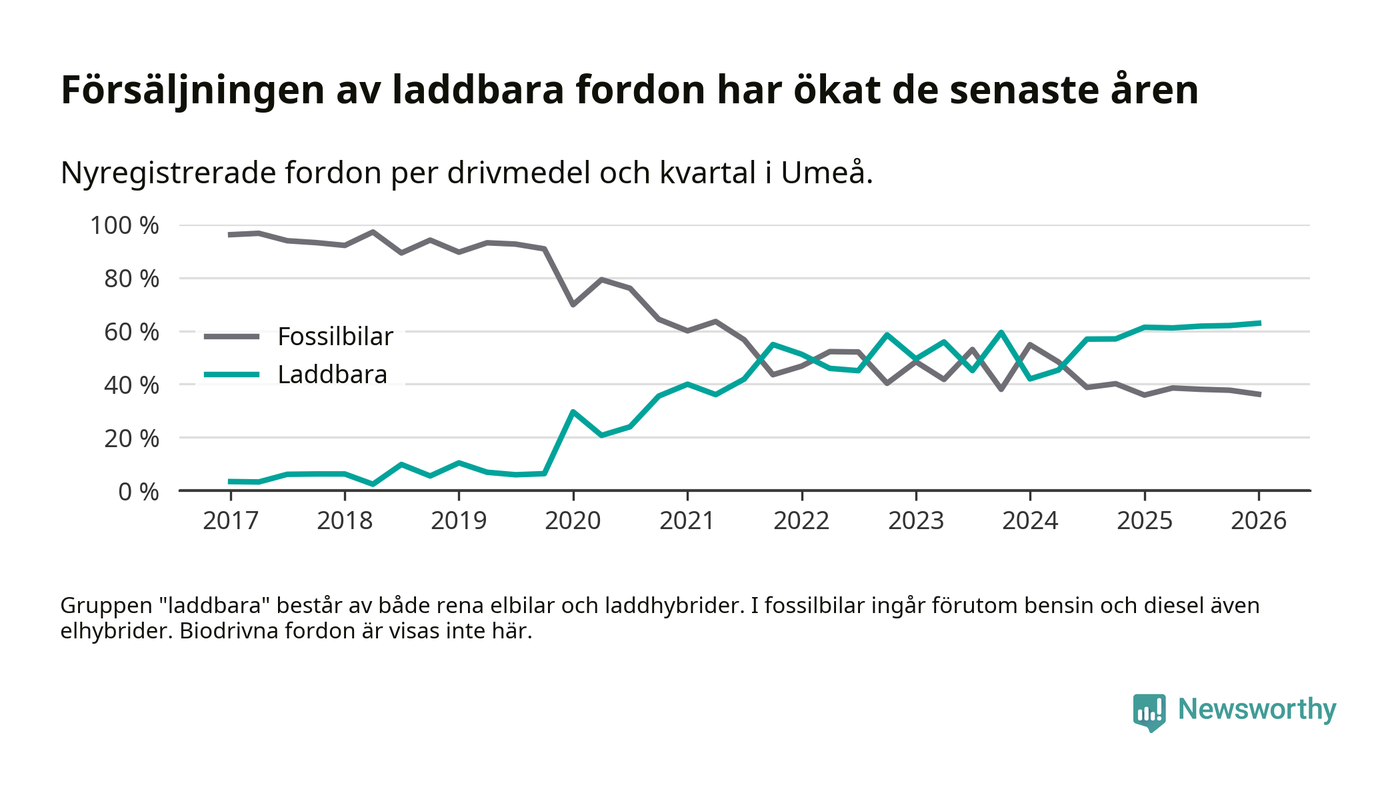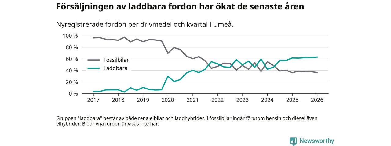 Under första kvartalet 2026 var 63 procent av alla nyregistrerade personbilar i Umeå laddbara (sammanlagt registrerades 547 nya bilar). Merparten av de laddbara bilarna var rena elbilar (38 procent av alla).