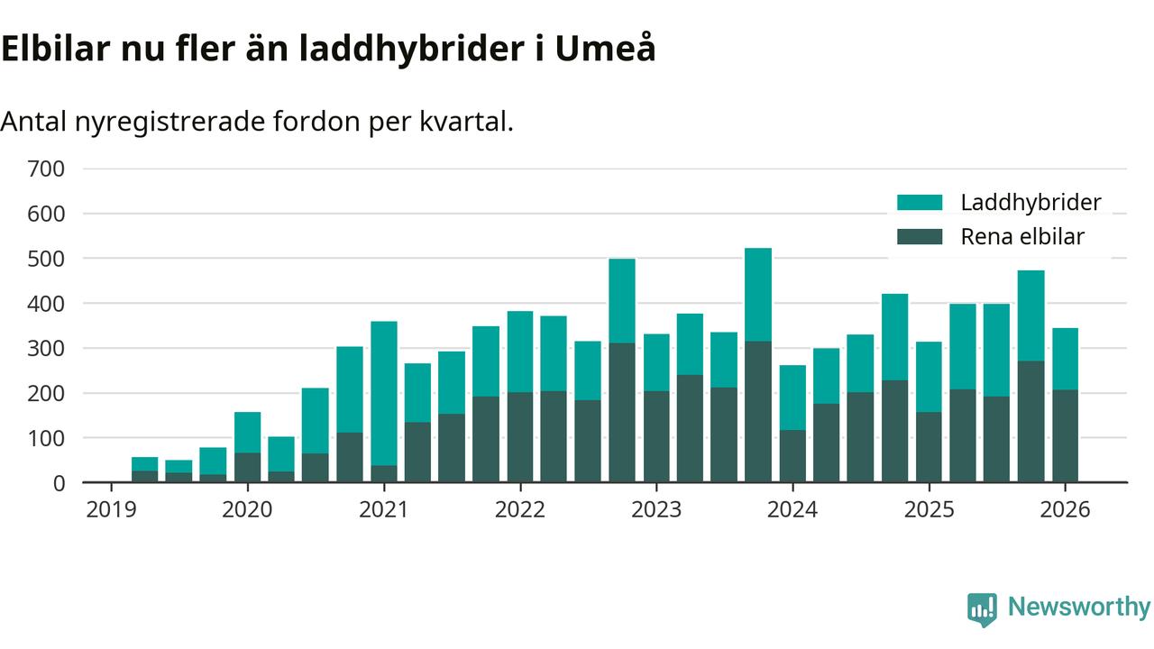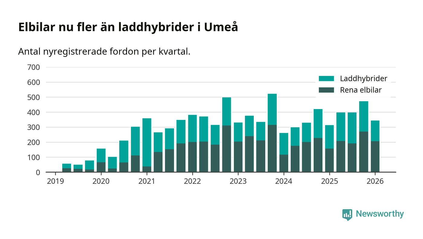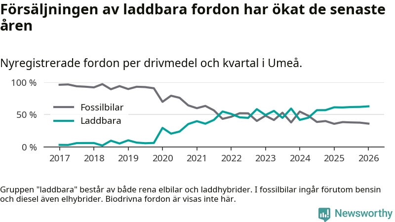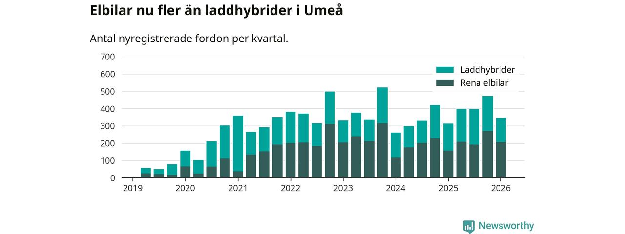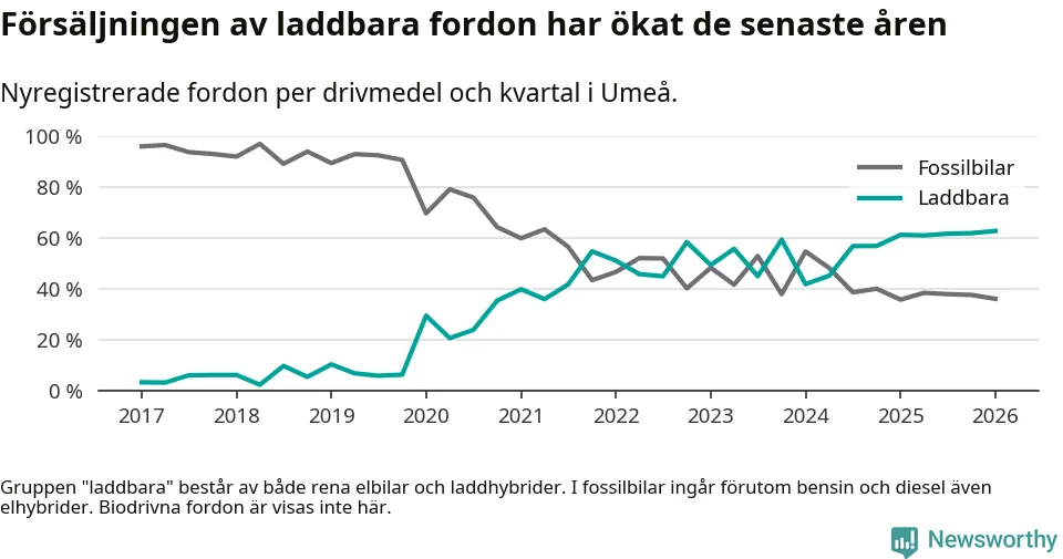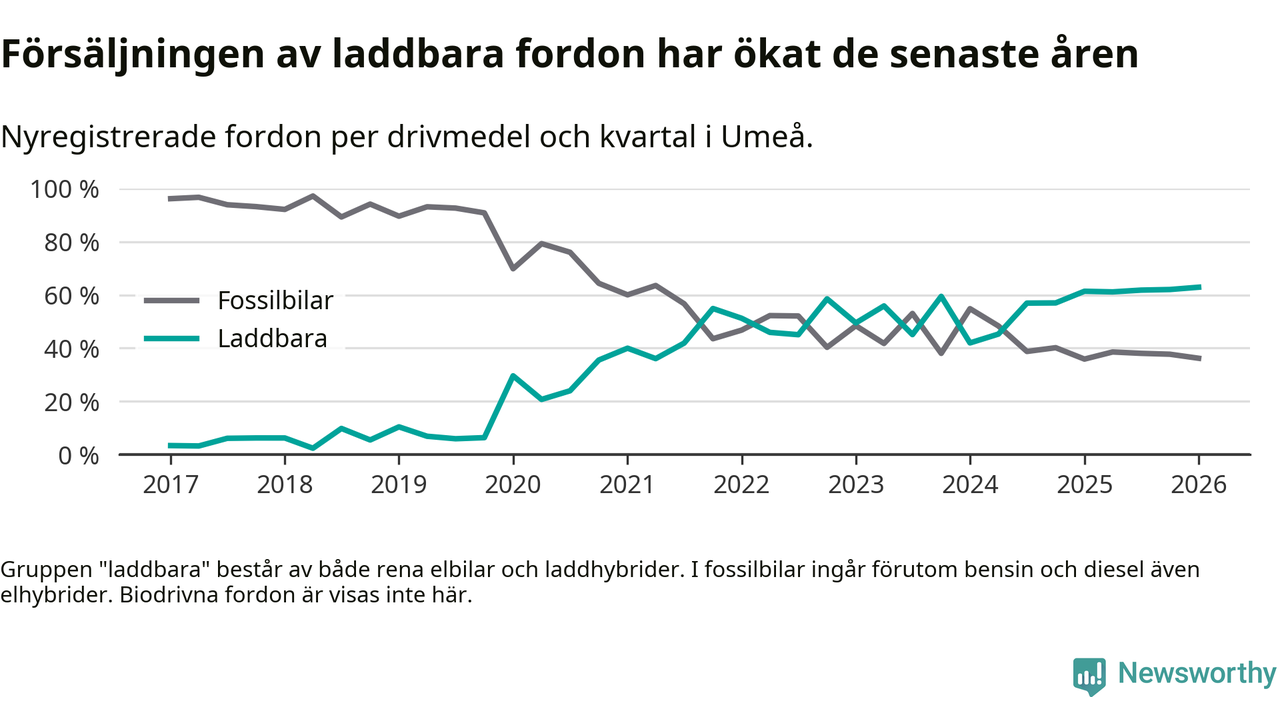 Under första kvartalet 2026 var 63 procent av alla nyregistrerade personbilar i Umeå laddbara (sammanlagt registrerades 547 nya bilar). Merparten av de laddbara bilarna var rena elbilar (38 procent av alla).