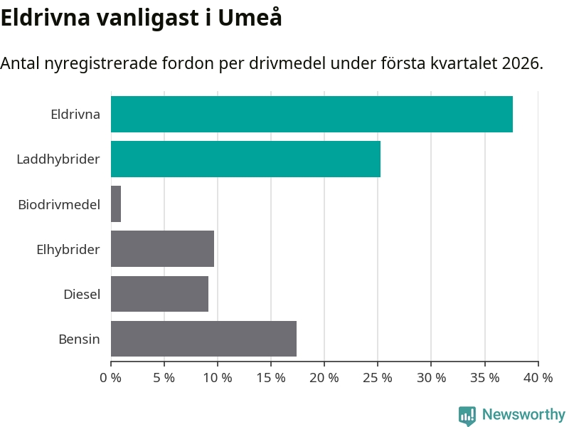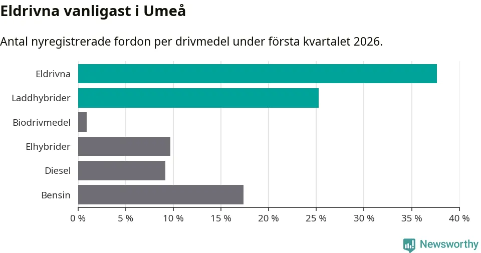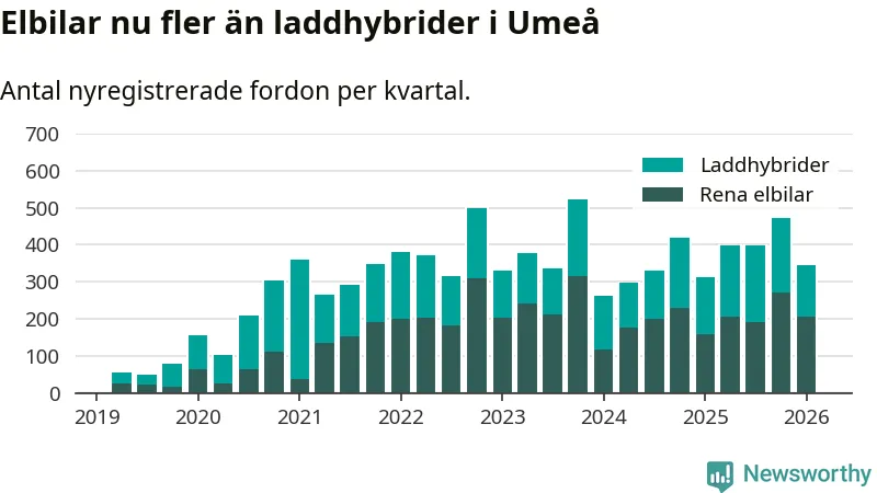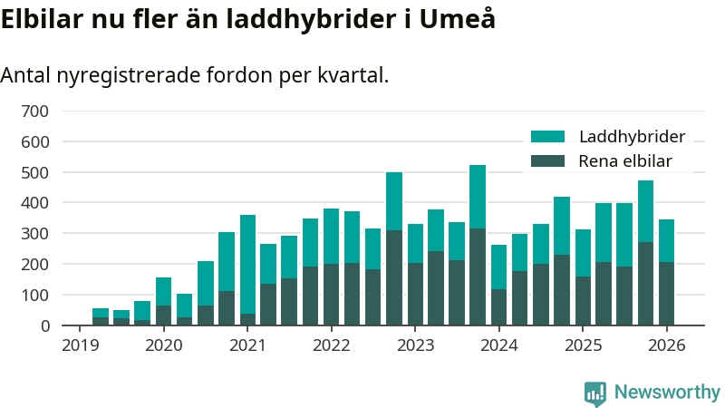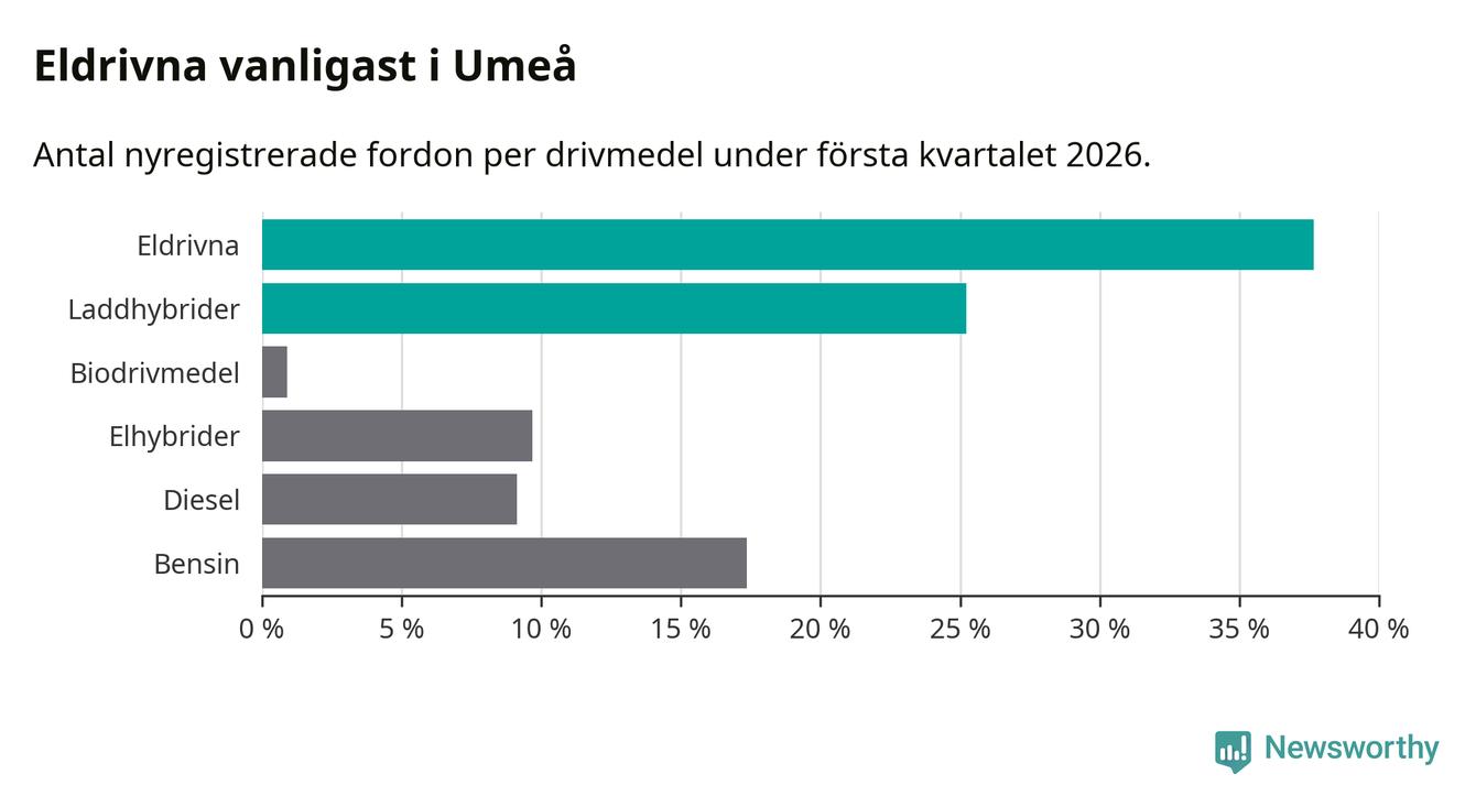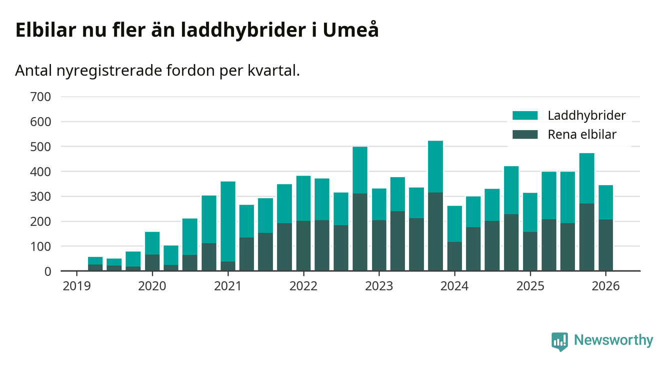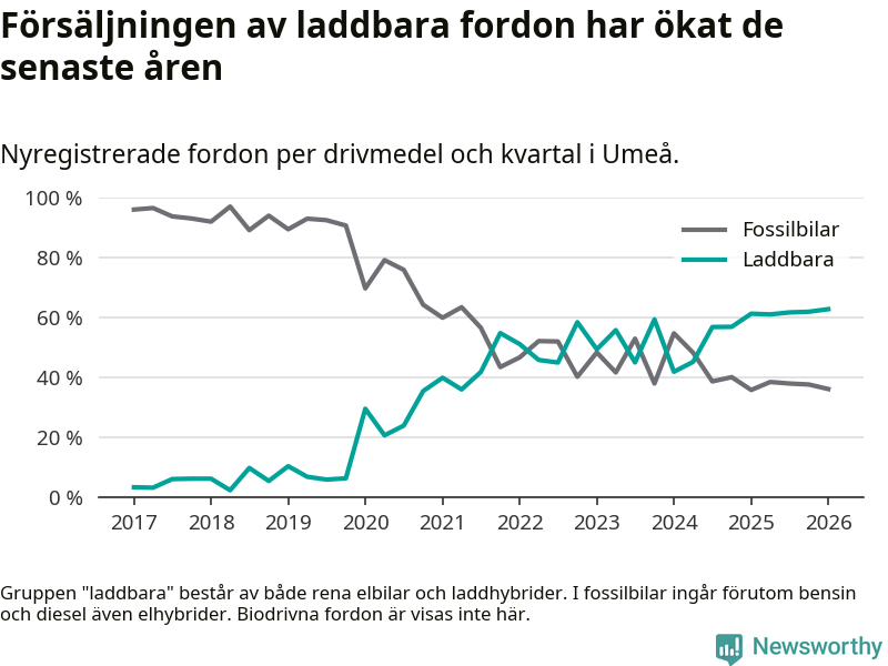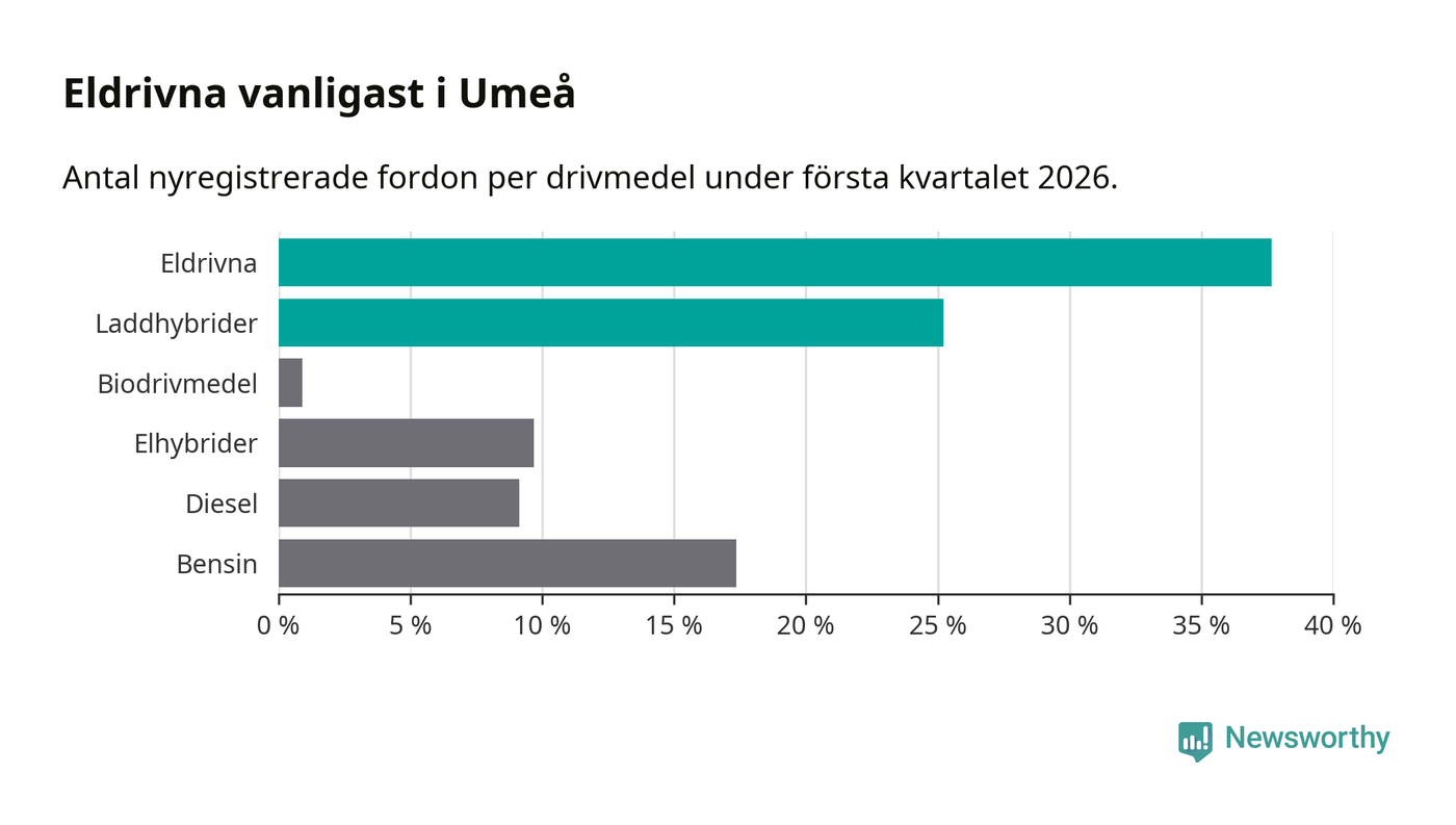 Under första kvartalet 2026 var 63 procent av alla nyregistrerade personbilar i Umeå laddbara (sammanlagt registrerades 547 nya bilar). Merparten av de laddbara bilarna var rena elbilar (38 procent av alla).