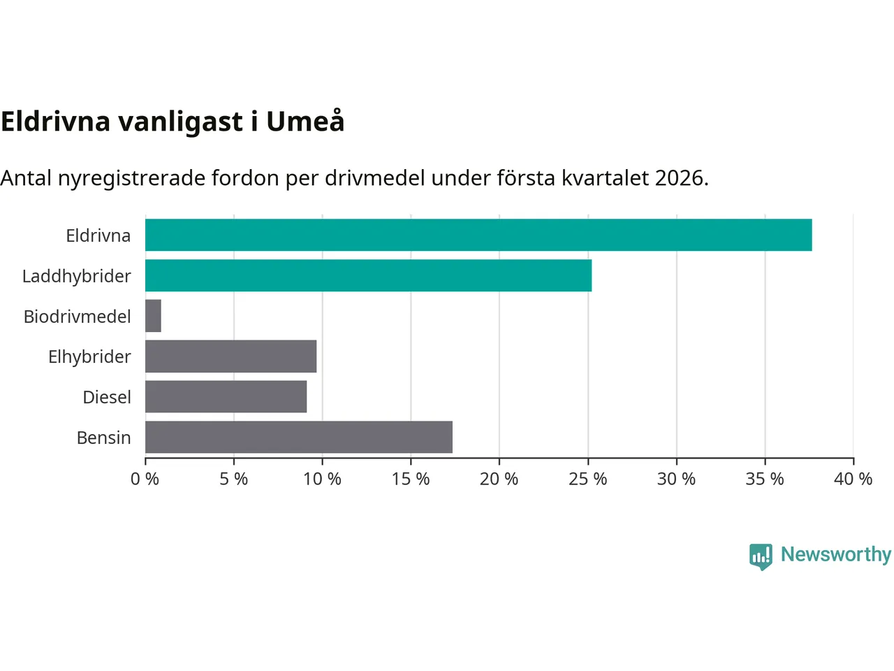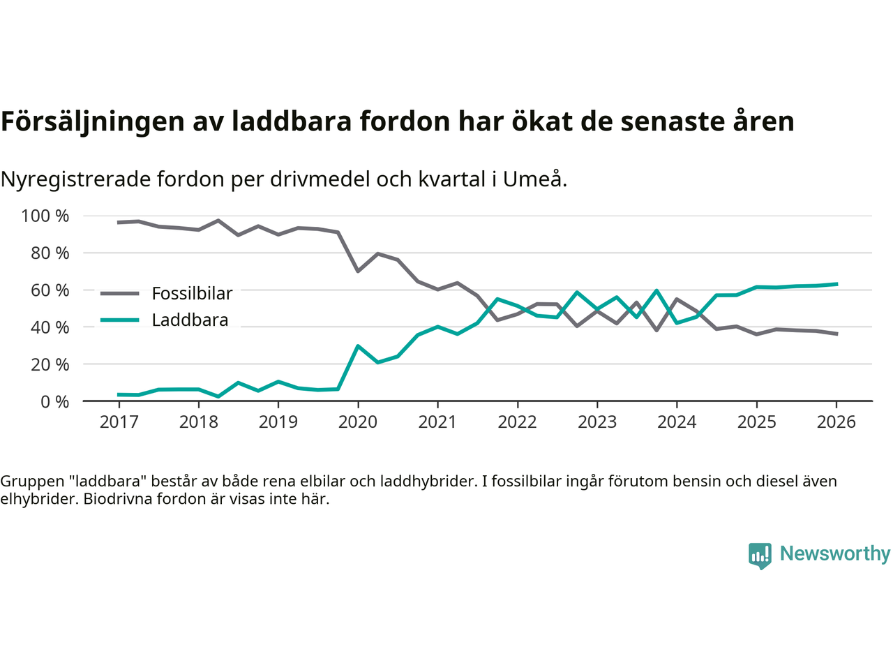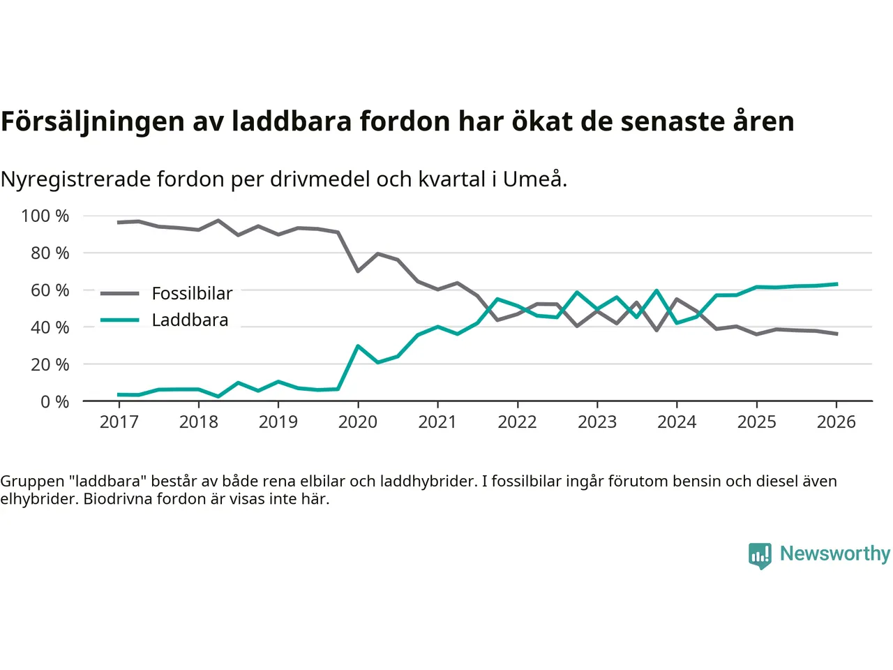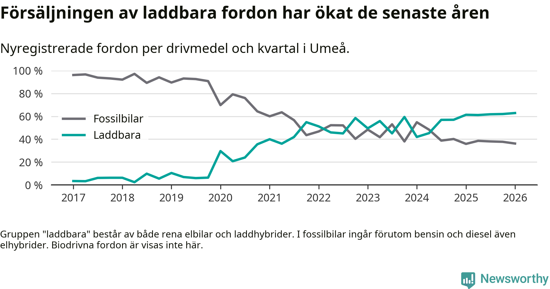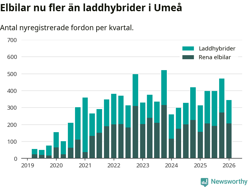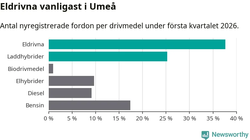 Under första kvartalet 2026 var 63 procent av alla nyregistrerade personbilar i Umeå laddbara (sammanlagt registrerades 547 nya bilar). Merparten av de laddbara bilarna var rena elbilar (38 procent av alla).