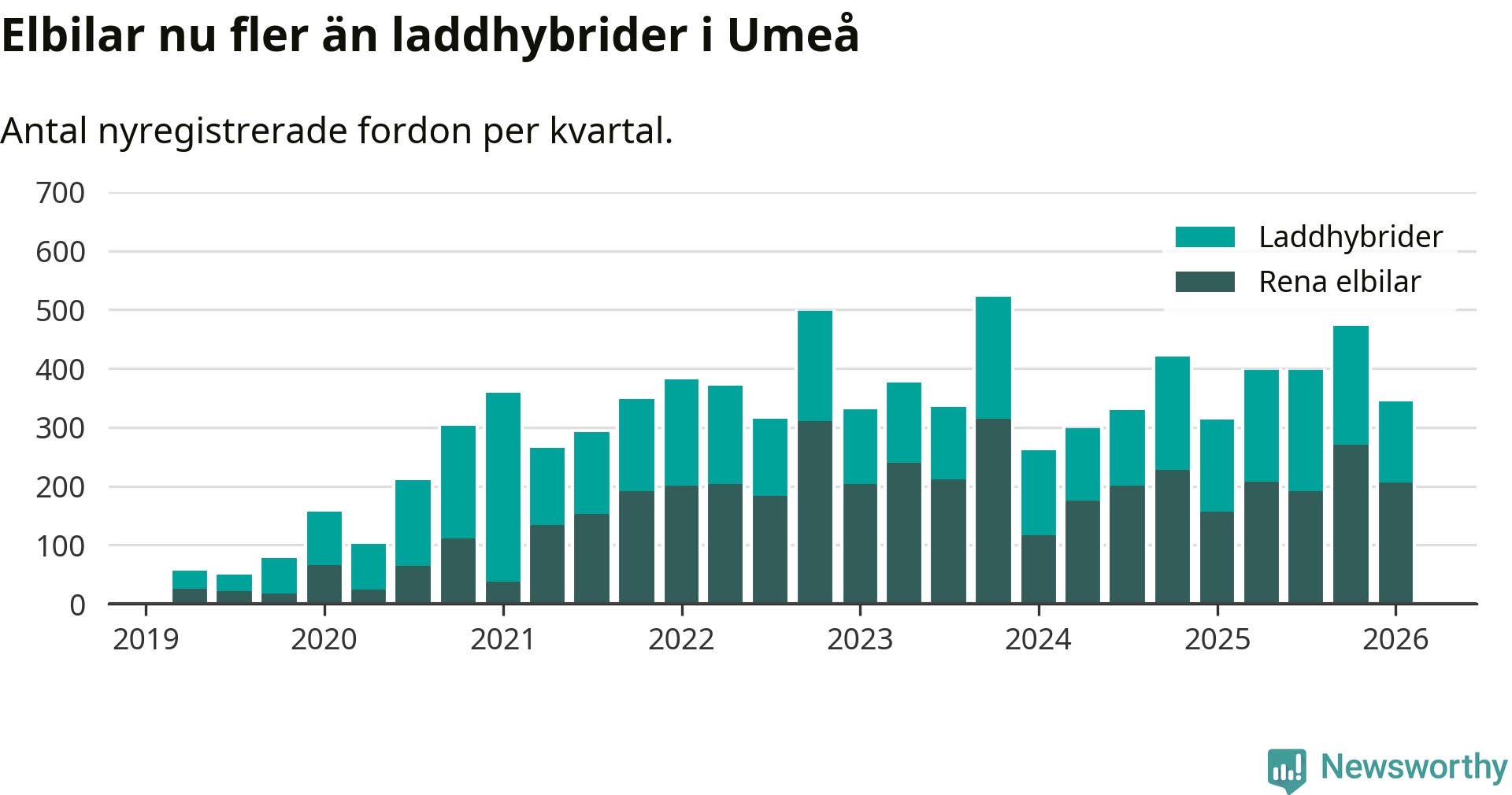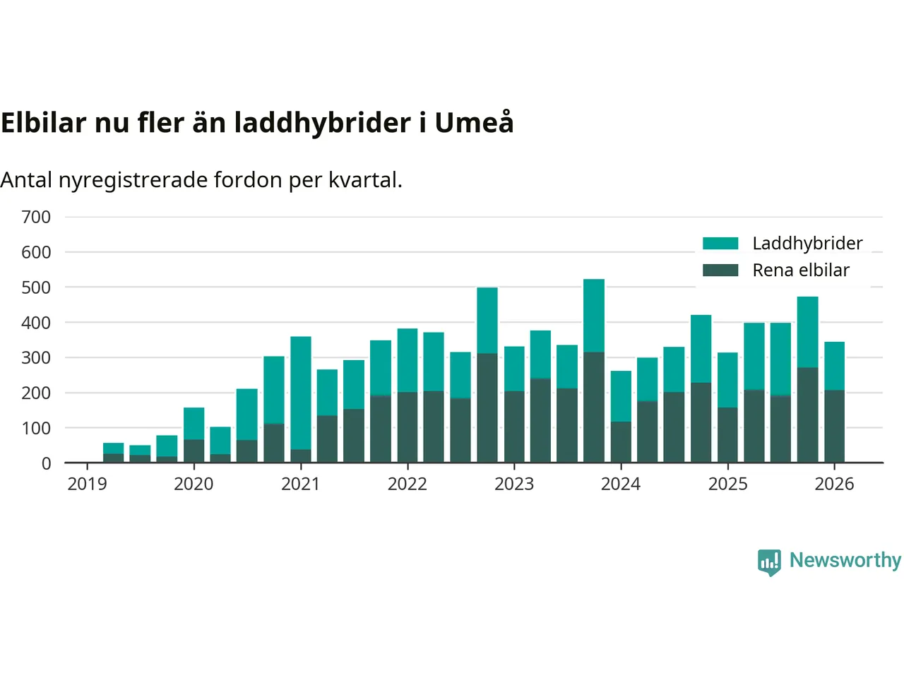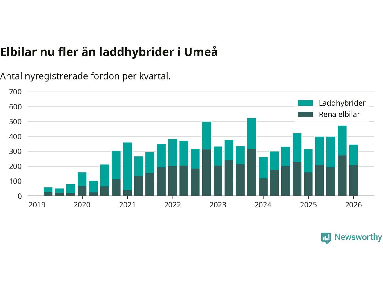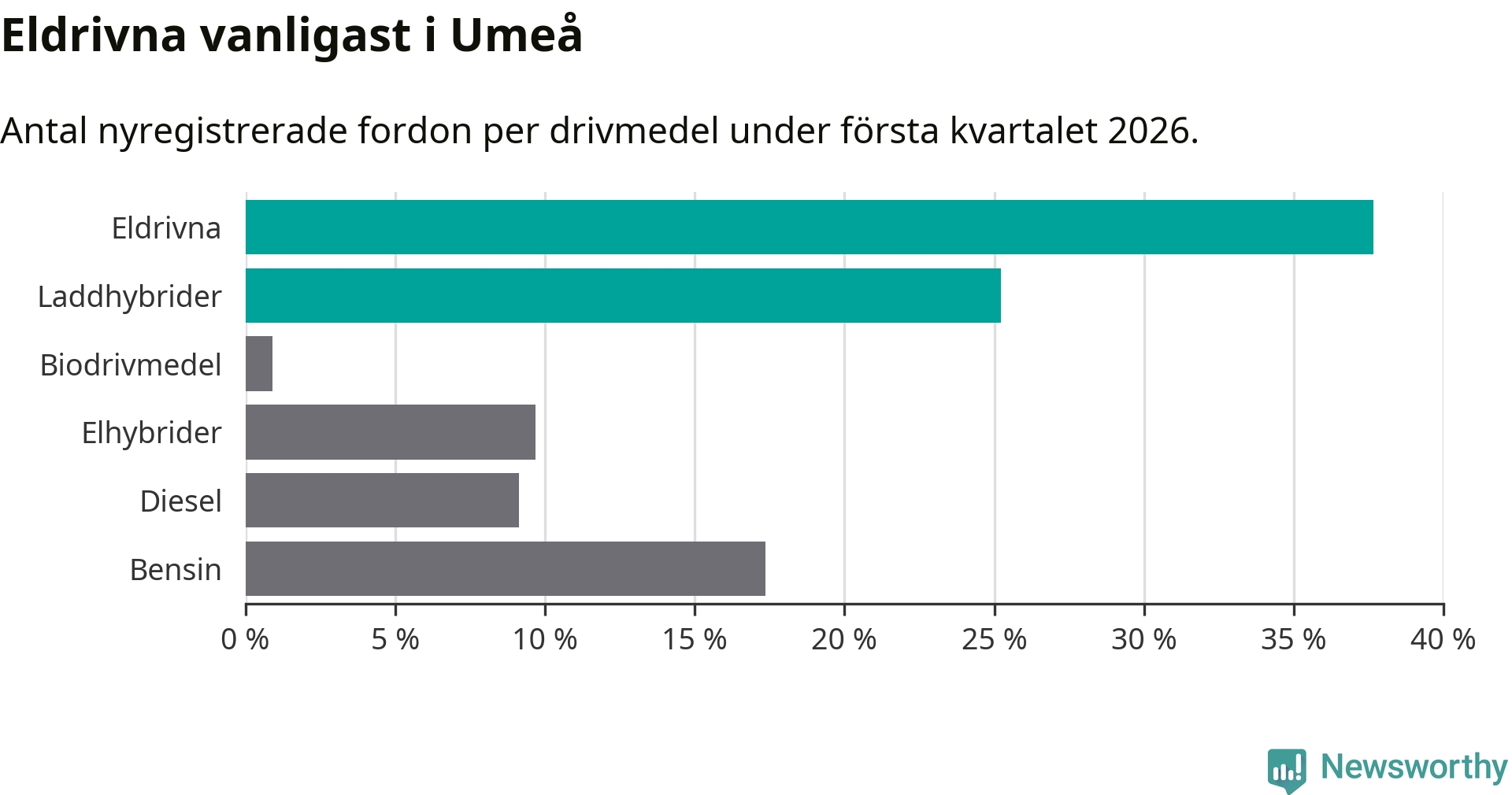 Under första kvartalet 2026 var 63 procent av alla nyregistrerade personbilar i Umeå laddbara (sammanlagt registrerades 547 nya bilar). Merparten av de laddbara bilarna var rena elbilar (38 procent av alla).