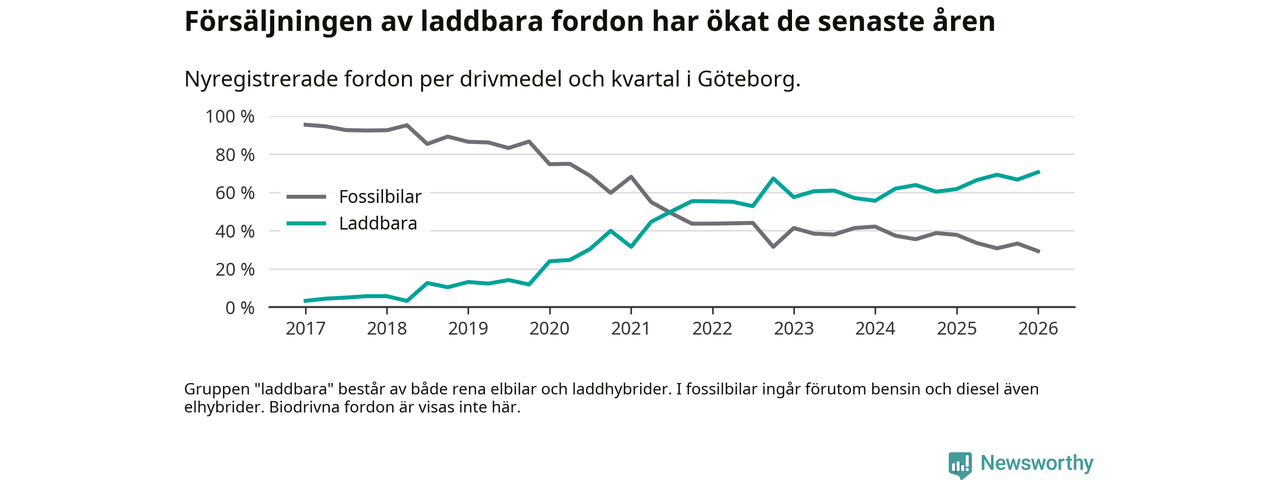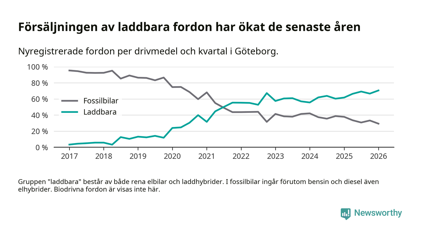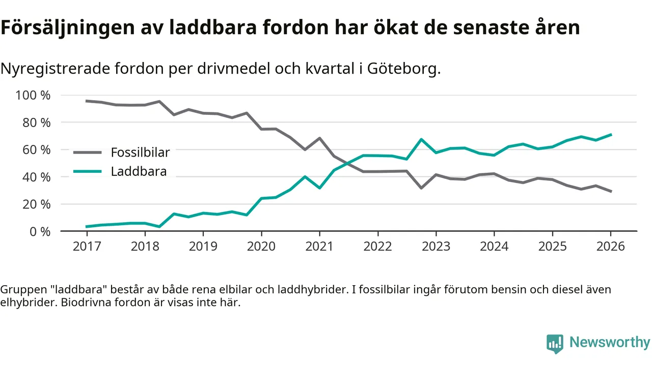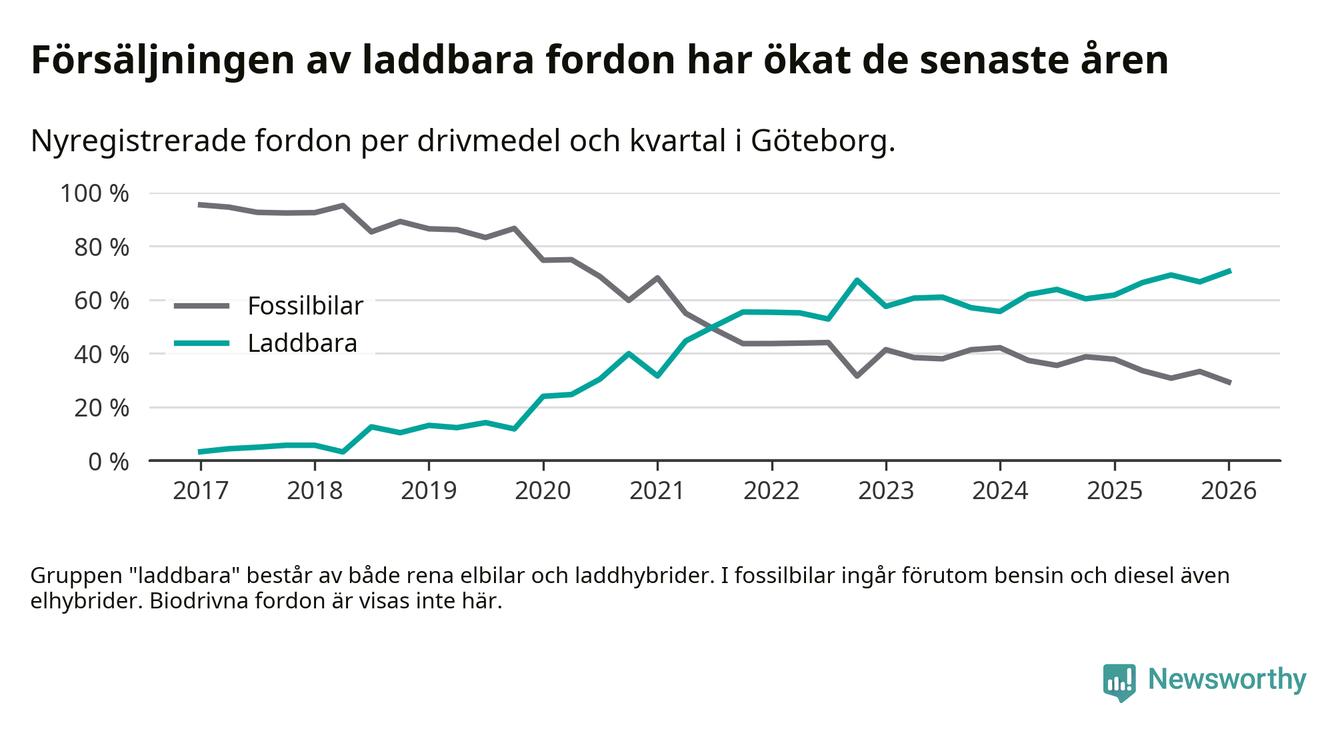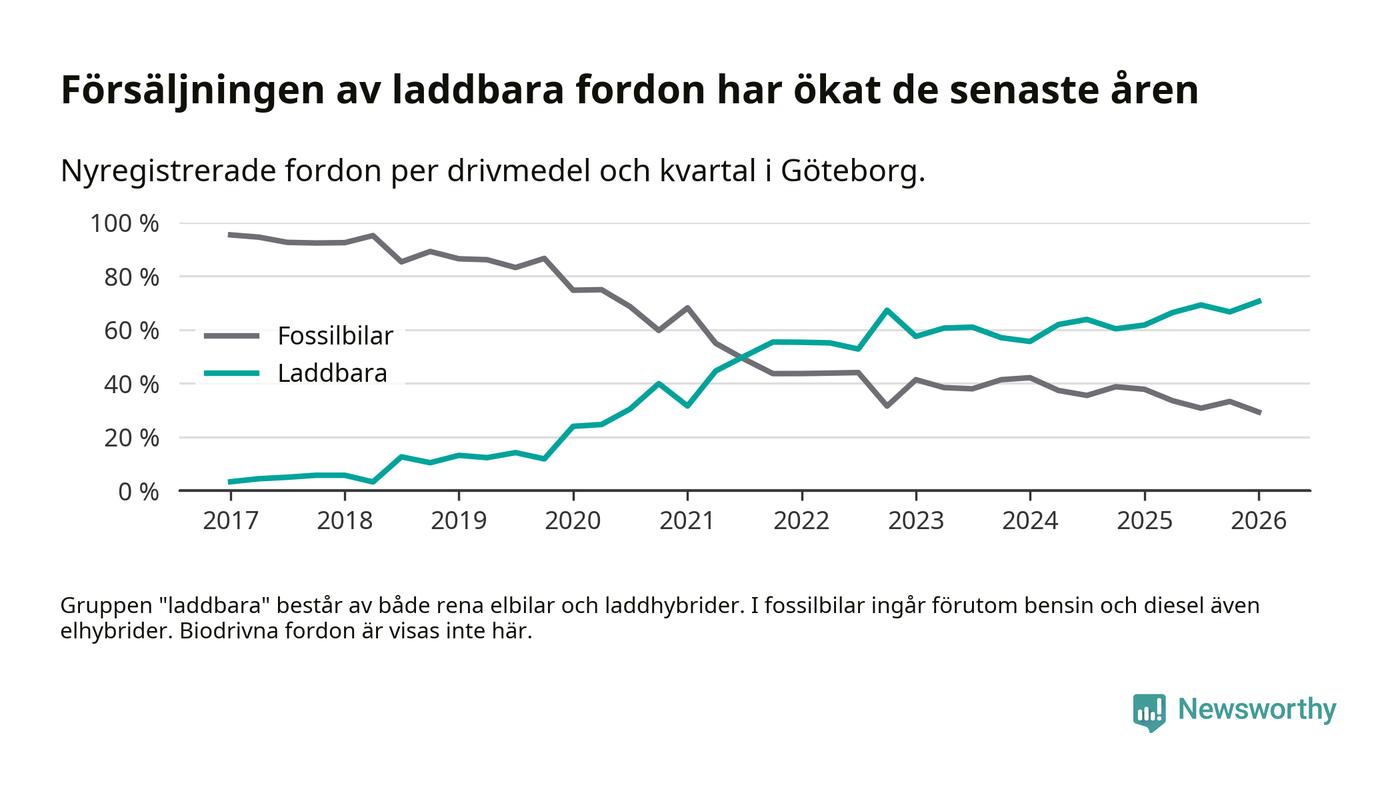 Under första kvartalet 2026 var 71 procent av alla nyregistrerade personbilar i Göteborg laddbara (sammanlagt registrerades 3 464 nya bilar). Merparten av de laddbara bilarna var rena elbilar (44 procent av alla).