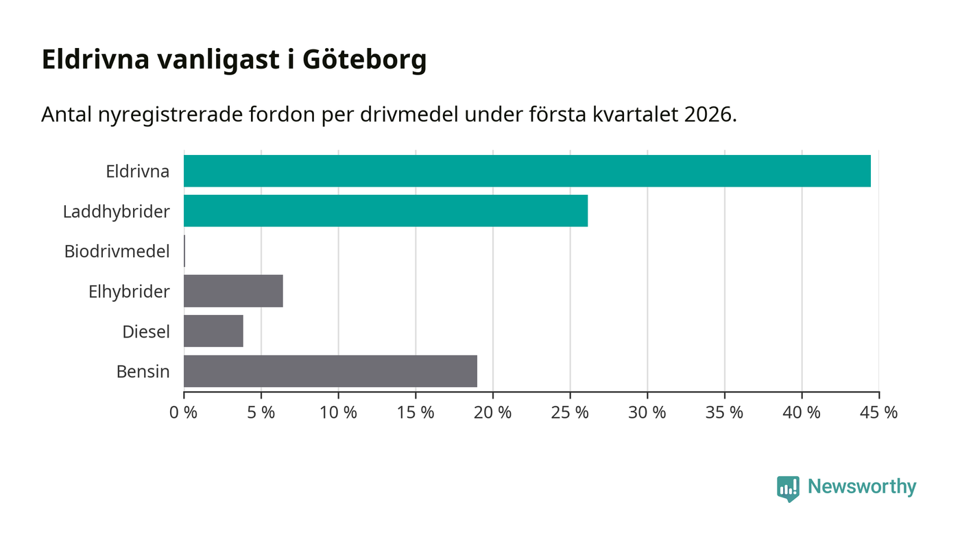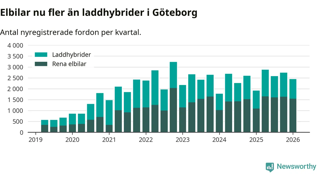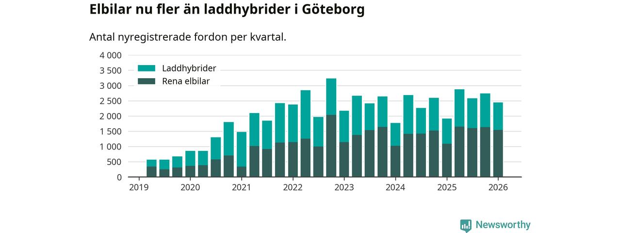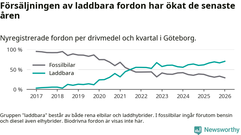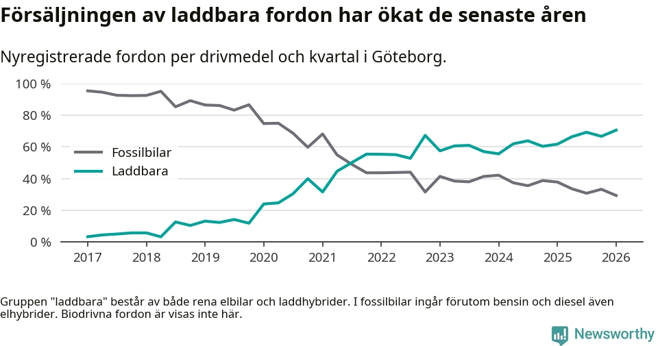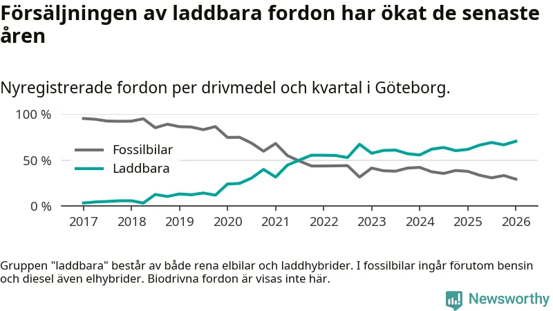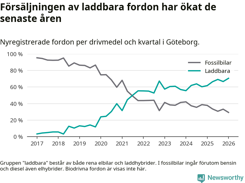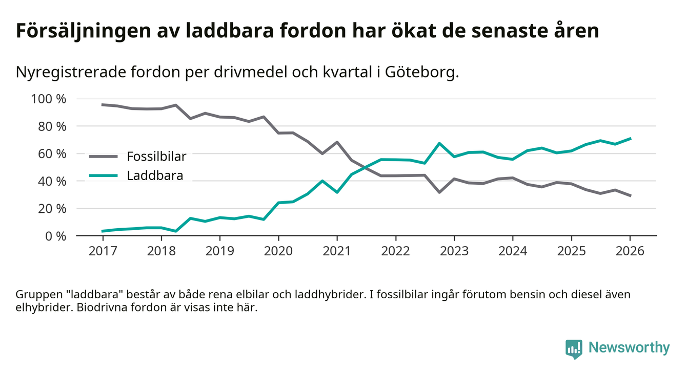 Under första kvartalet 2026 var 71 procent av alla nyregistrerade personbilar i Göteborg laddbara (sammanlagt registrerades 3 464 nya bilar). Merparten av de laddbara bilarna var rena elbilar (44 procent av alla).