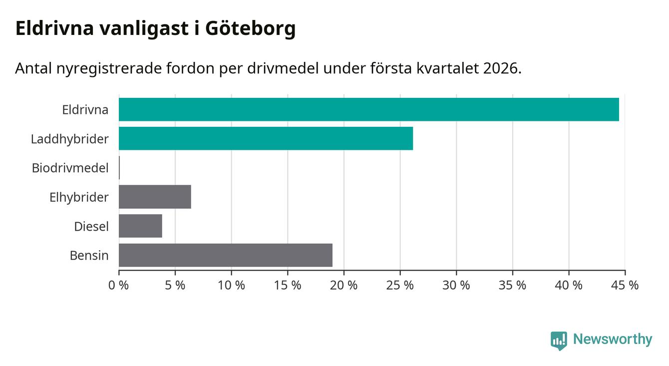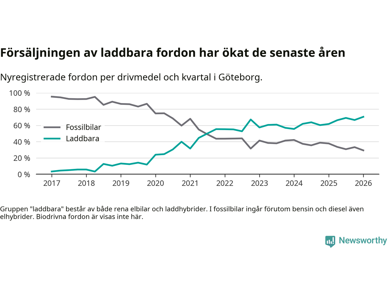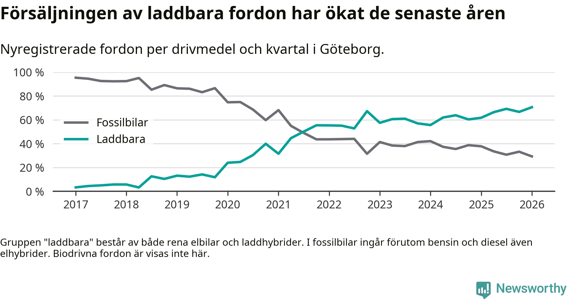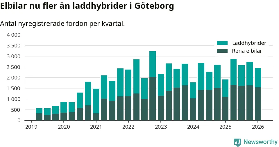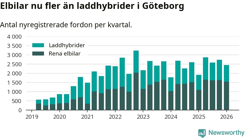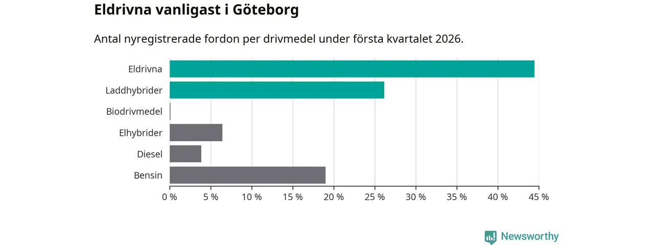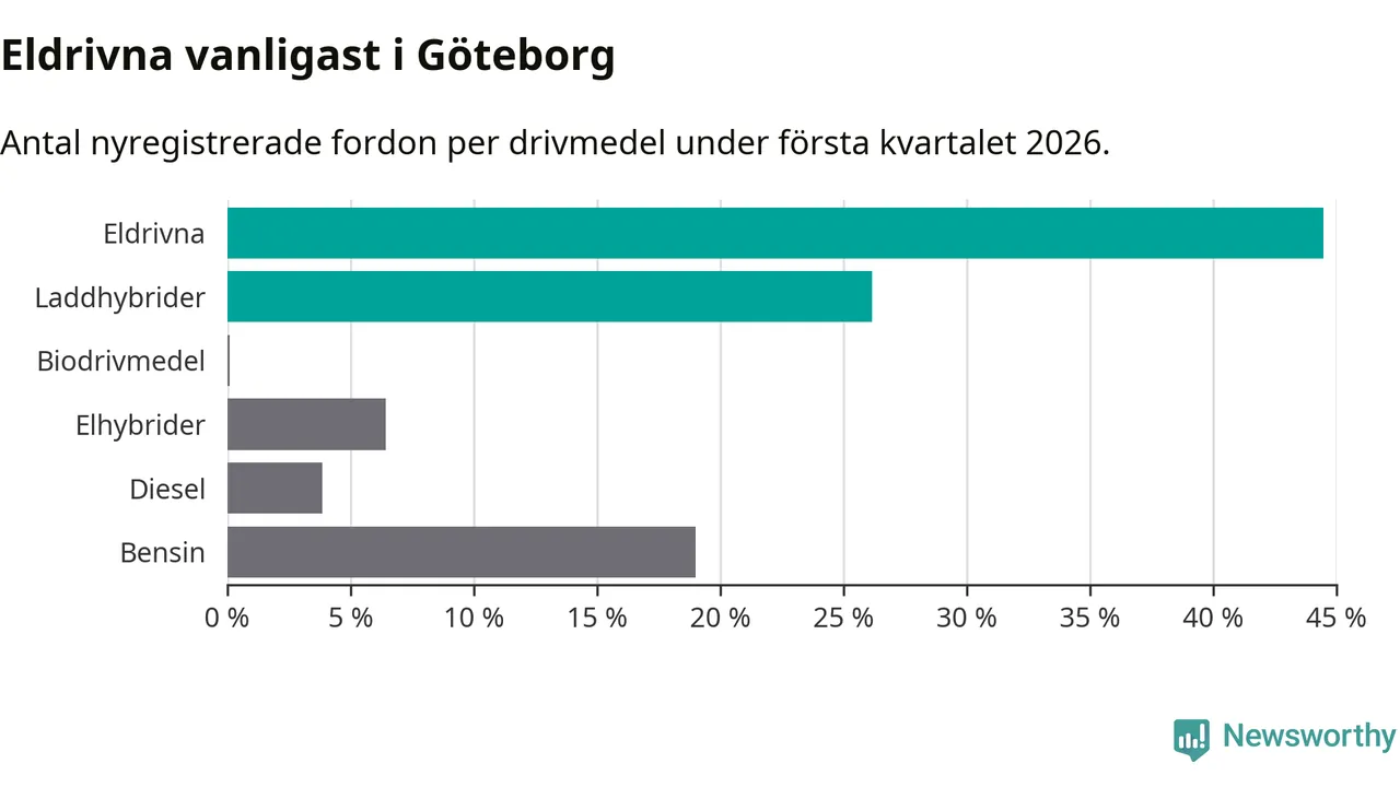 Under första kvartalet 2026 var 71 procent av alla nyregistrerade personbilar i Göteborg laddbara (sammanlagt registrerades 3 464 nya bilar). Merparten av de laddbara bilarna var rena elbilar (44 procent av alla).