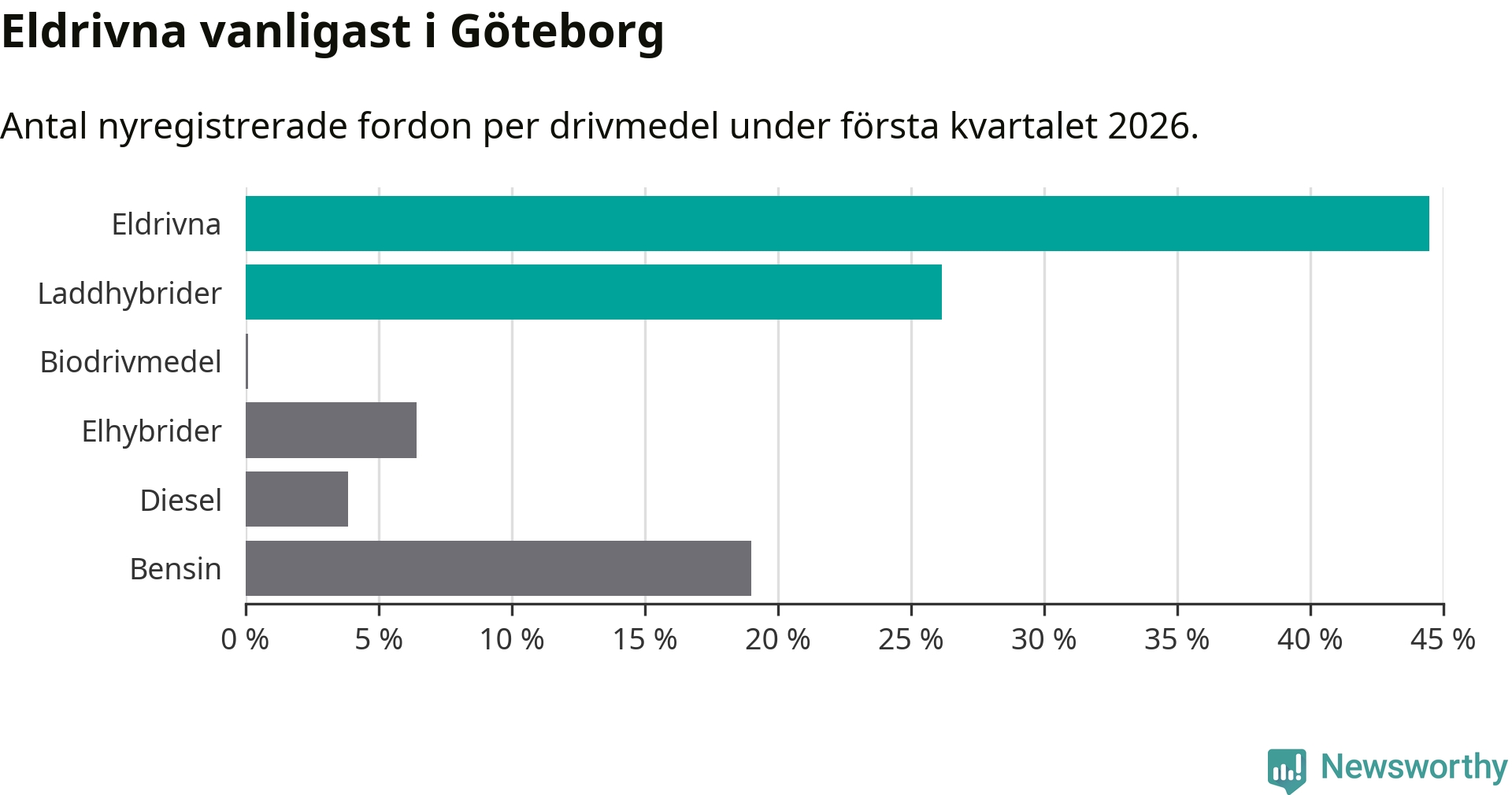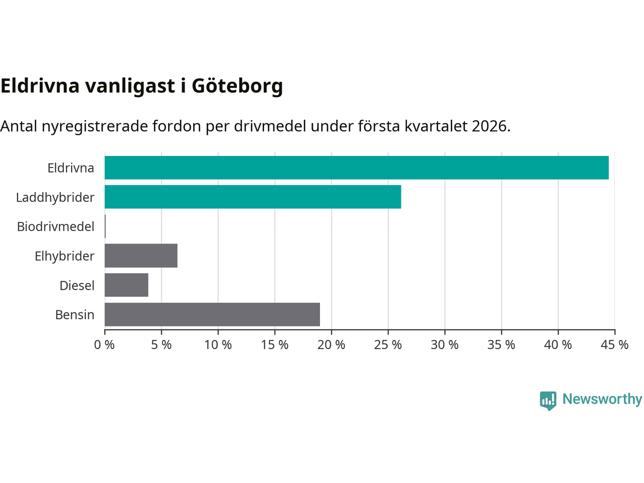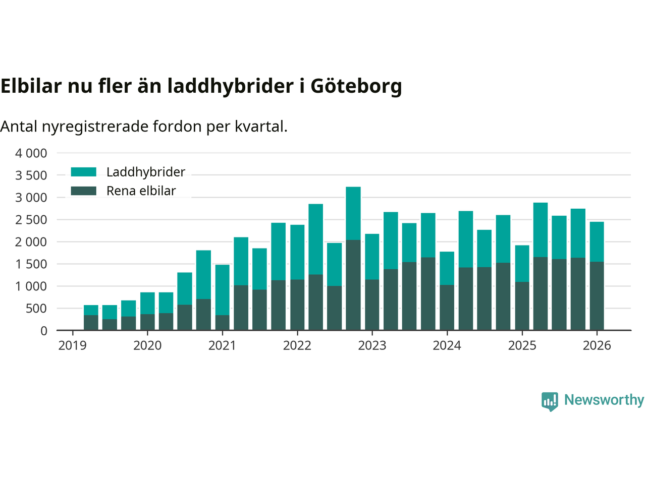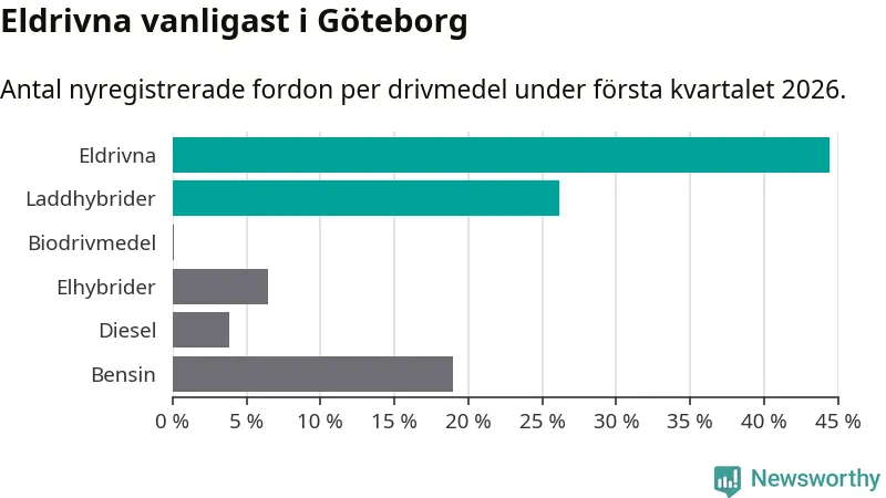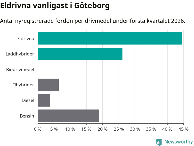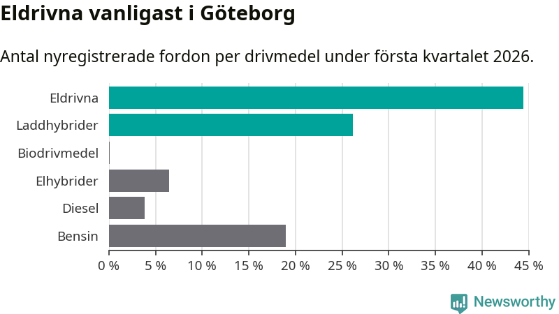 Under första kvartalet 2026 var 71 procent av alla nyregistrerade personbilar i Göteborg laddbara (sammanlagt registrerades 3 464 nya bilar). Merparten av de laddbara bilarna var rena elbilar (44 procent av alla).