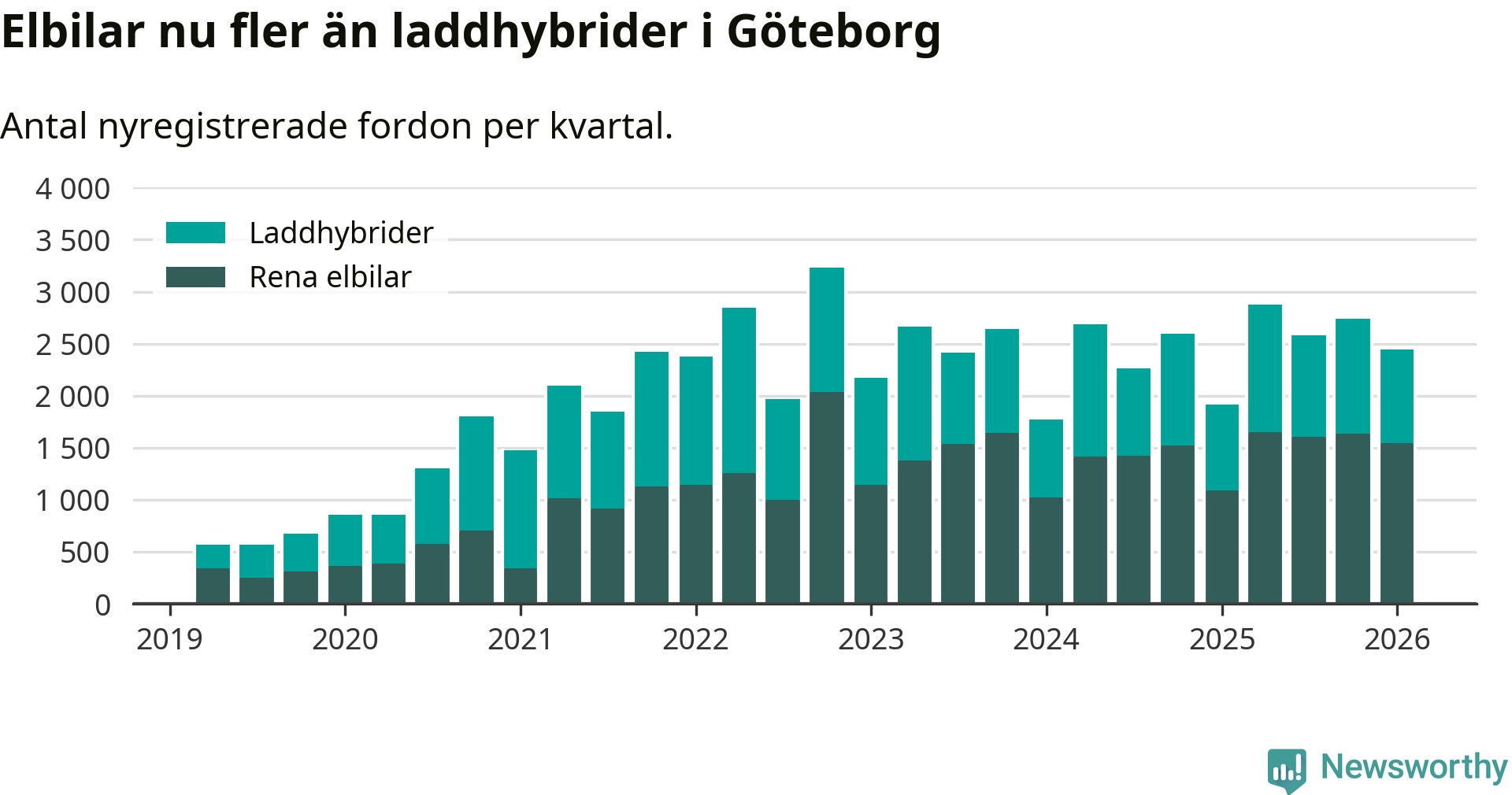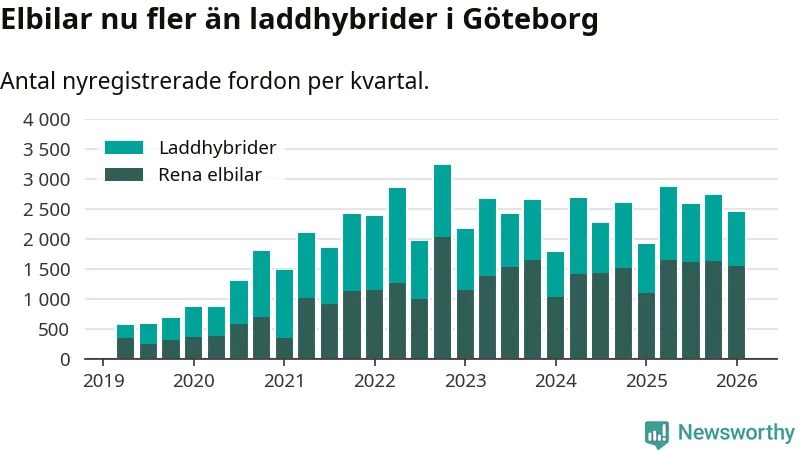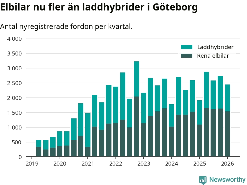 I Göteborg noterades ett nytt rekord under första kvartalet. Aldrig tidigare har laddbara bilar utgjort en så stor del av alla nya bilar.