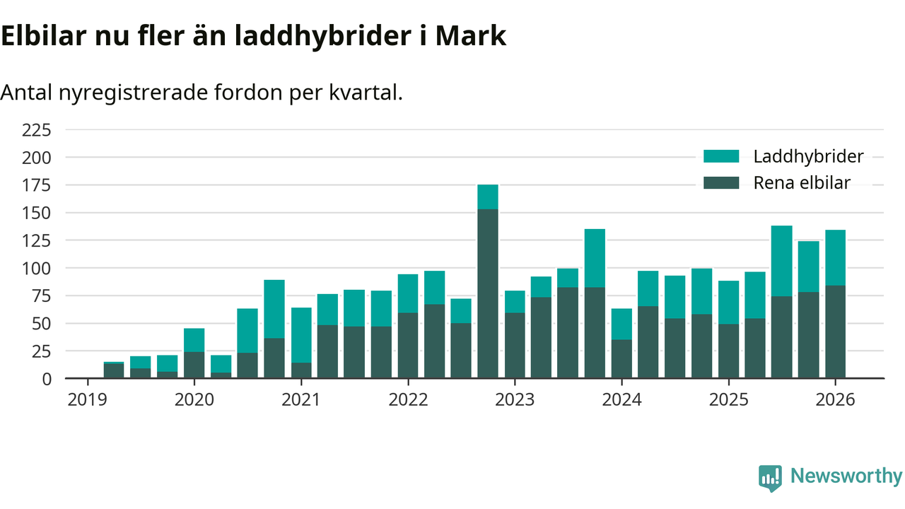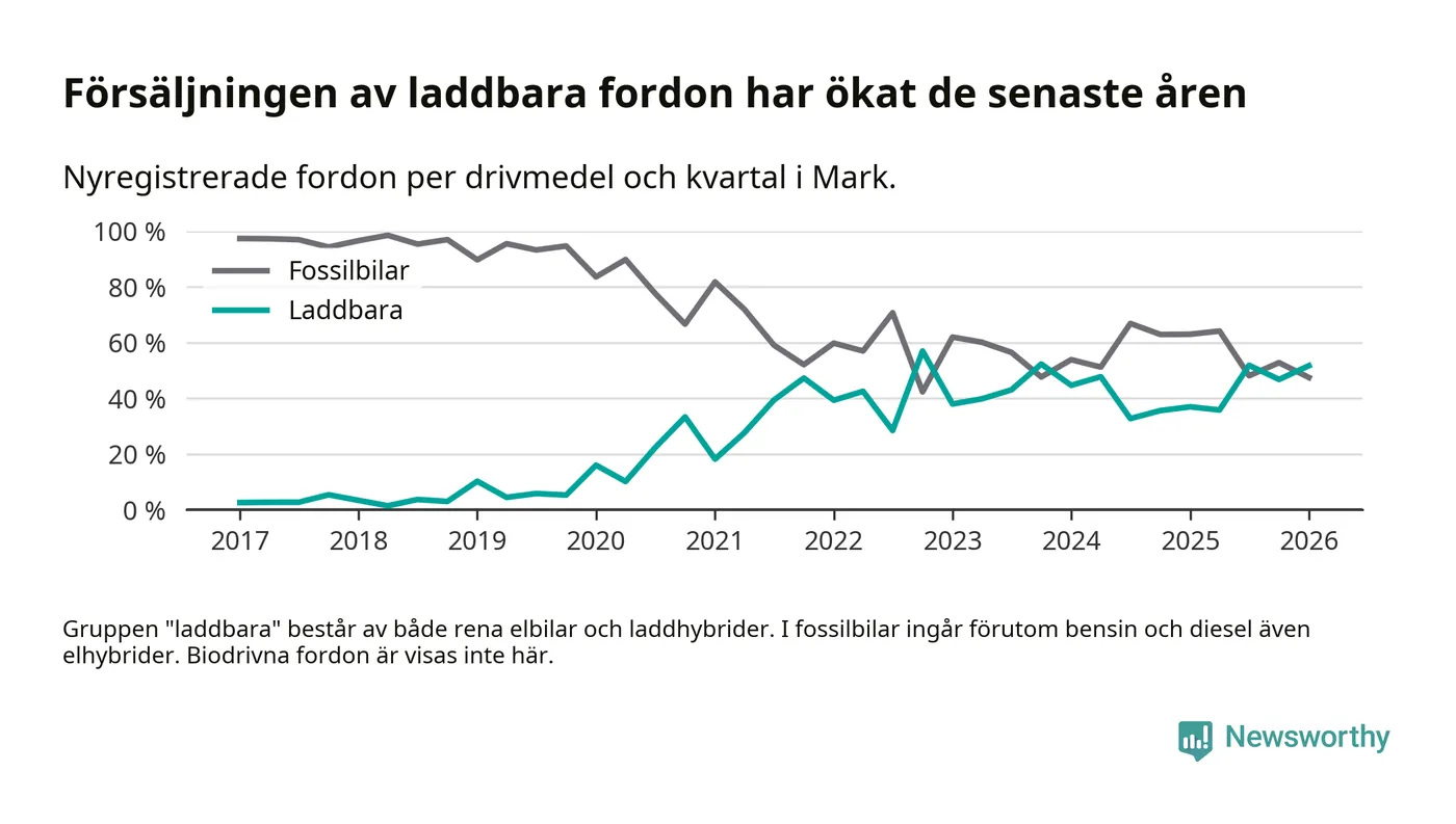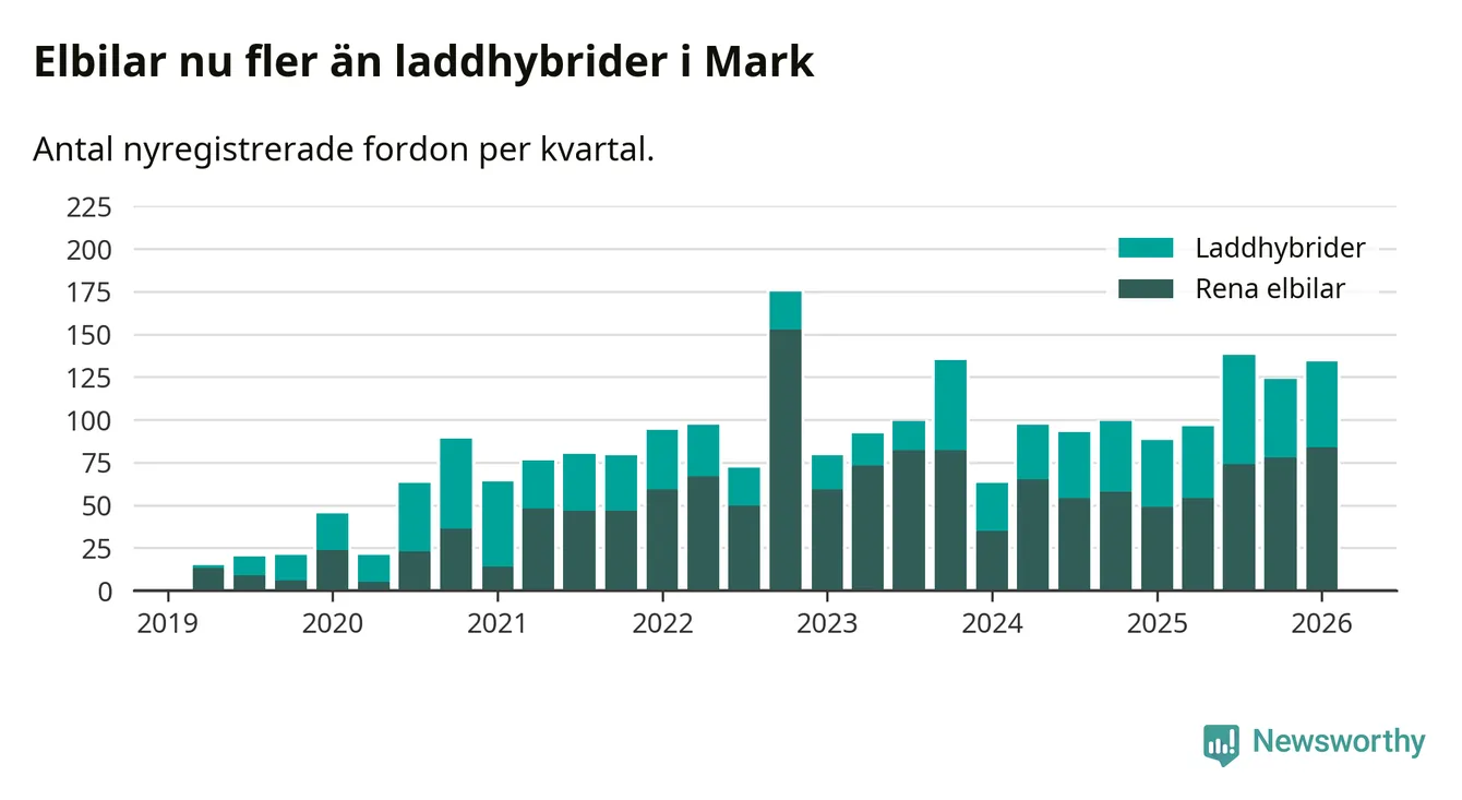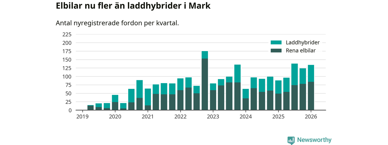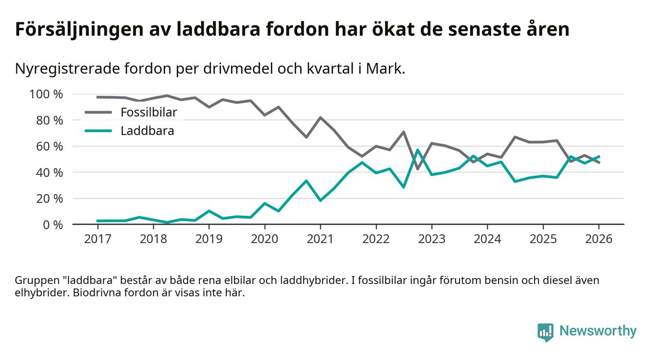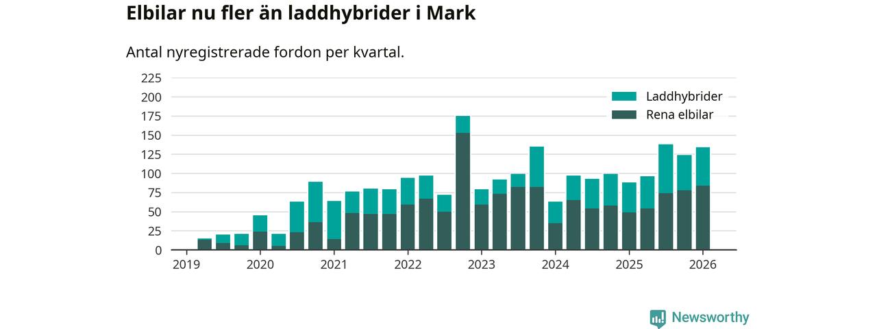 Under första kvartalet 2026 var 52 procent av alla nyregistrerade personbilar i Mark laddbara (sammanlagt registrerades 259 nya bilar). Merparten av de laddbara bilarna var rena elbilar (32 procent av alla).
