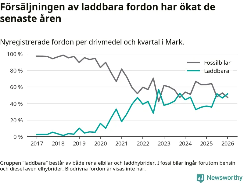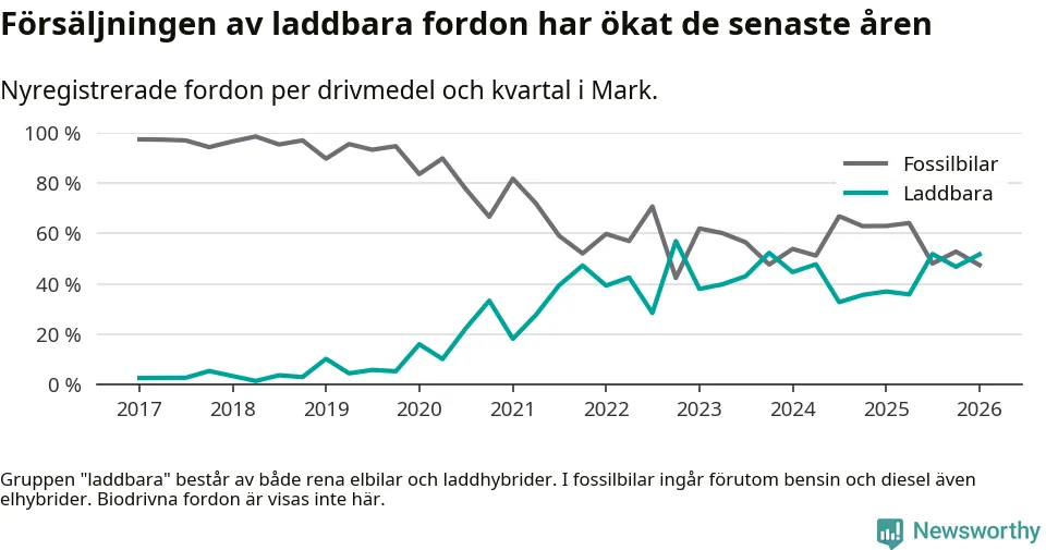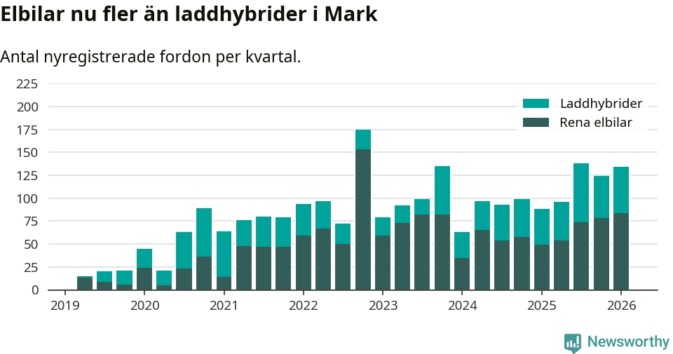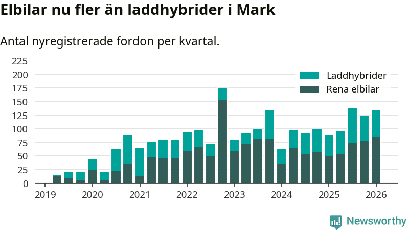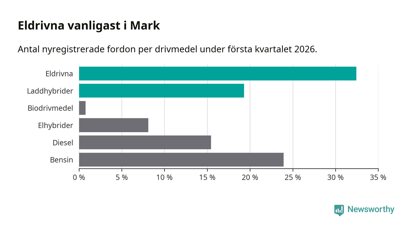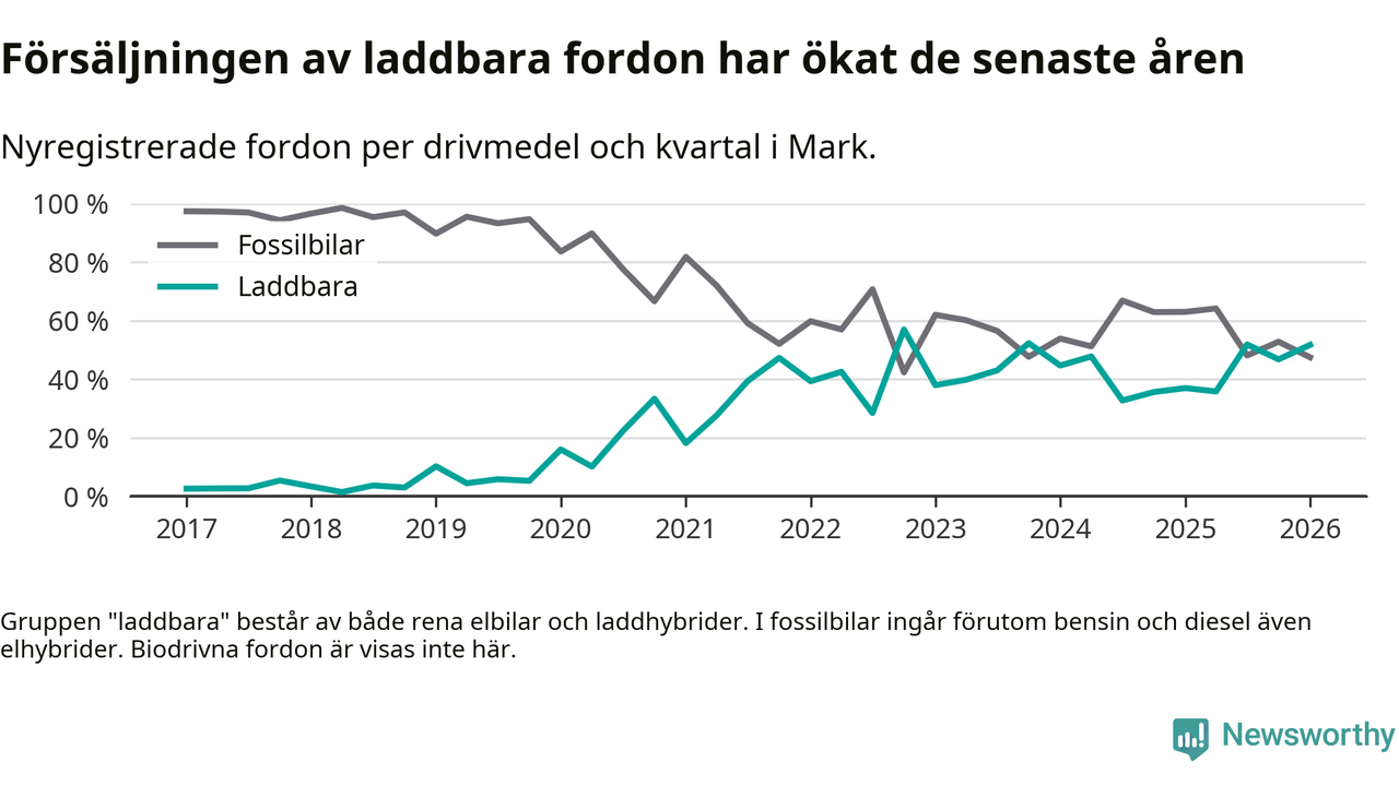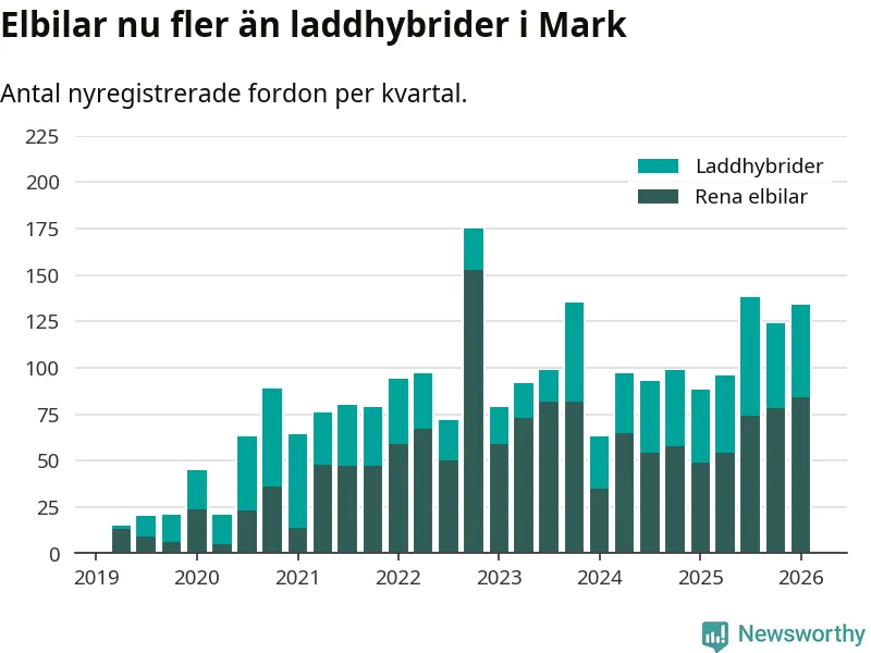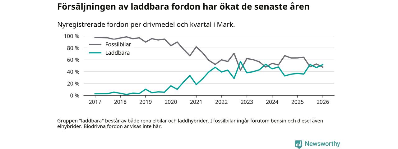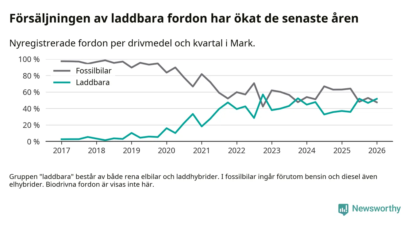 Under första kvartalet 2026 var 52 procent av alla nyregistrerade personbilar i Mark laddbara (sammanlagt registrerades 259 nya bilar). Merparten av de laddbara bilarna var rena elbilar (32 procent av alla).