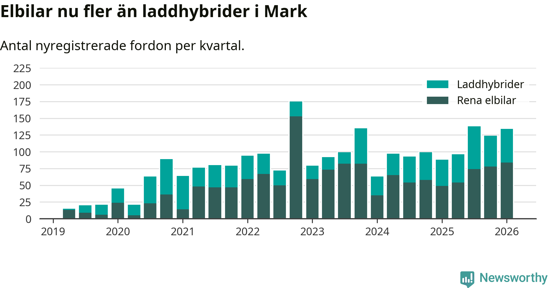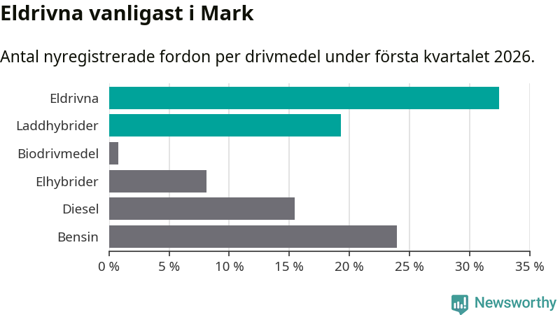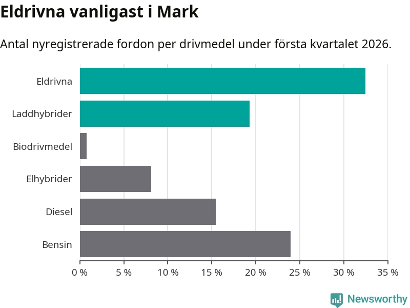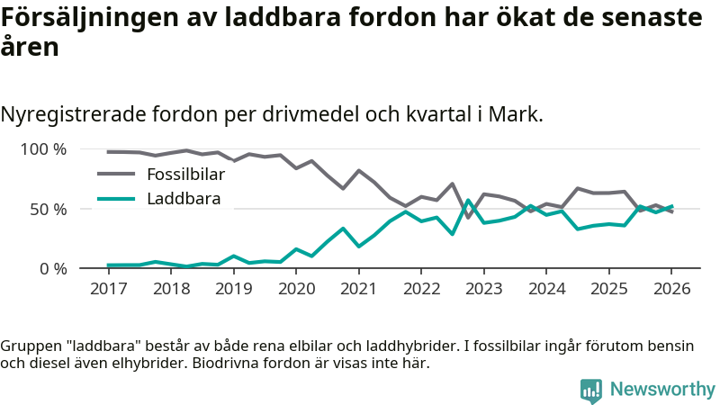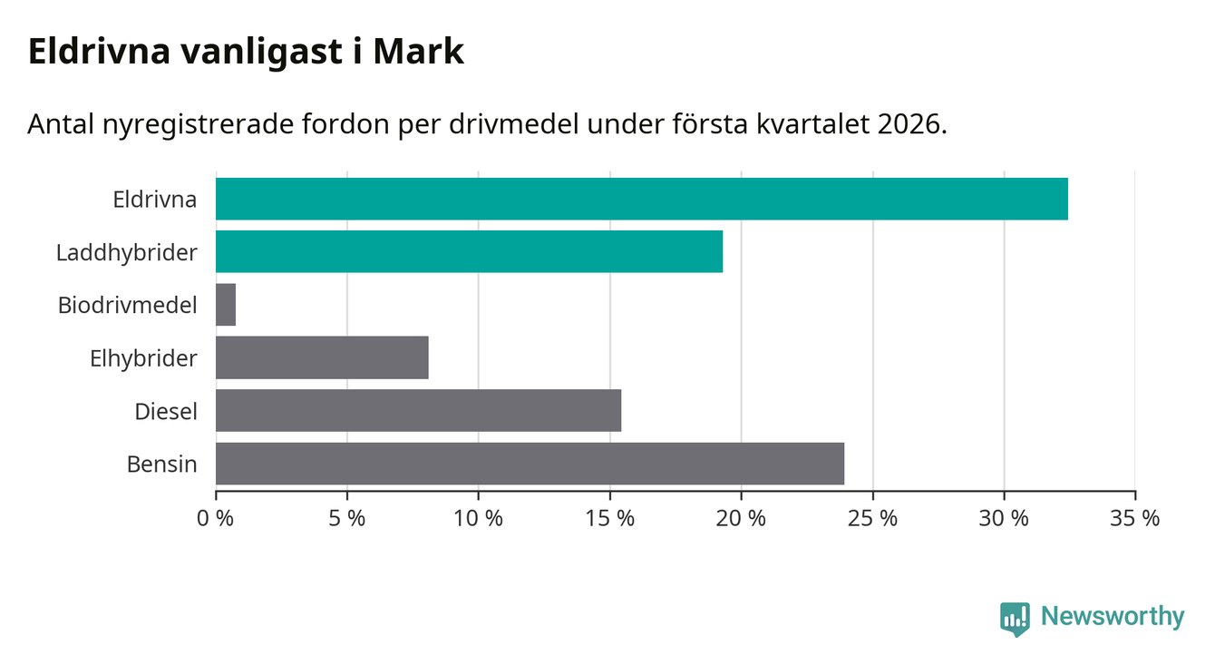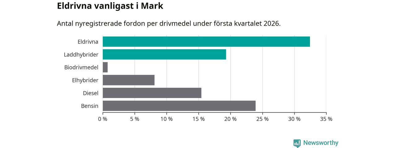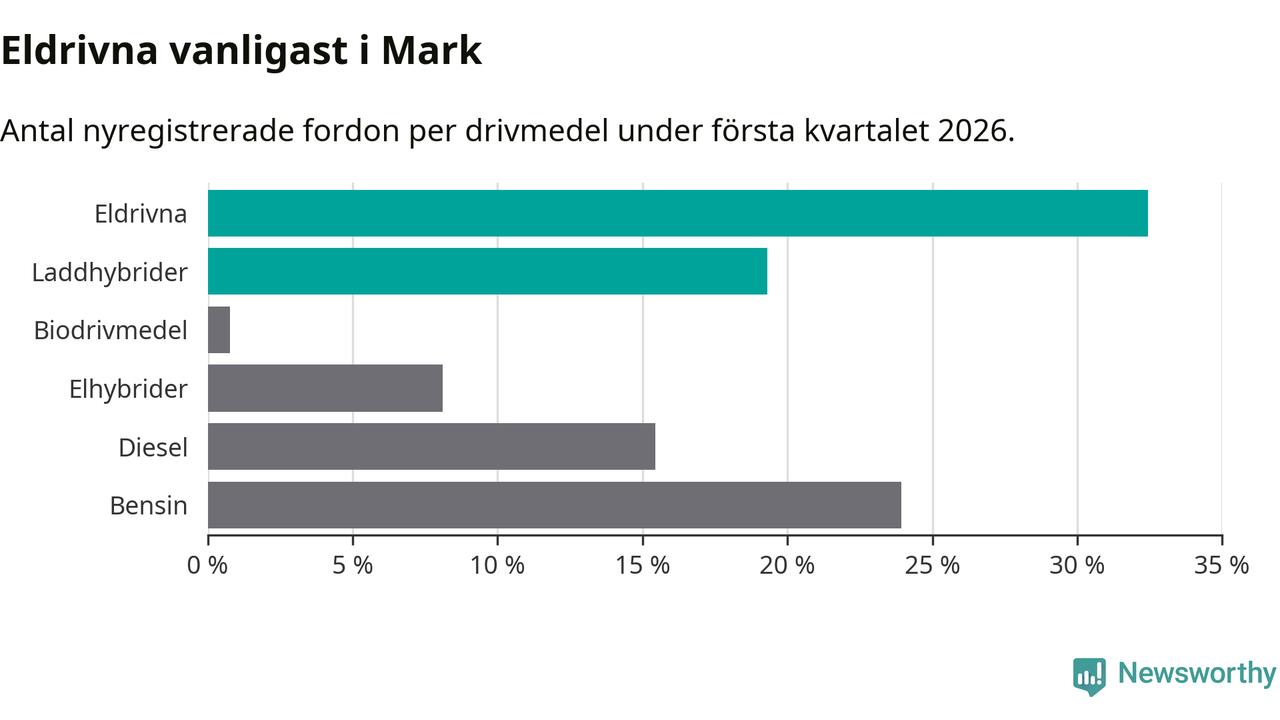 Under första kvartalet 2026 var 52 procent av alla nyregistrerade personbilar i Mark laddbara (sammanlagt registrerades 259 nya bilar). Merparten av de laddbara bilarna var rena elbilar (32 procent av alla).
