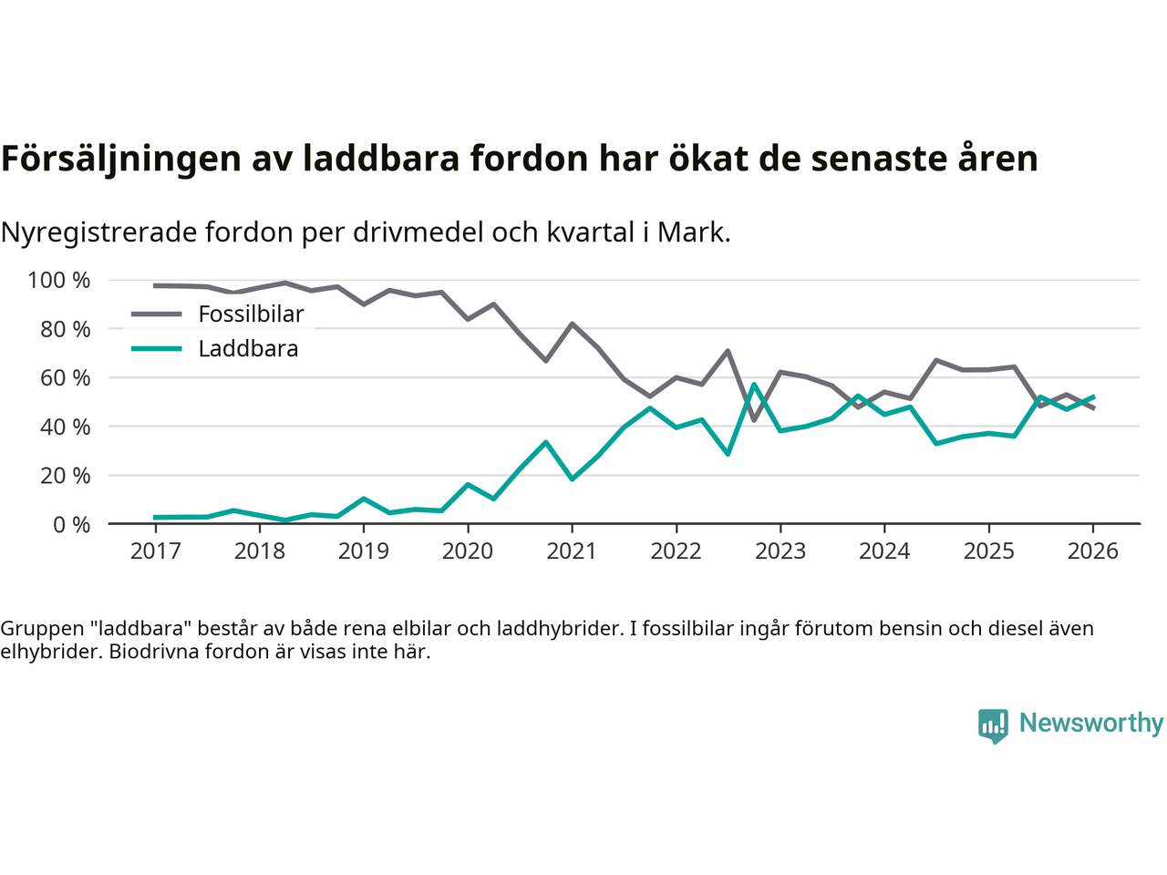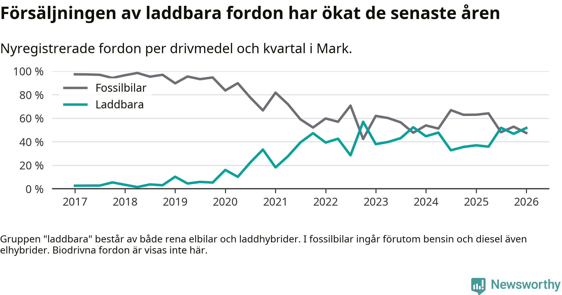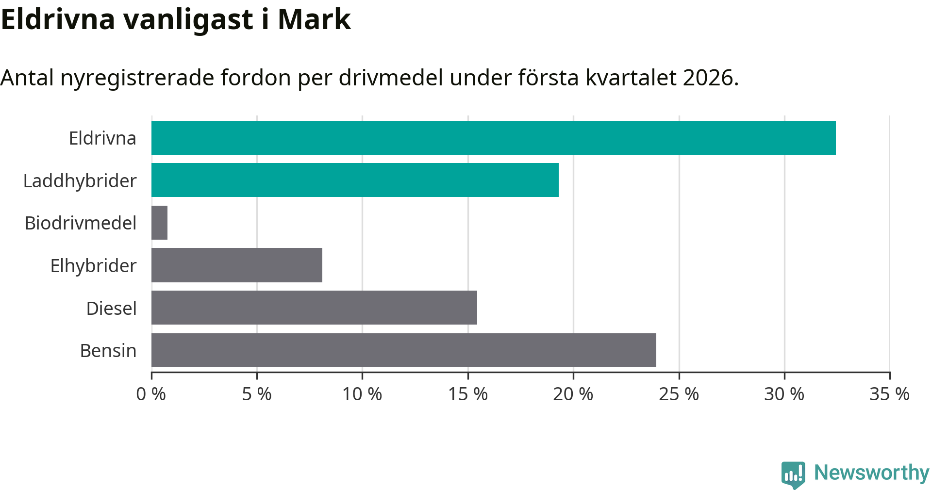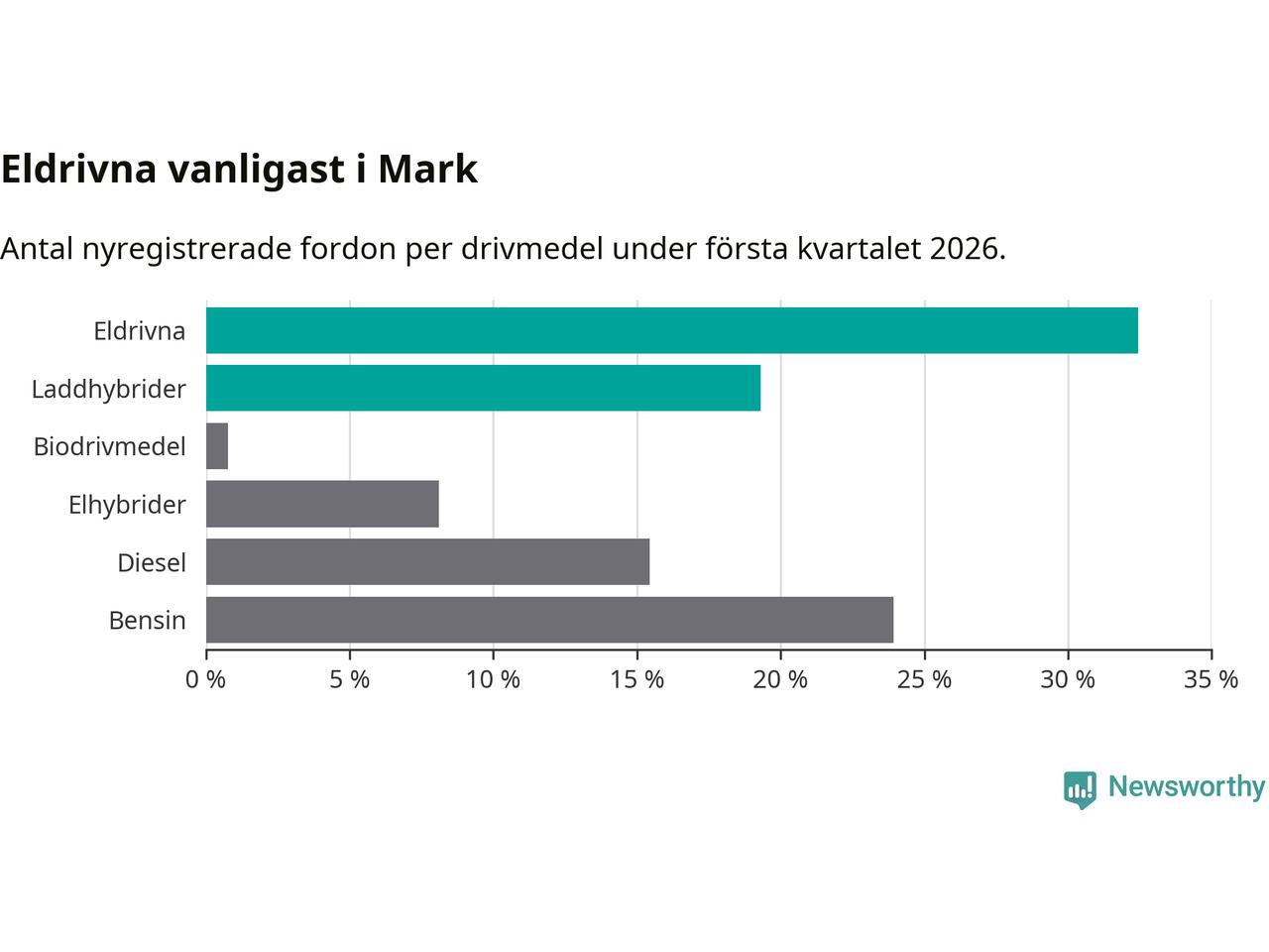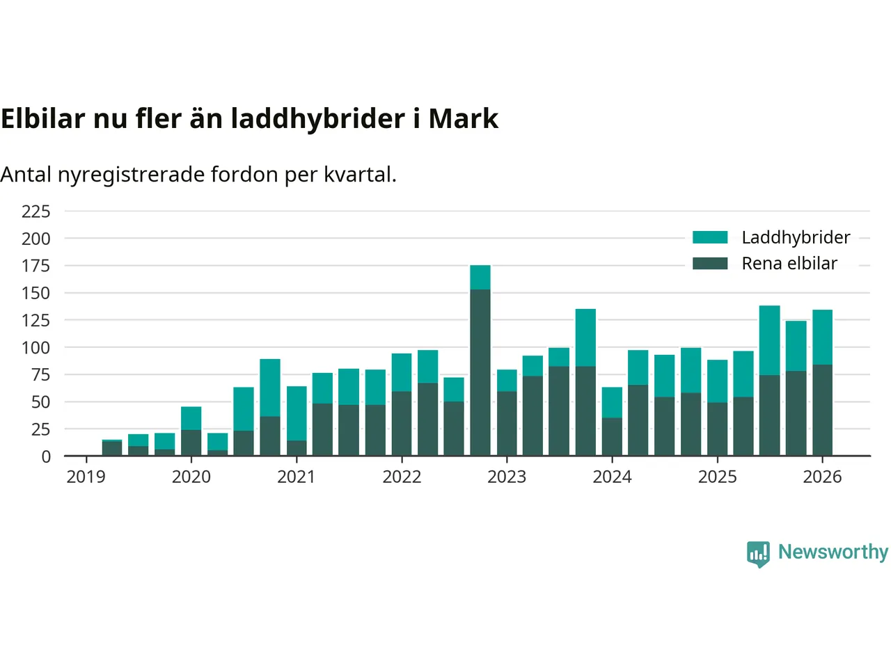 Under första kvartalet 2026 var 52 procent av alla nyregistrerade personbilar i Mark laddbara (sammanlagt registrerades 259 nya bilar). Merparten av de laddbara bilarna var rena elbilar (32 procent av alla).