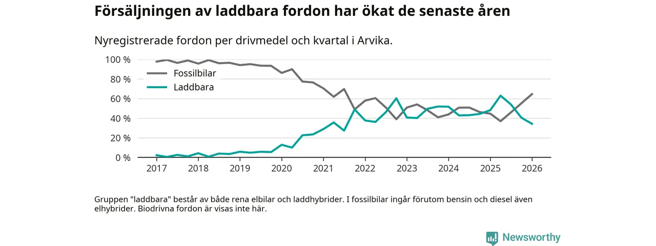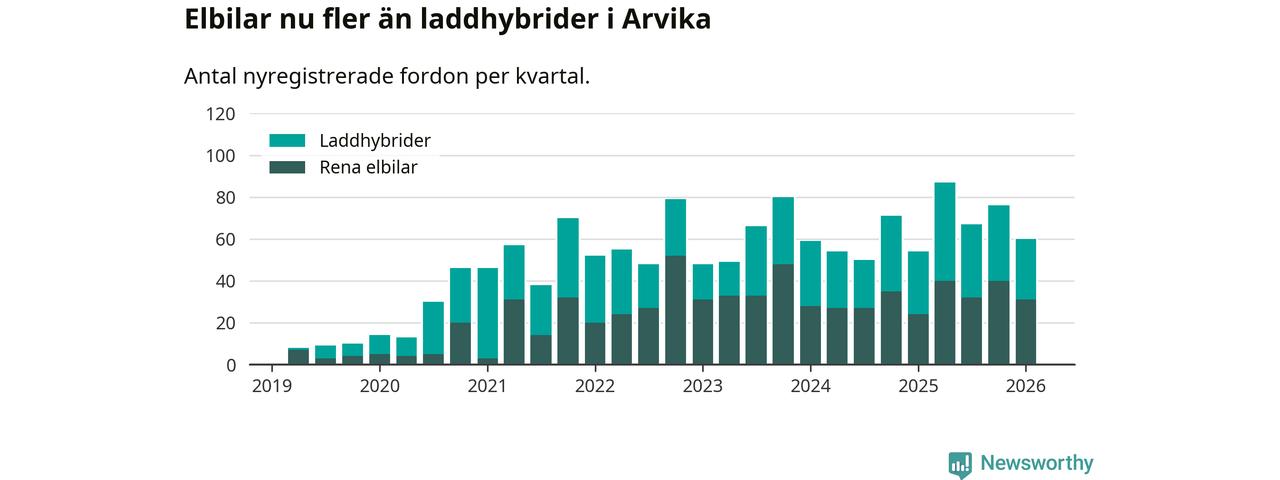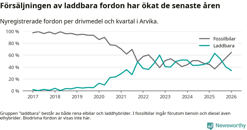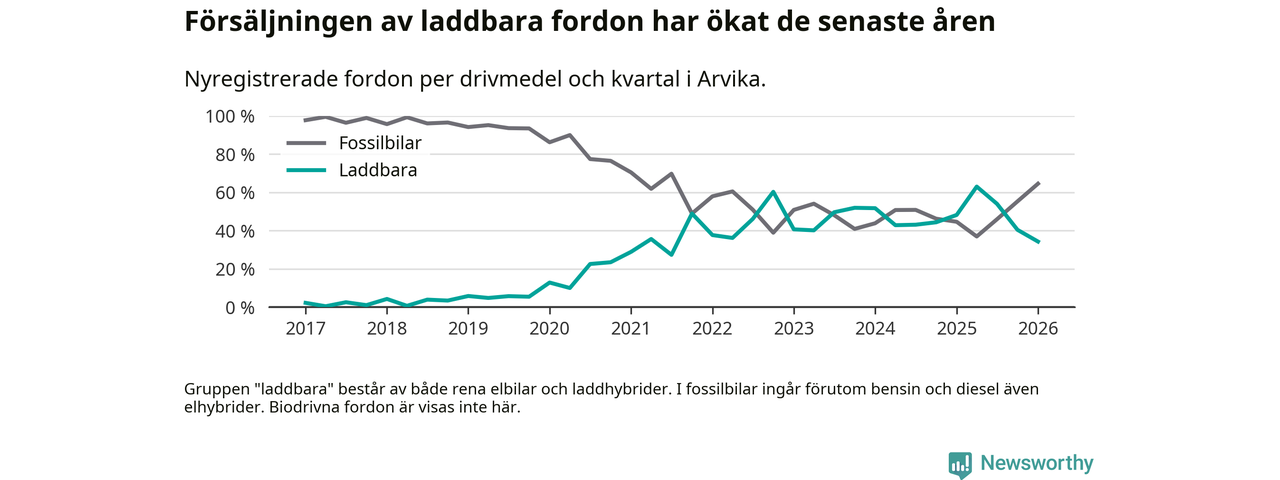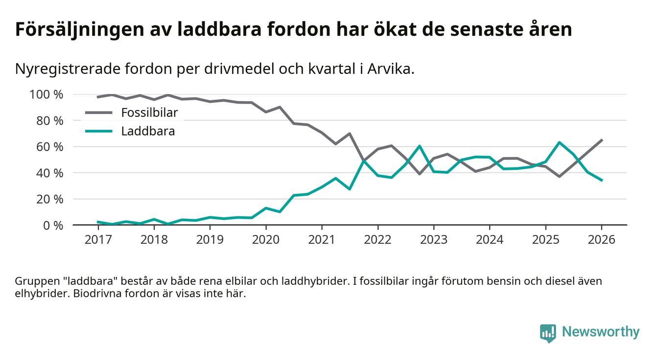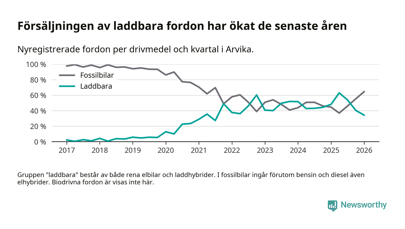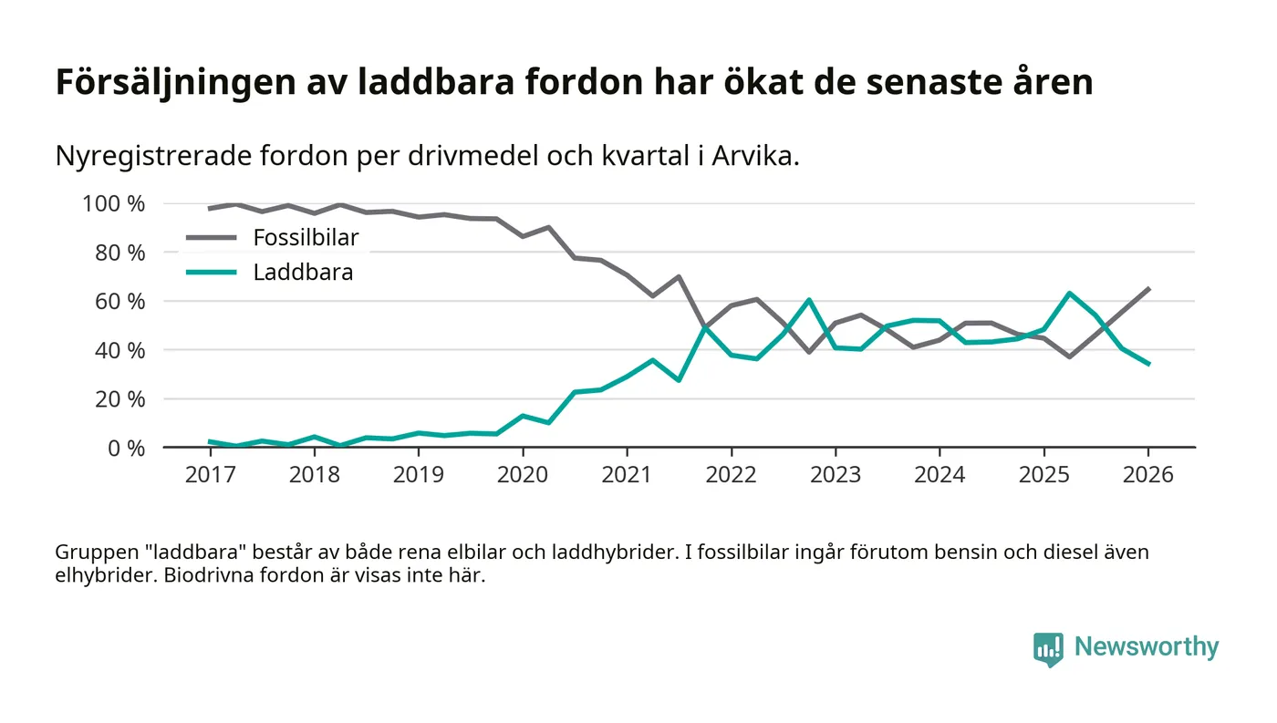 Under första kvartalet 2026 var 34 procent av alla nyregistrerade personbilar i Arvika laddbara (sammanlagt registrerades 175 nya bilar). Merparten av de laddbara bilarna var rena elbilar (18 procent av alla).