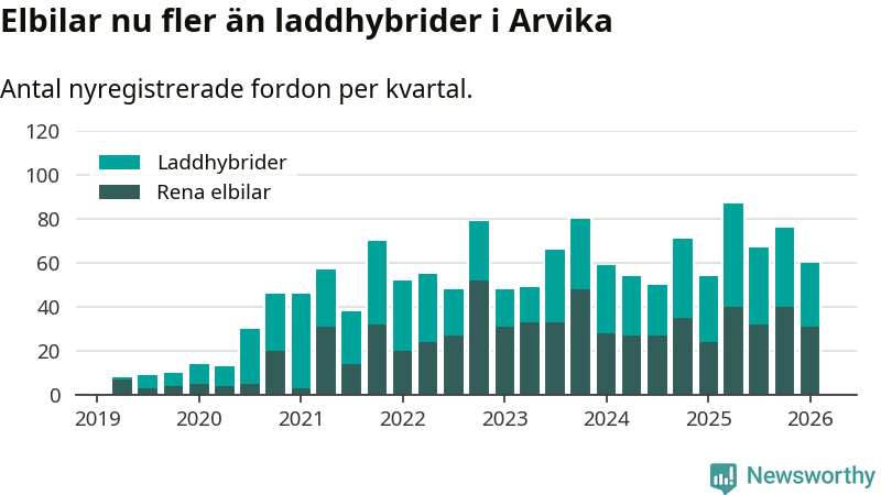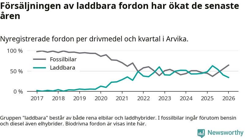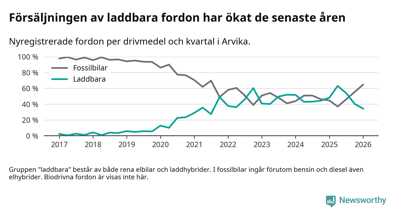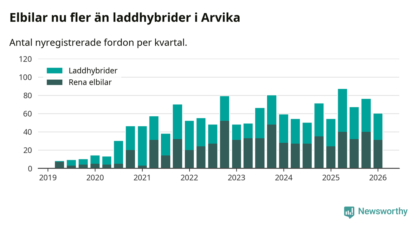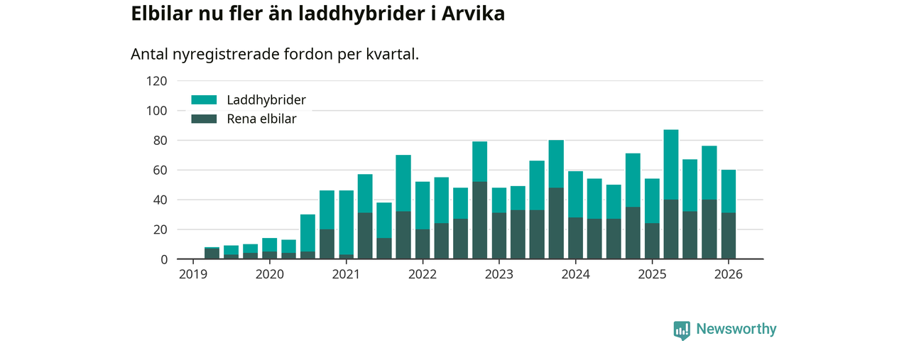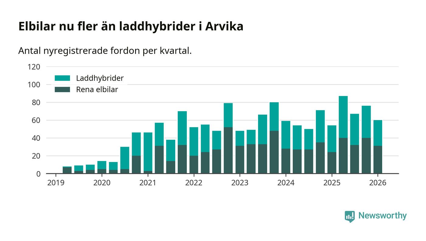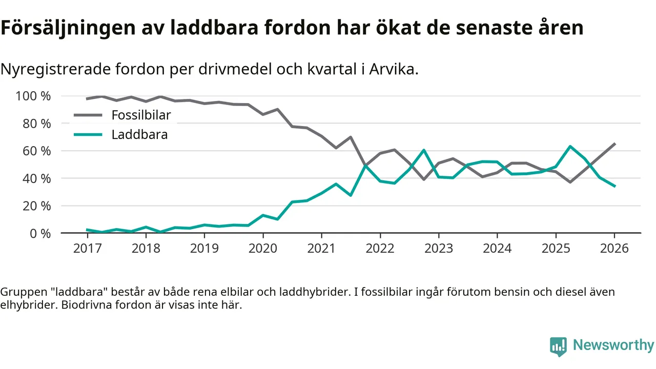 Under första kvartalet 2026 var 34 procent av alla nyregistrerade personbilar i Arvika laddbara (sammanlagt registrerades 175 nya bilar). Merparten av de laddbara bilarna var rena elbilar (18 procent av alla).