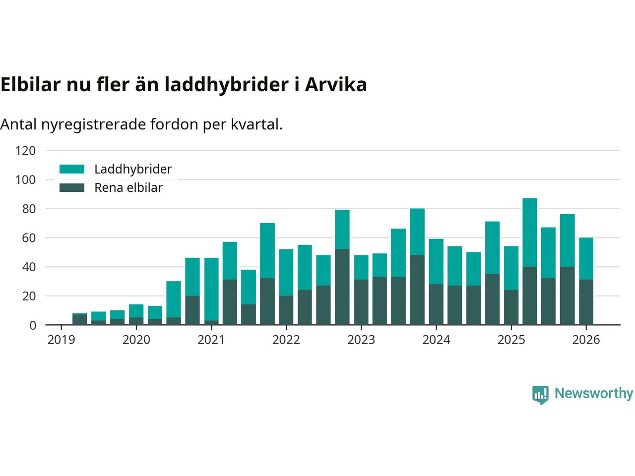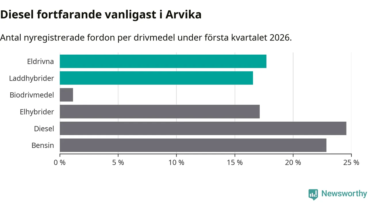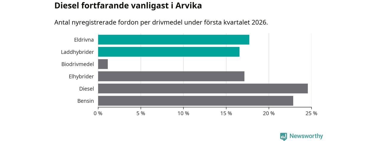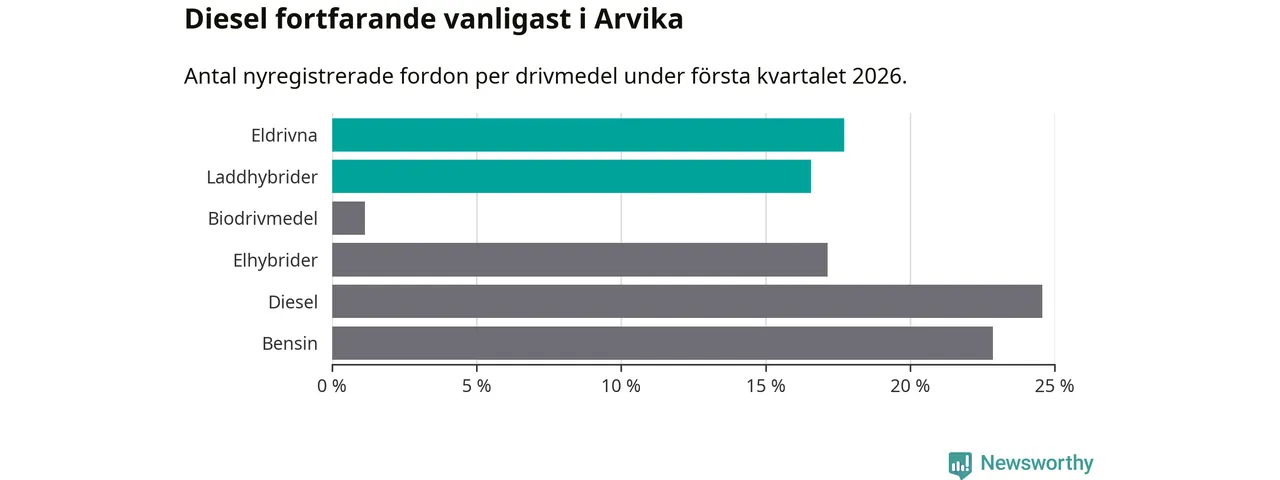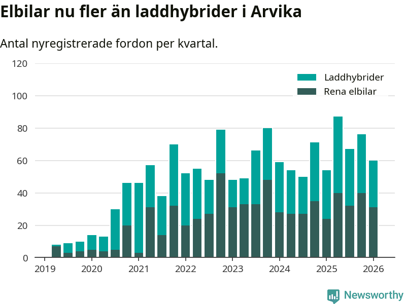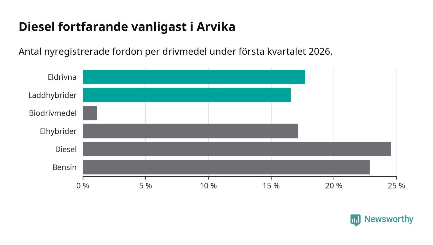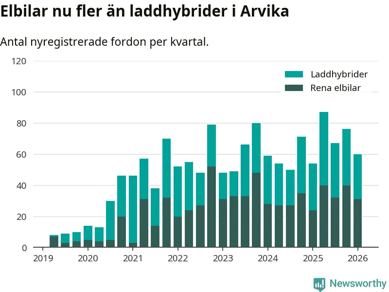 Under första kvartalet 2026 var 34 procent av alla nyregistrerade personbilar i Arvika laddbara (sammanlagt registrerades 175 nya bilar). Merparten av de laddbara bilarna var rena elbilar (18 procent av alla).